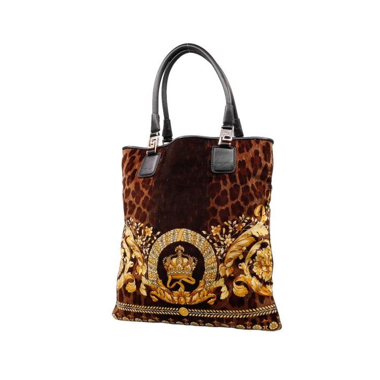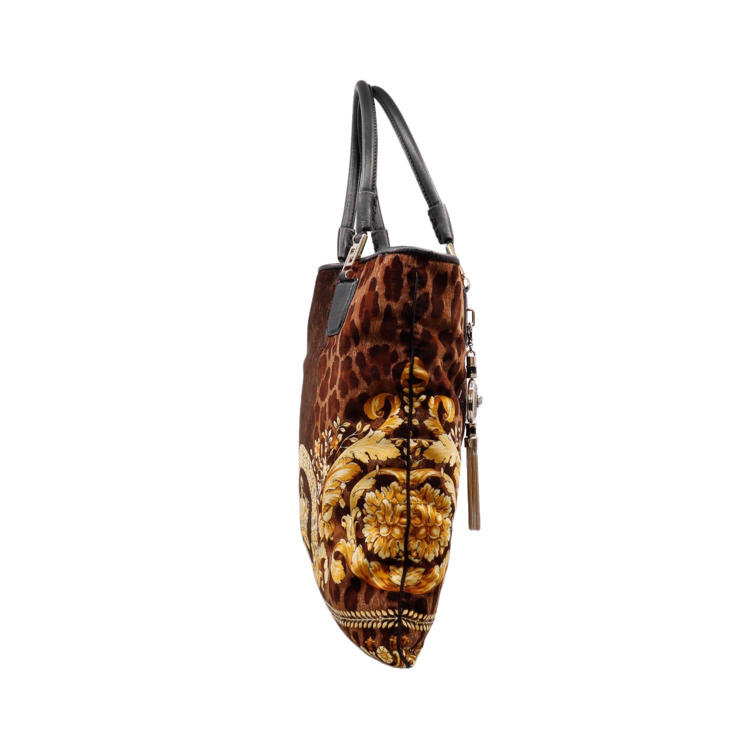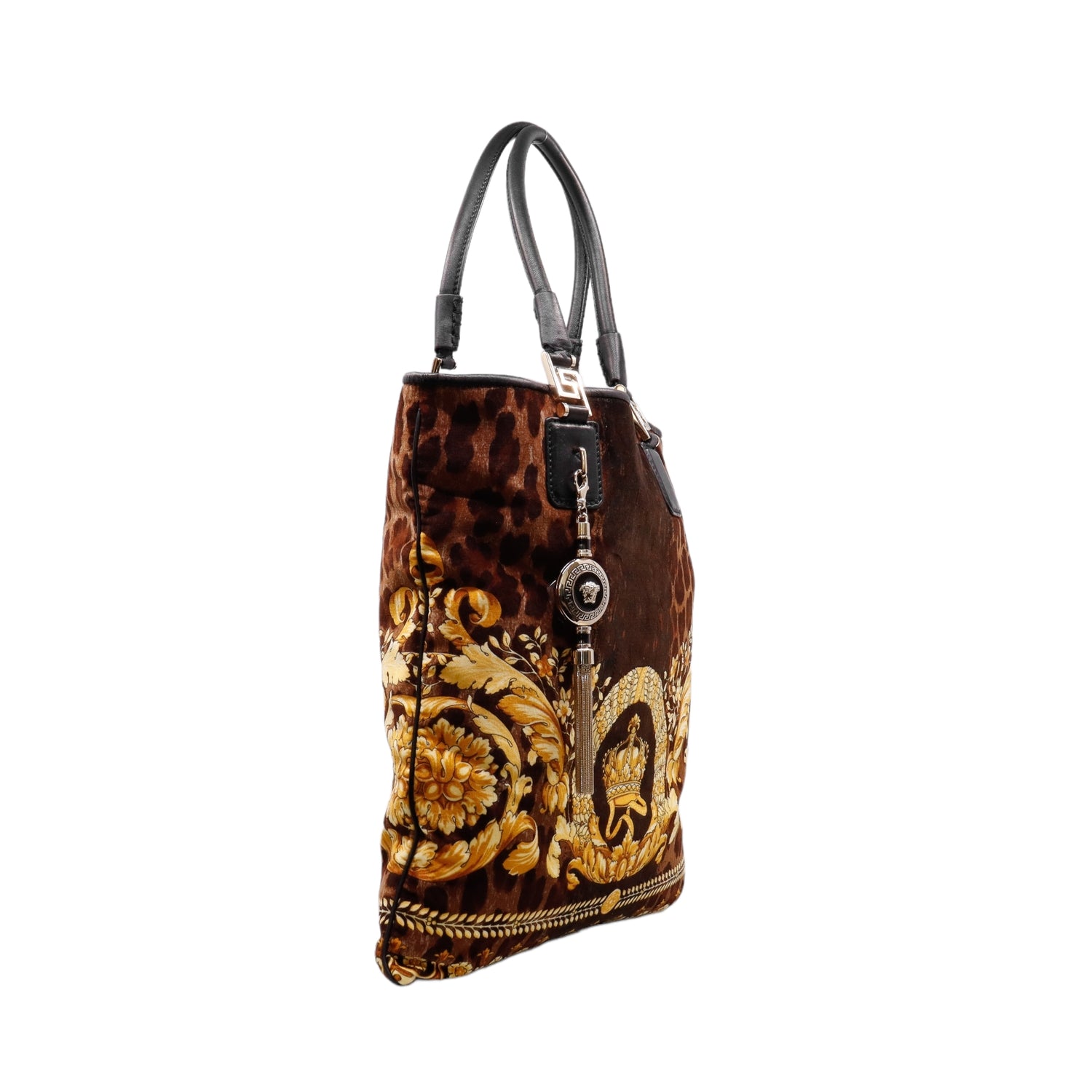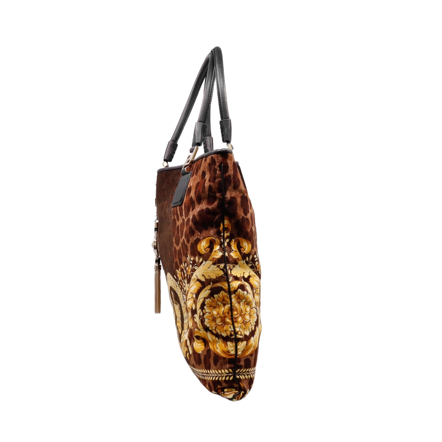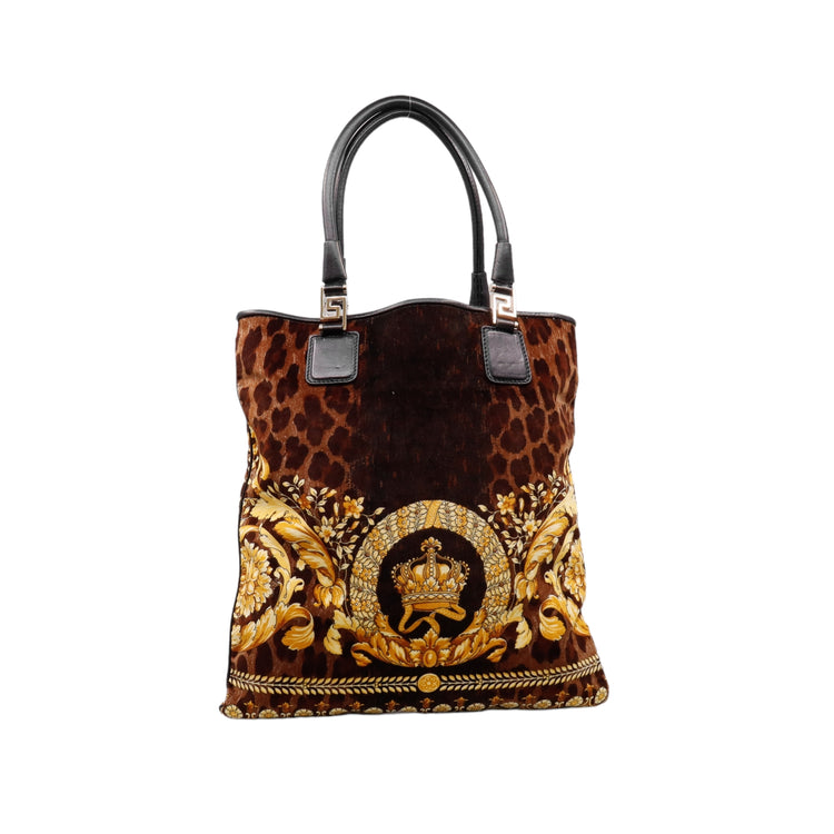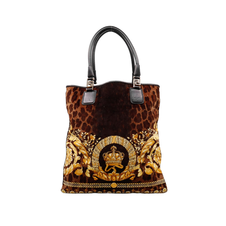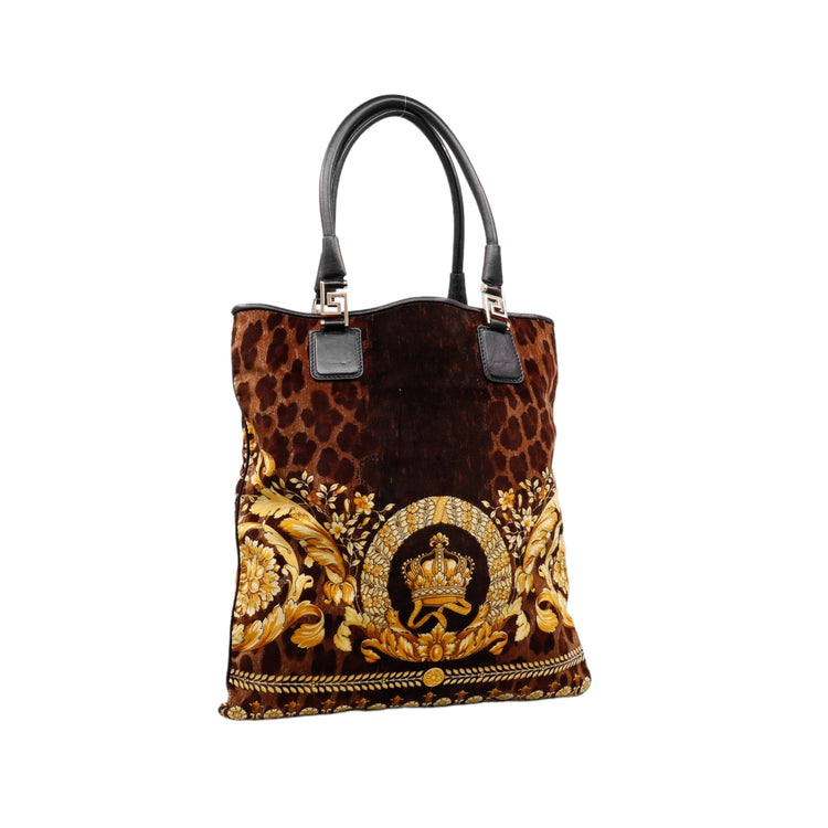 Bolsa tipo tote marca Versace de la línea Vanitas bag, confeccionada en textil aterciopelado animal print, con 2 asas de piel, cierre superior con seguro de botón magnético, con charm y herrajes en color dorado.