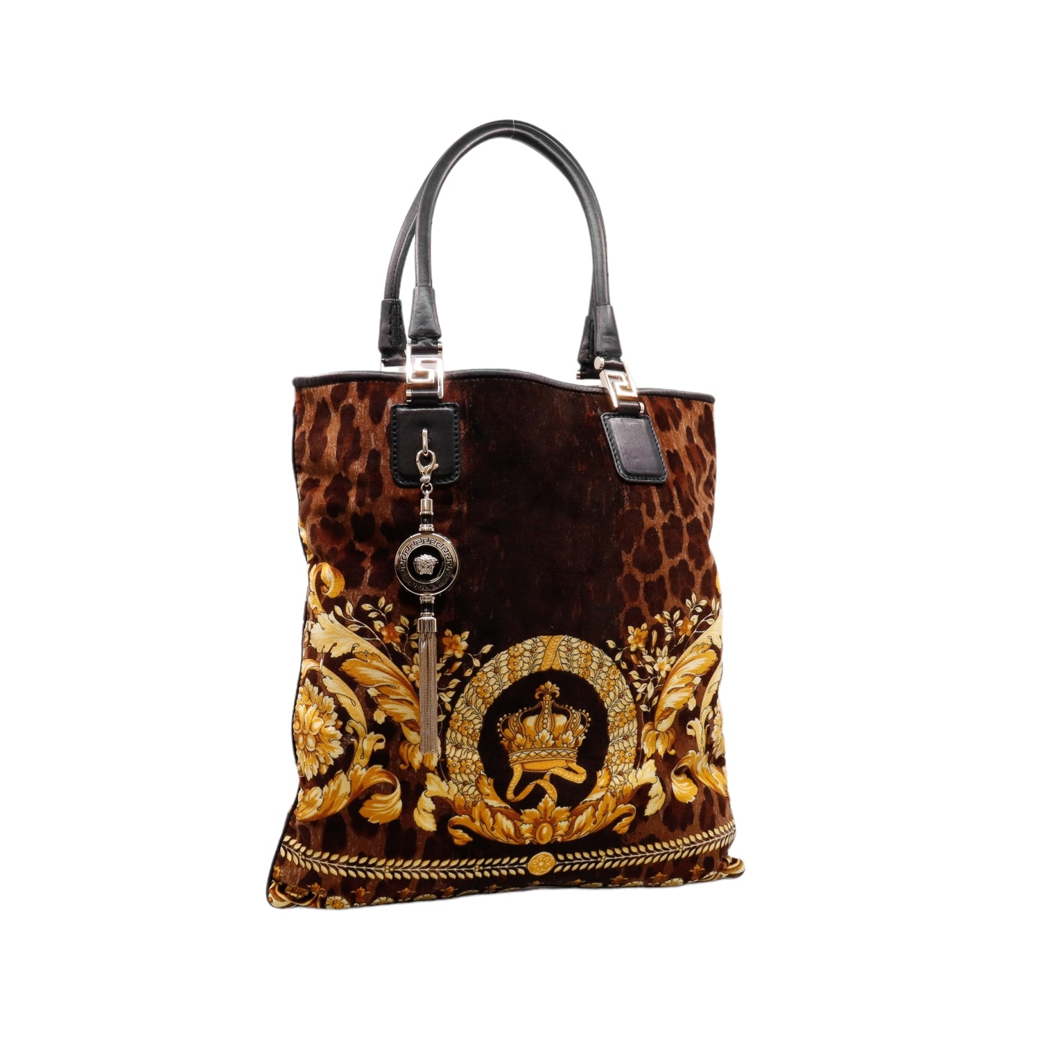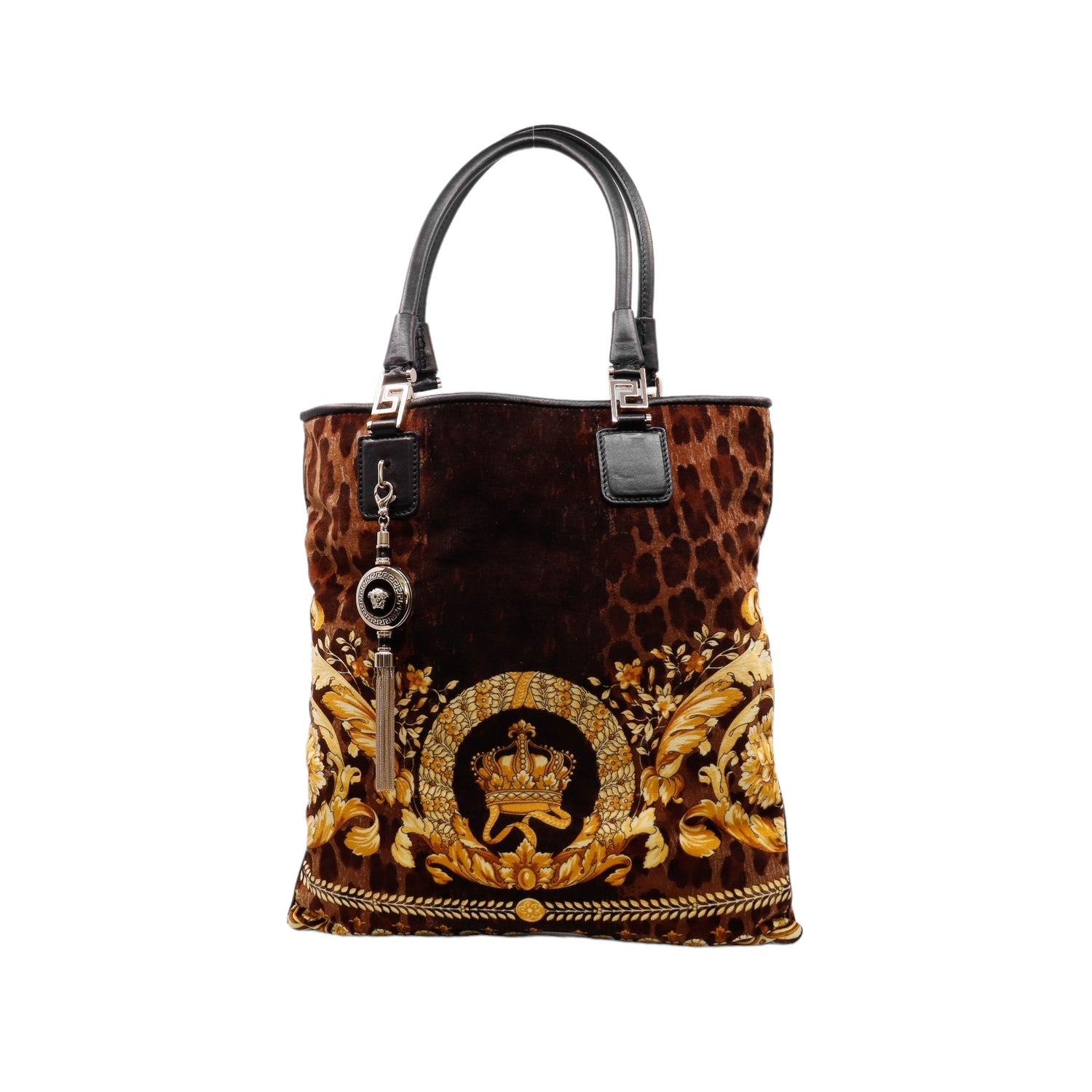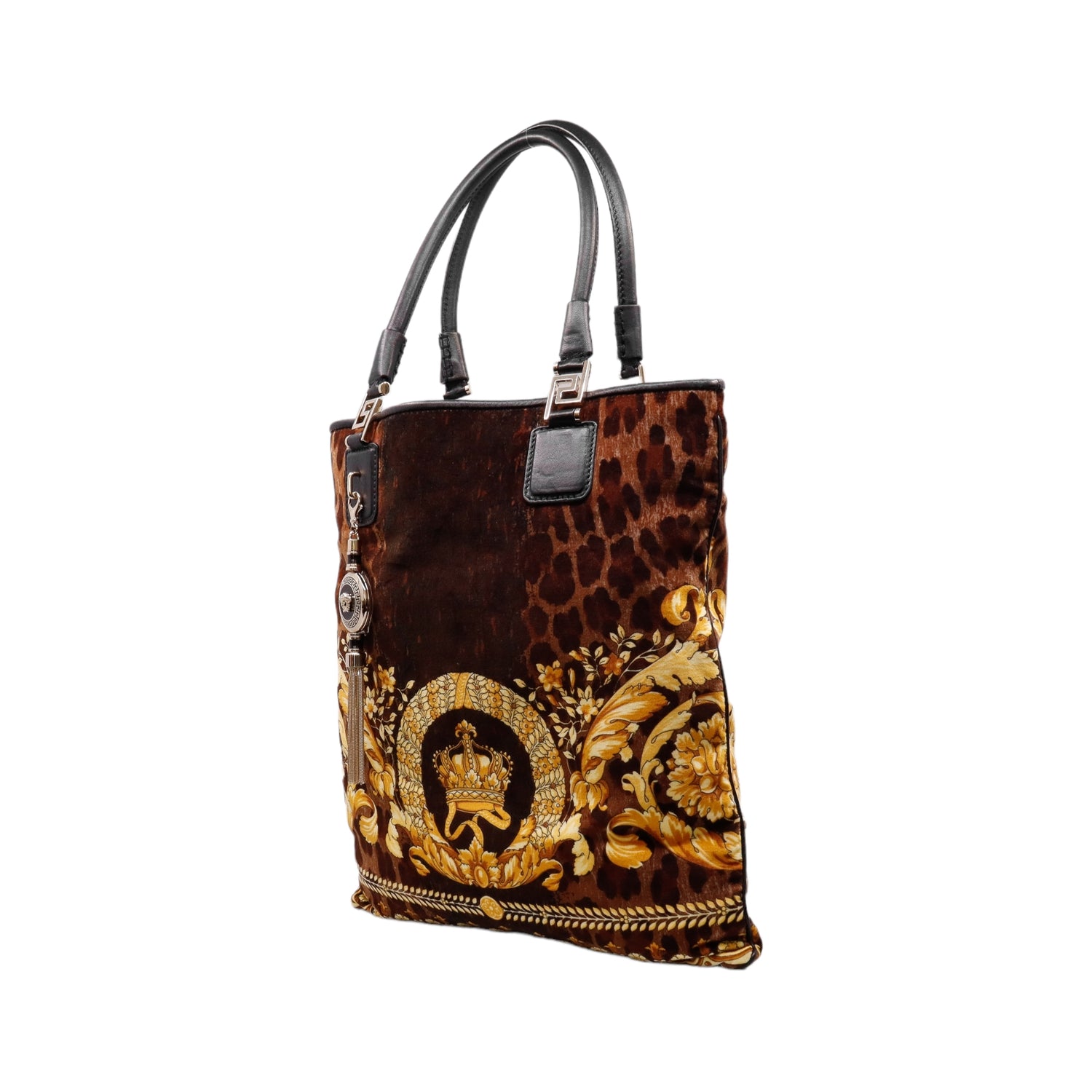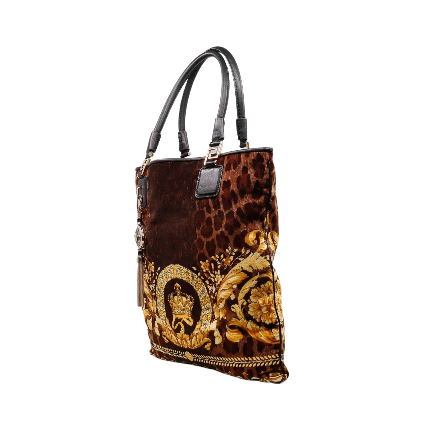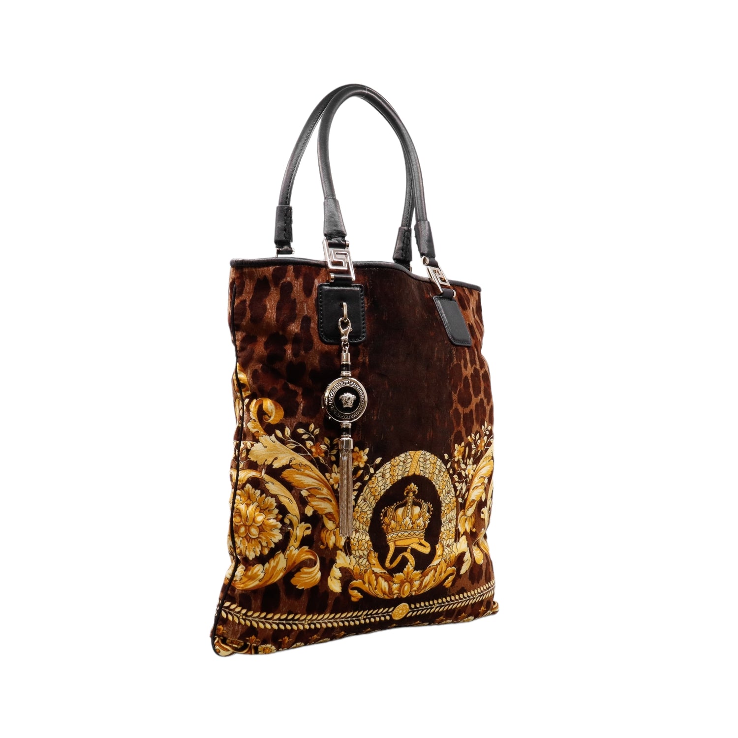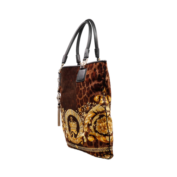Bolsa tipo tote marca Versace de la línea Vanitas bag, confeccionada en textil aterciopelado animal print, con 2 asas de piel, cierre superior con seguro de botón magnético, con charm y herrajes en color dorado.