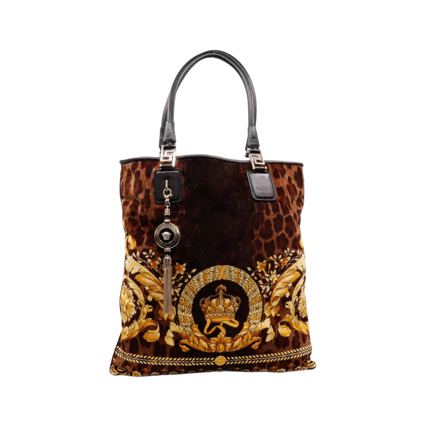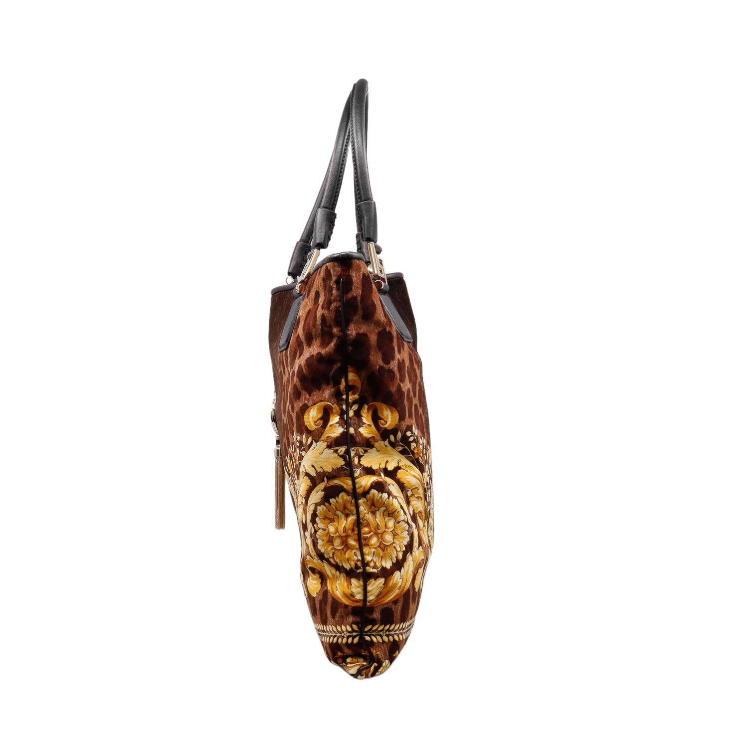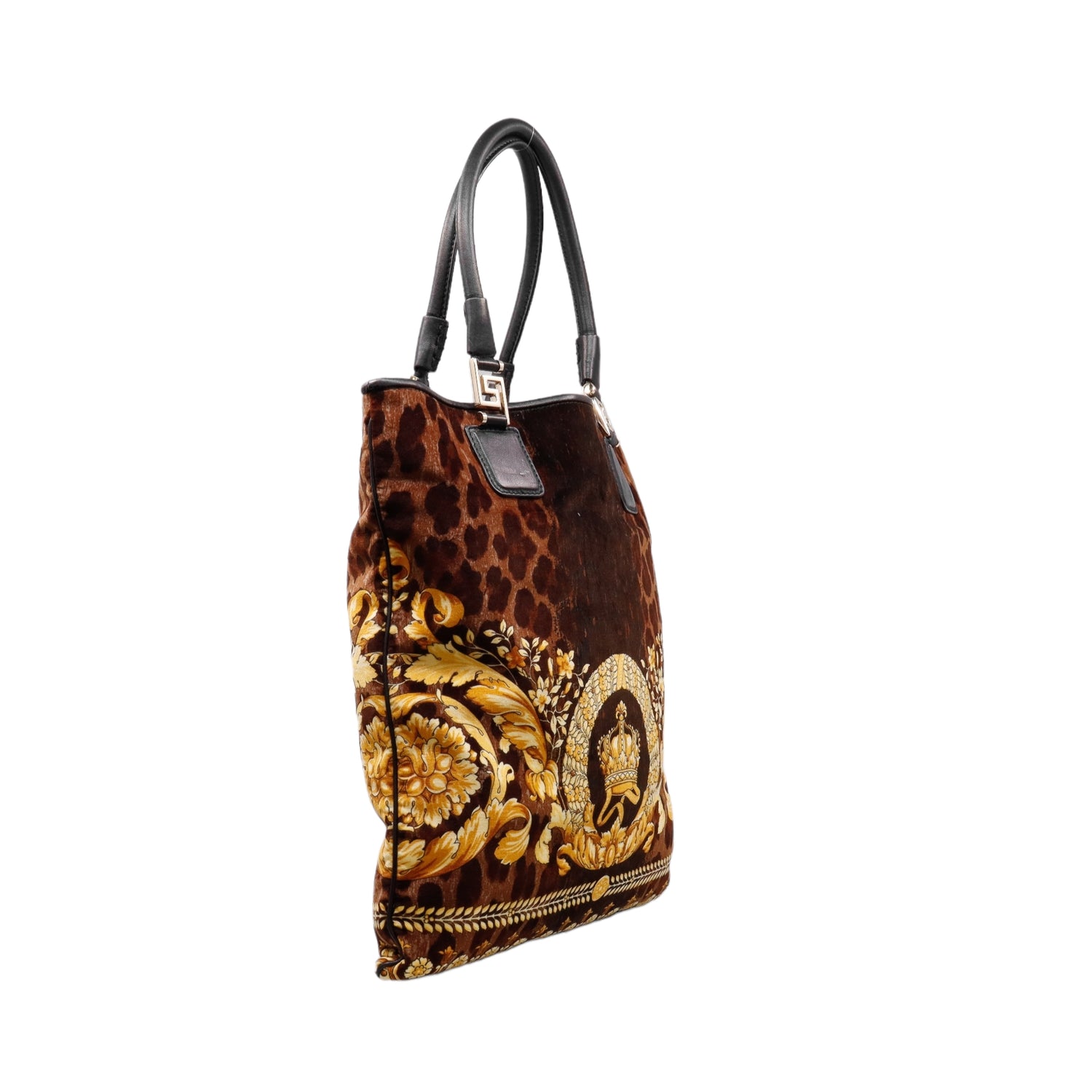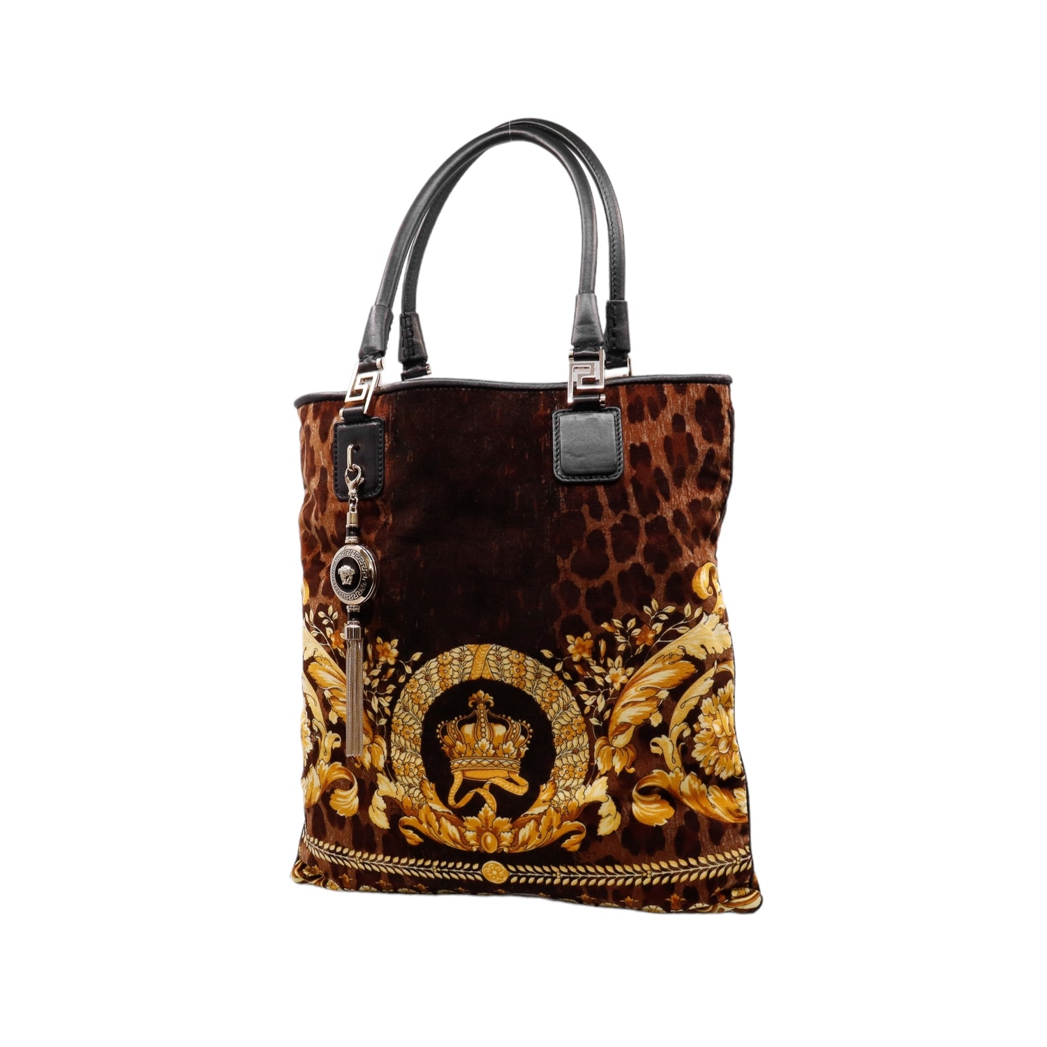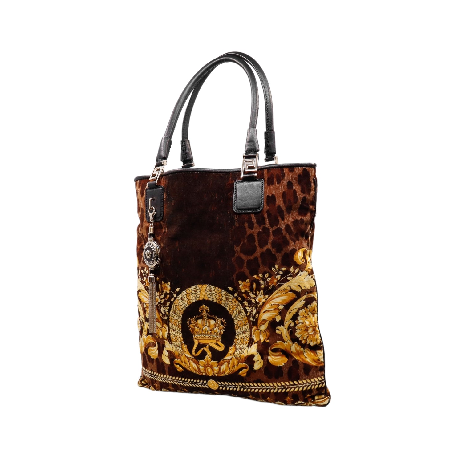 Bolsa tipo tote marca Versace de la línea Vanitas bag, confeccionada en textil aterciopelado animal print, con 2 asas de piel, cierre superior con seguro de botón magnético, con charm y herrajes en color dorado.
