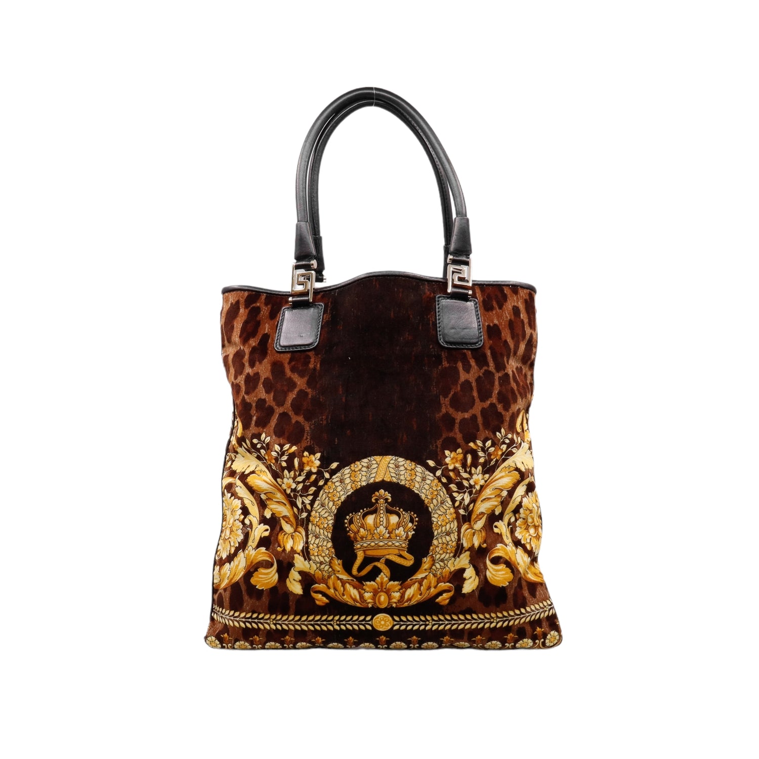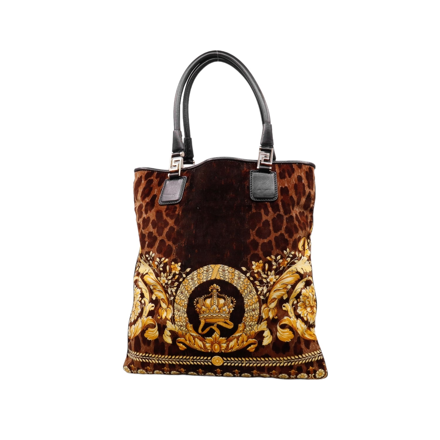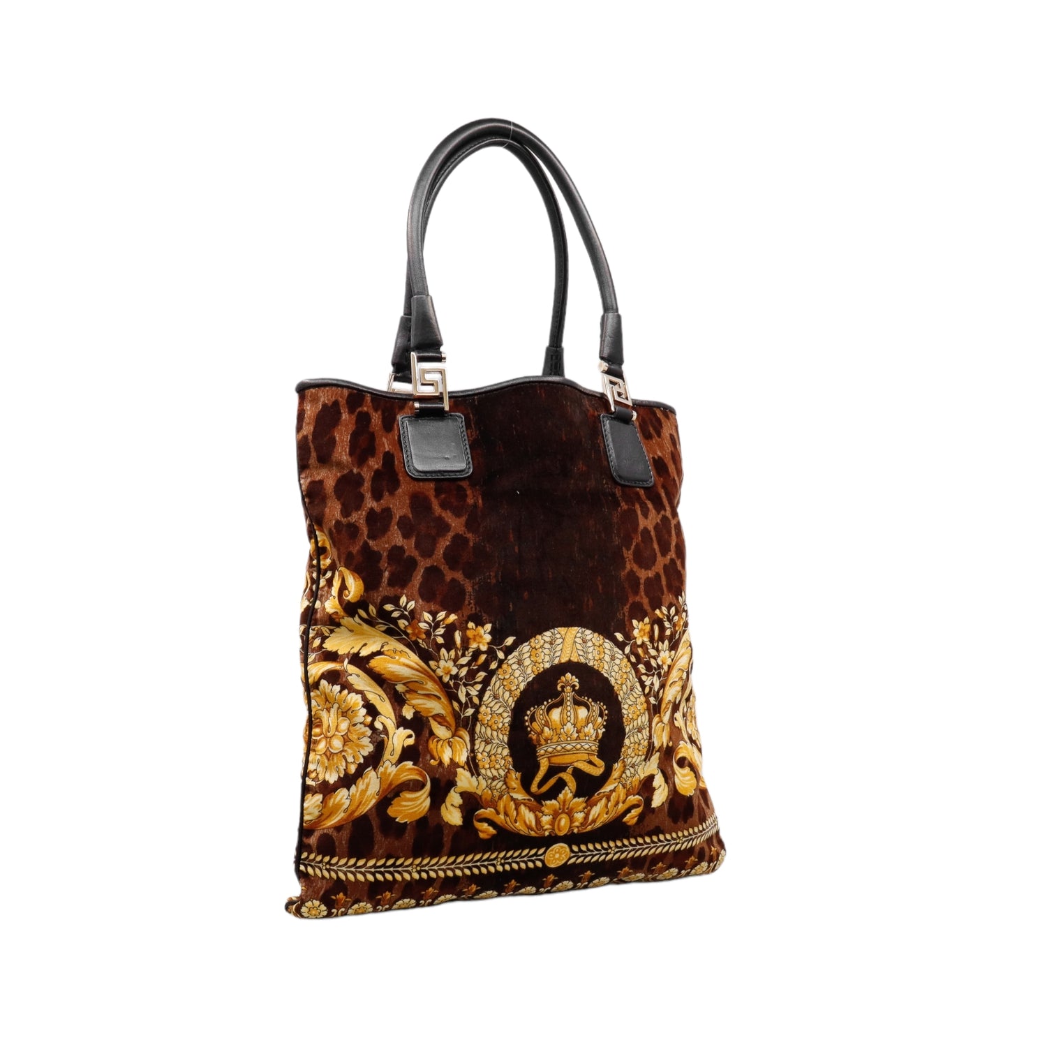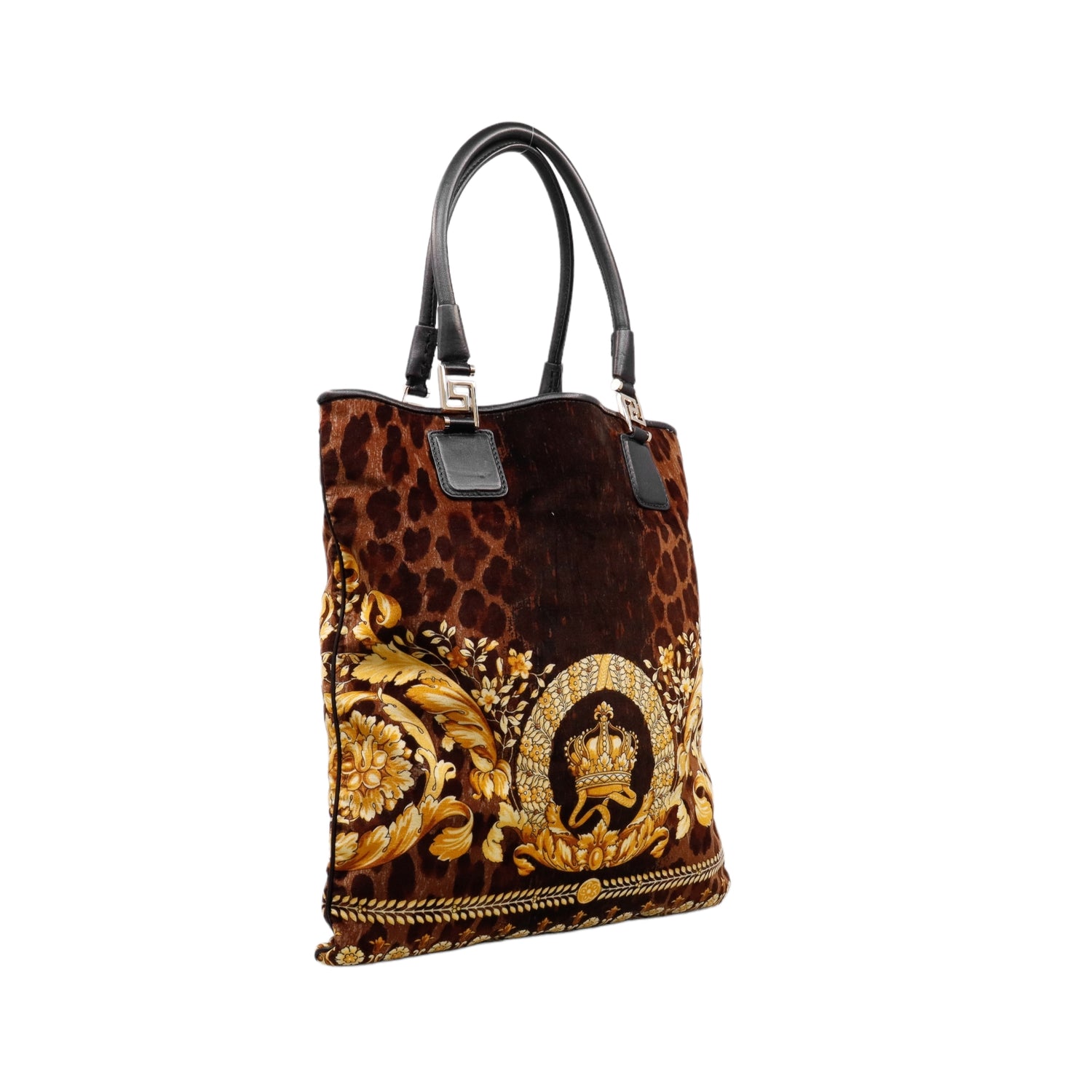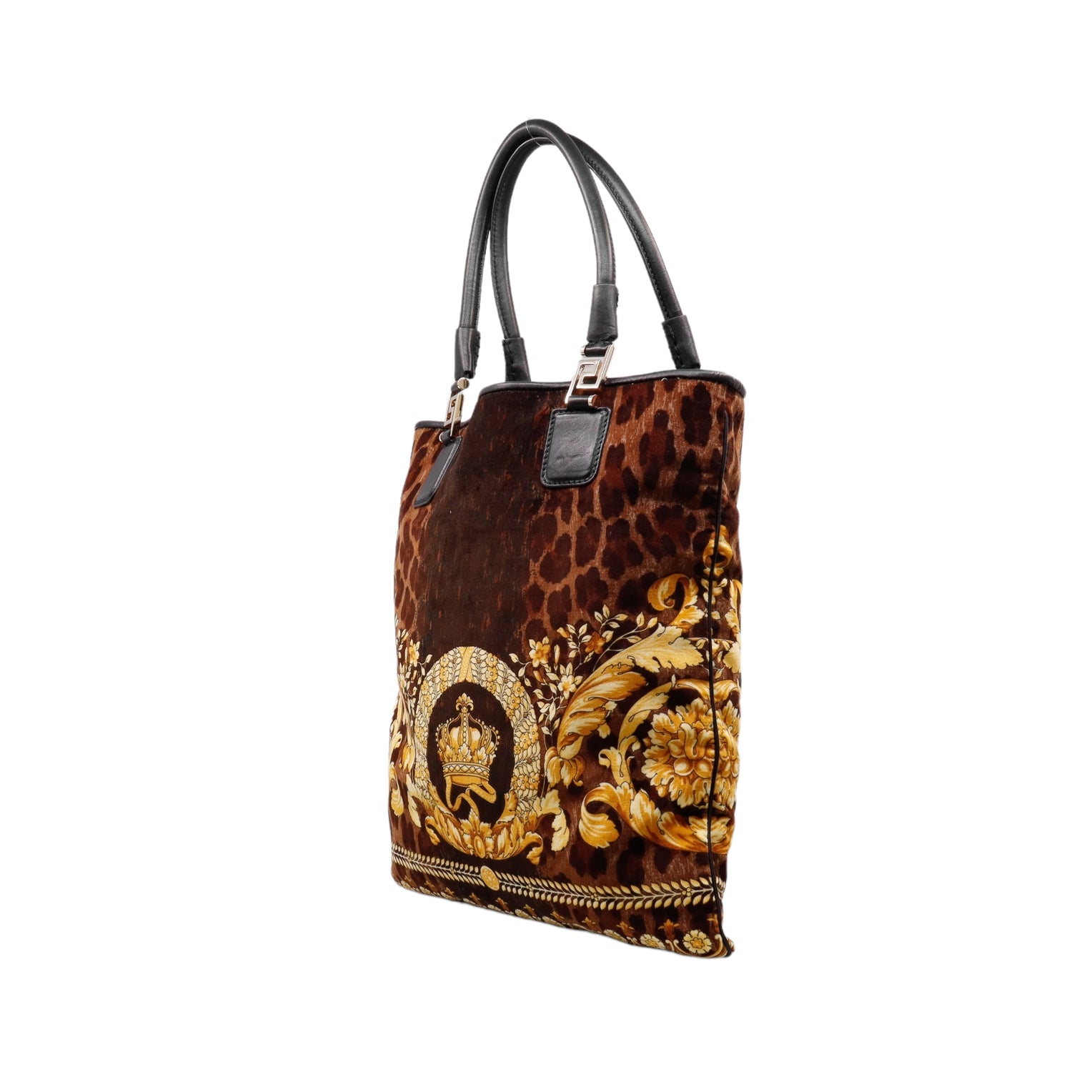 Bolsa tipo tote marca Versace de la línea Vanitas bag, confeccionada en textil aterciopelado animal print, con 2 asas de piel, cierre superior con seguro de botón magnético, con charm y herrajes en color dorado.