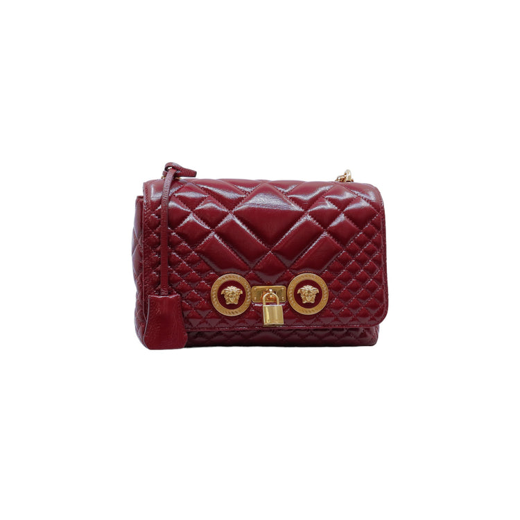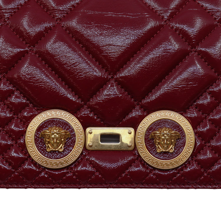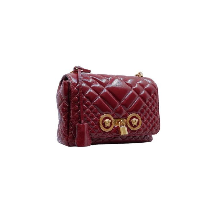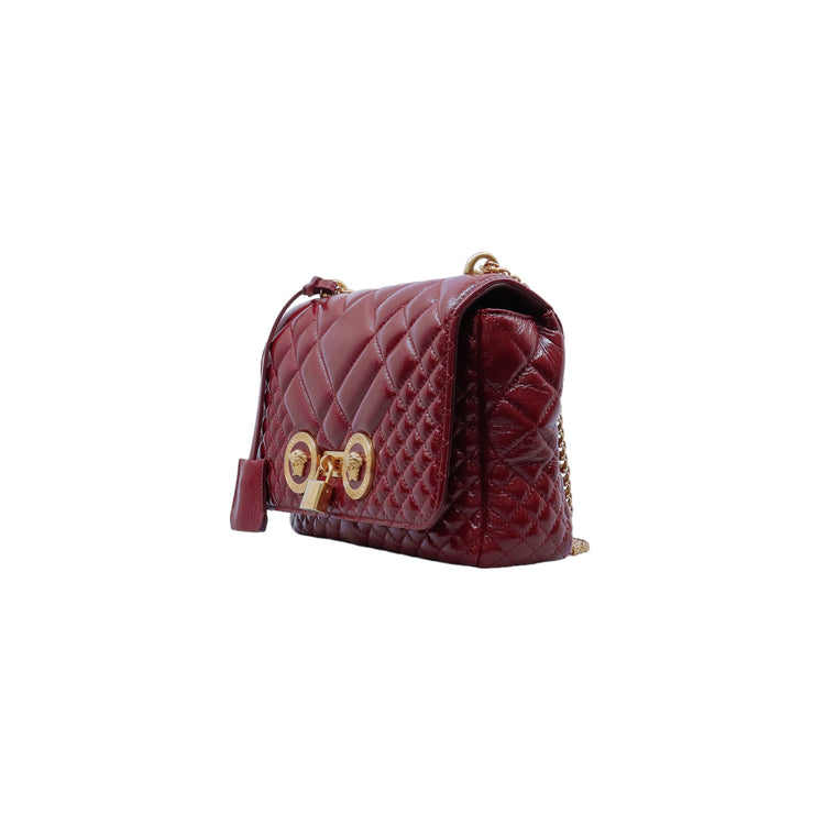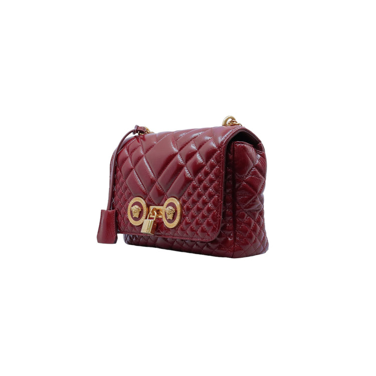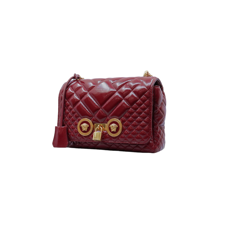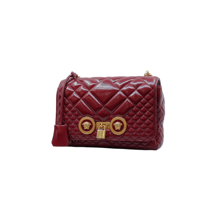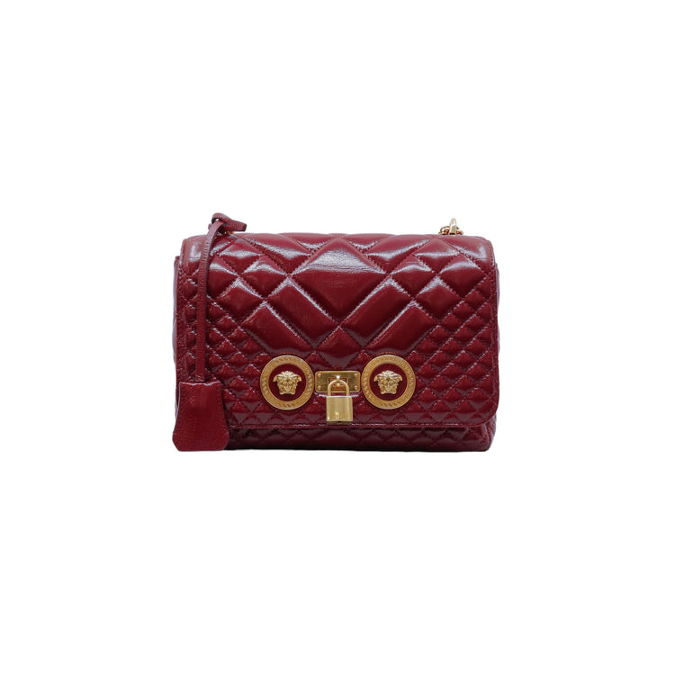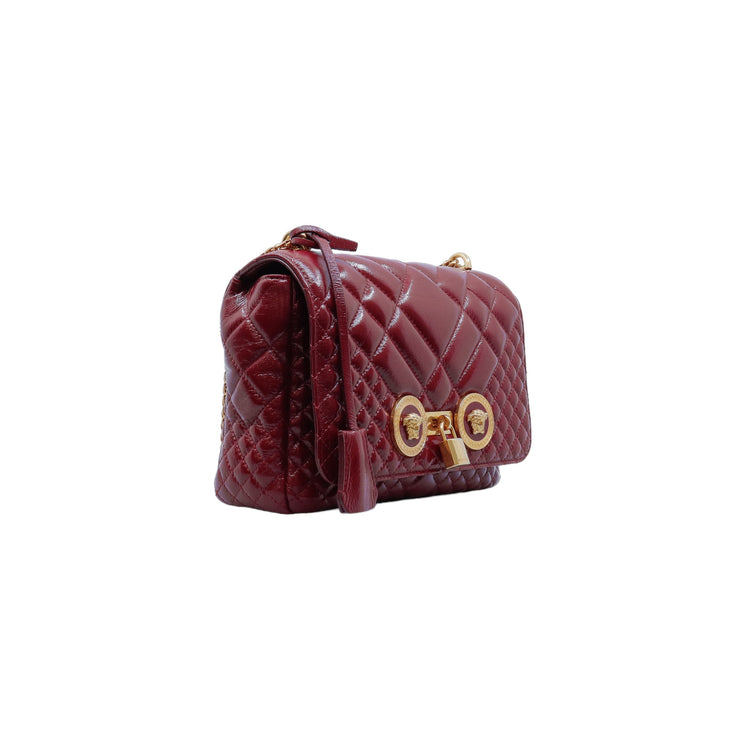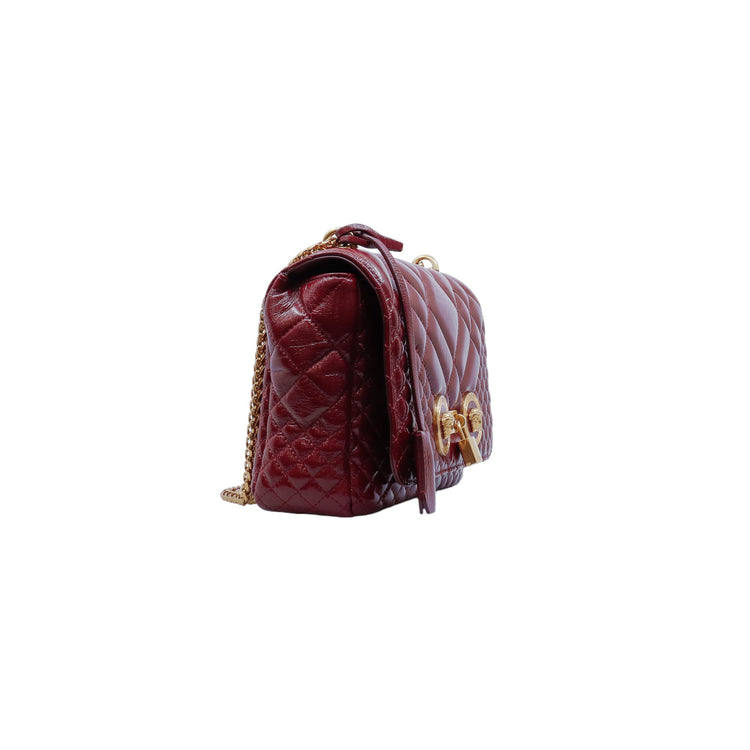 Bolso marca Versace, confeccionado en piel con acabado acolchado en color vino, herrajes de medusa y cadena en color dorado, interior en textil negro, solapa con broche giratorio y candado con poco desgaste.