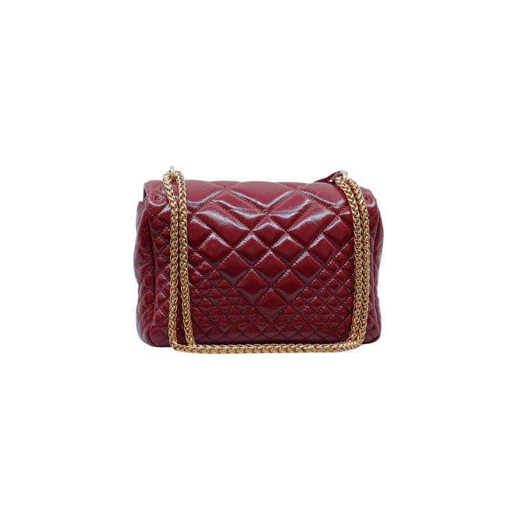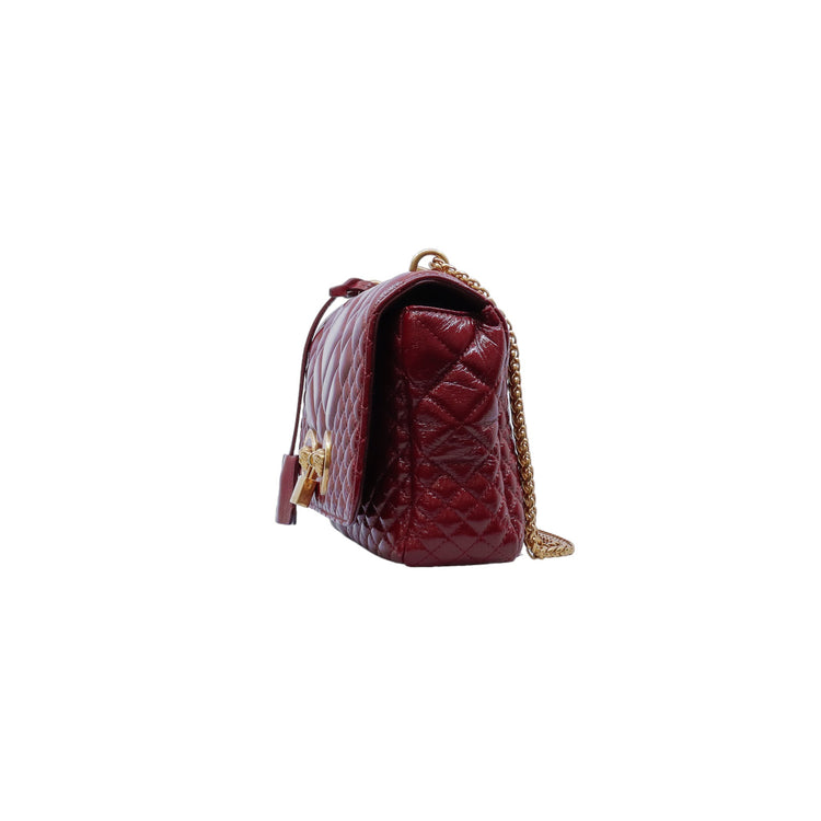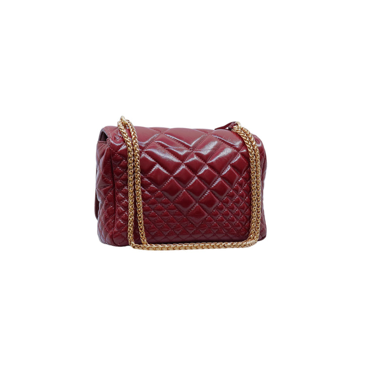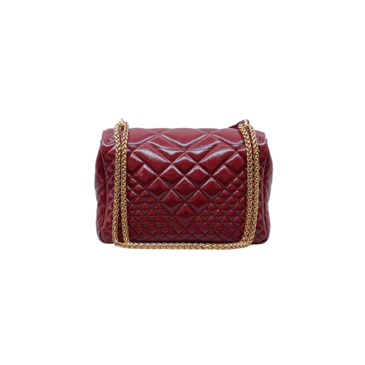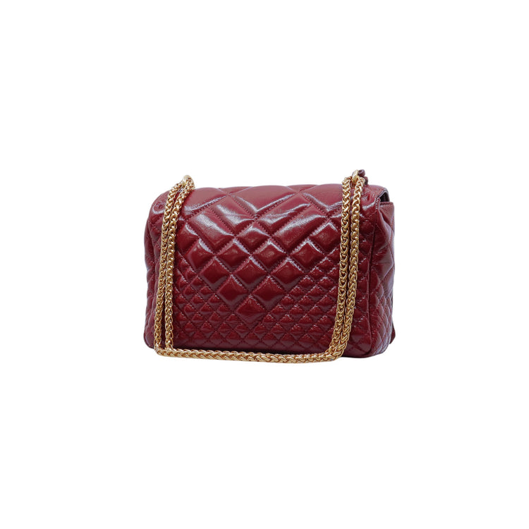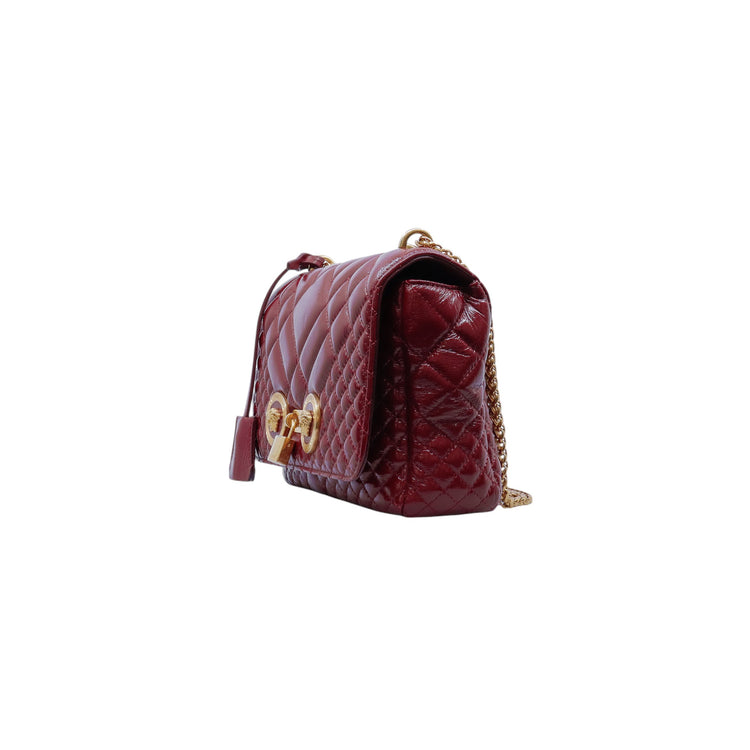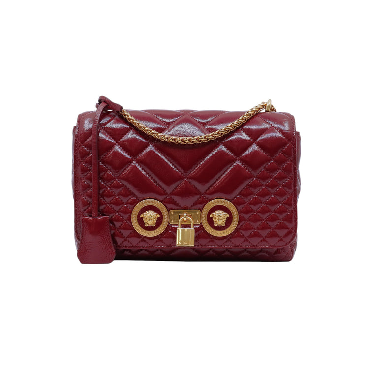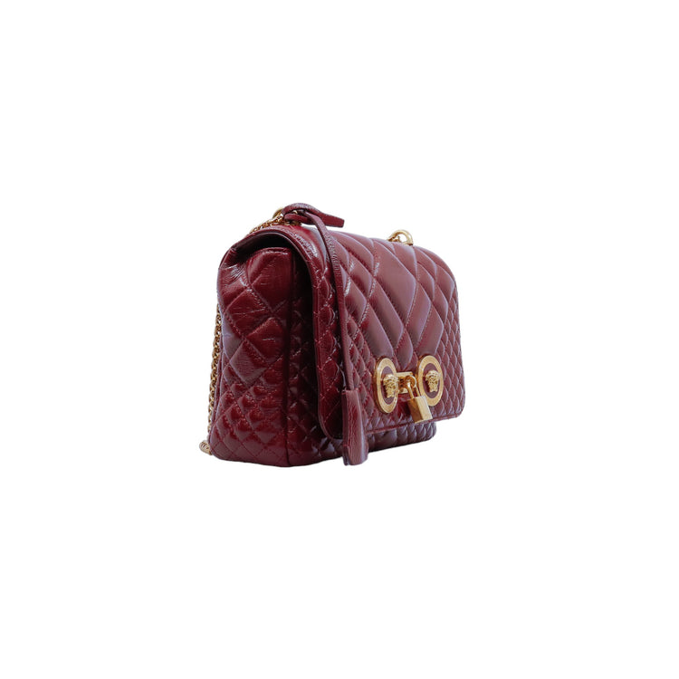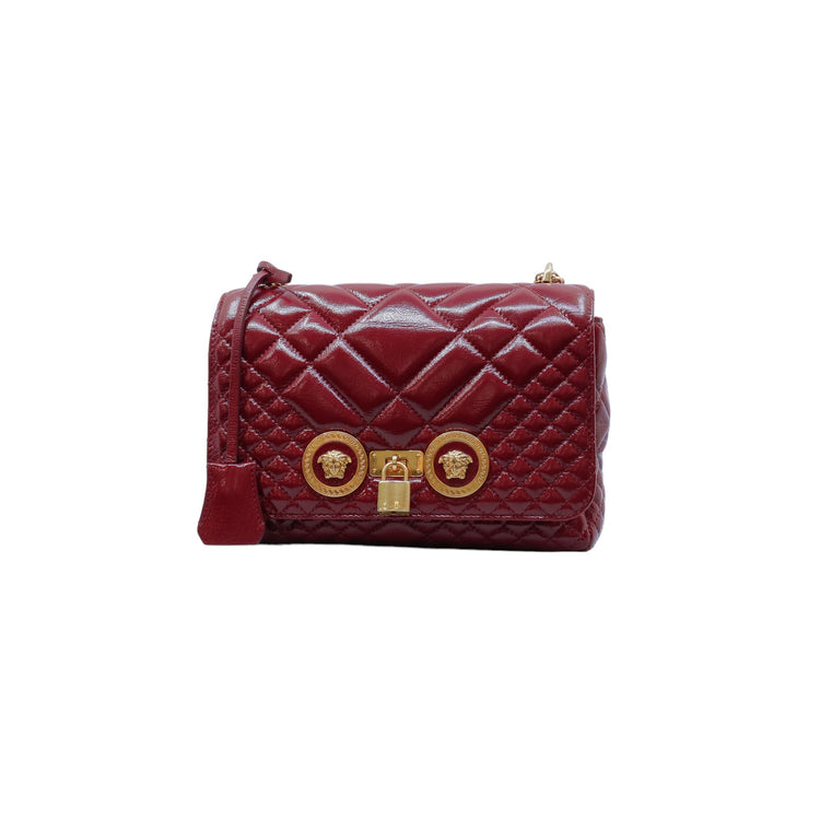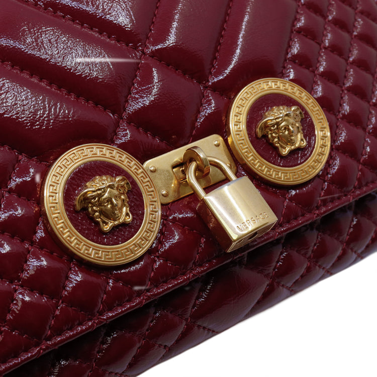 Bolso marca Versace, confeccionado en piel con acabado acolchado en color vino, herrajes de medusa y cadena en color dorado, interior en textil negro, solapa con broche giratorio y candado con poco desgaste.