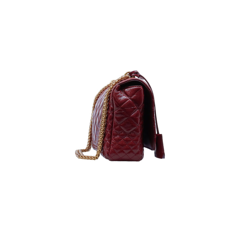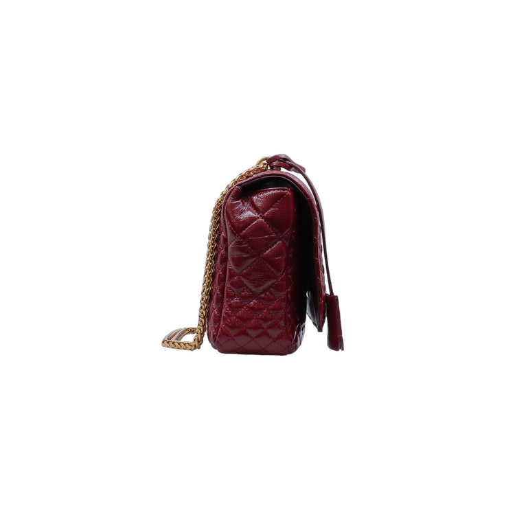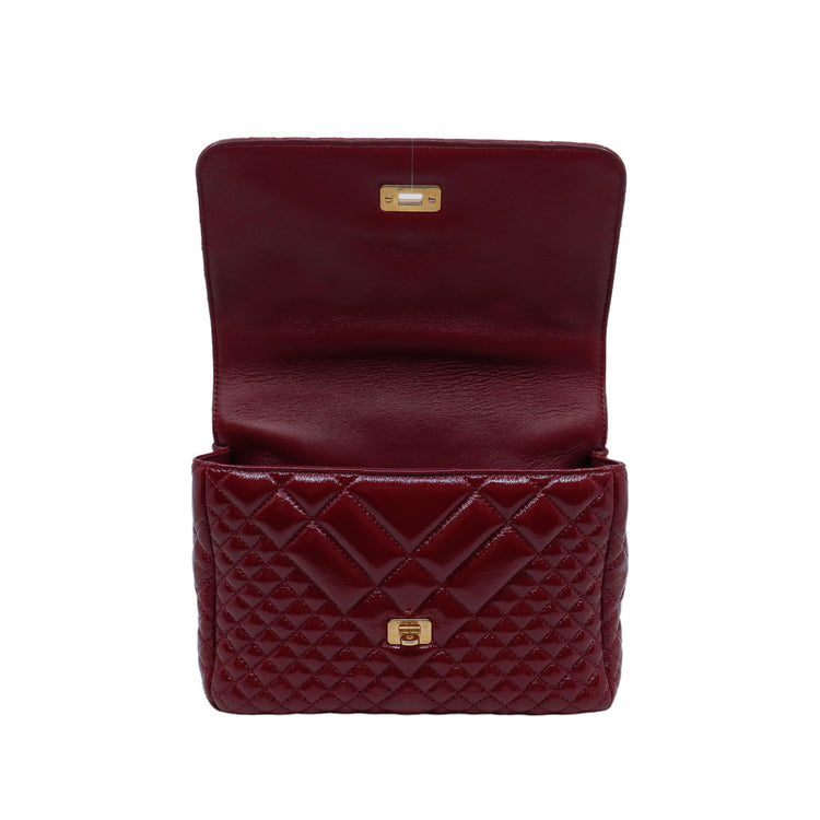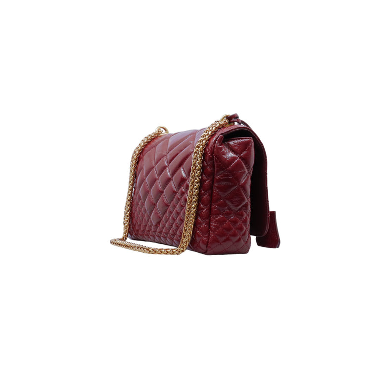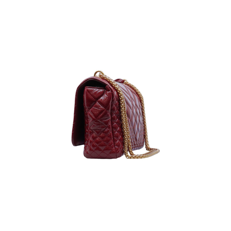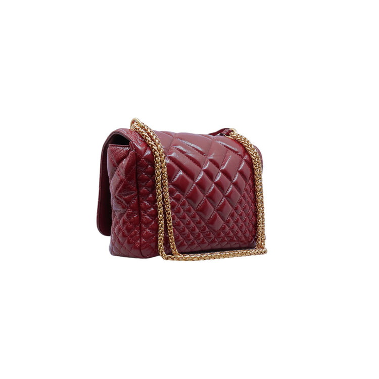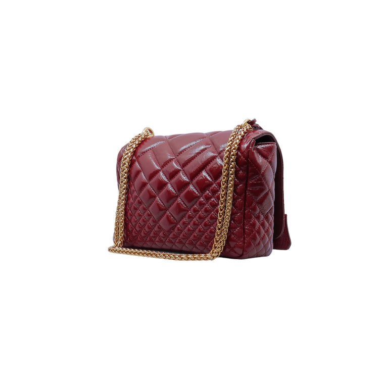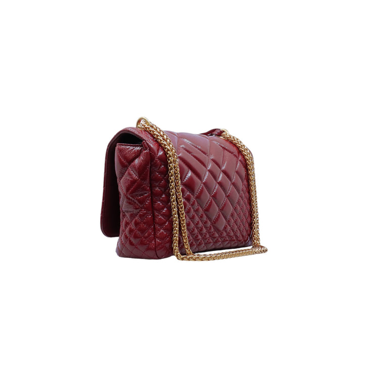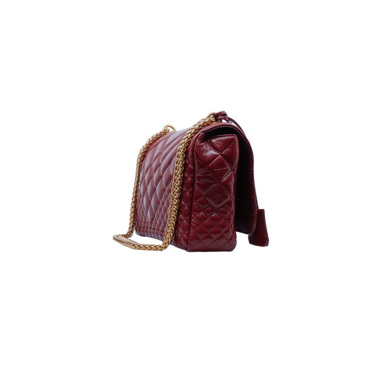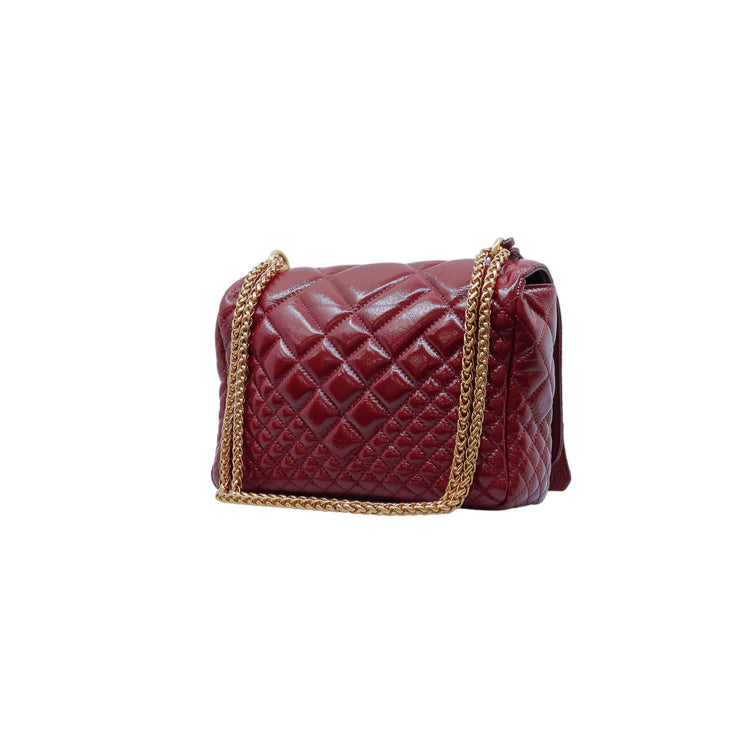 Bolso marca Versace, confeccionado en piel con acabado acolchado en color vino, herrajes de medusa y cadena en color dorado, interior en textil negro, solapa con broche giratorio y candado con poco desgaste.