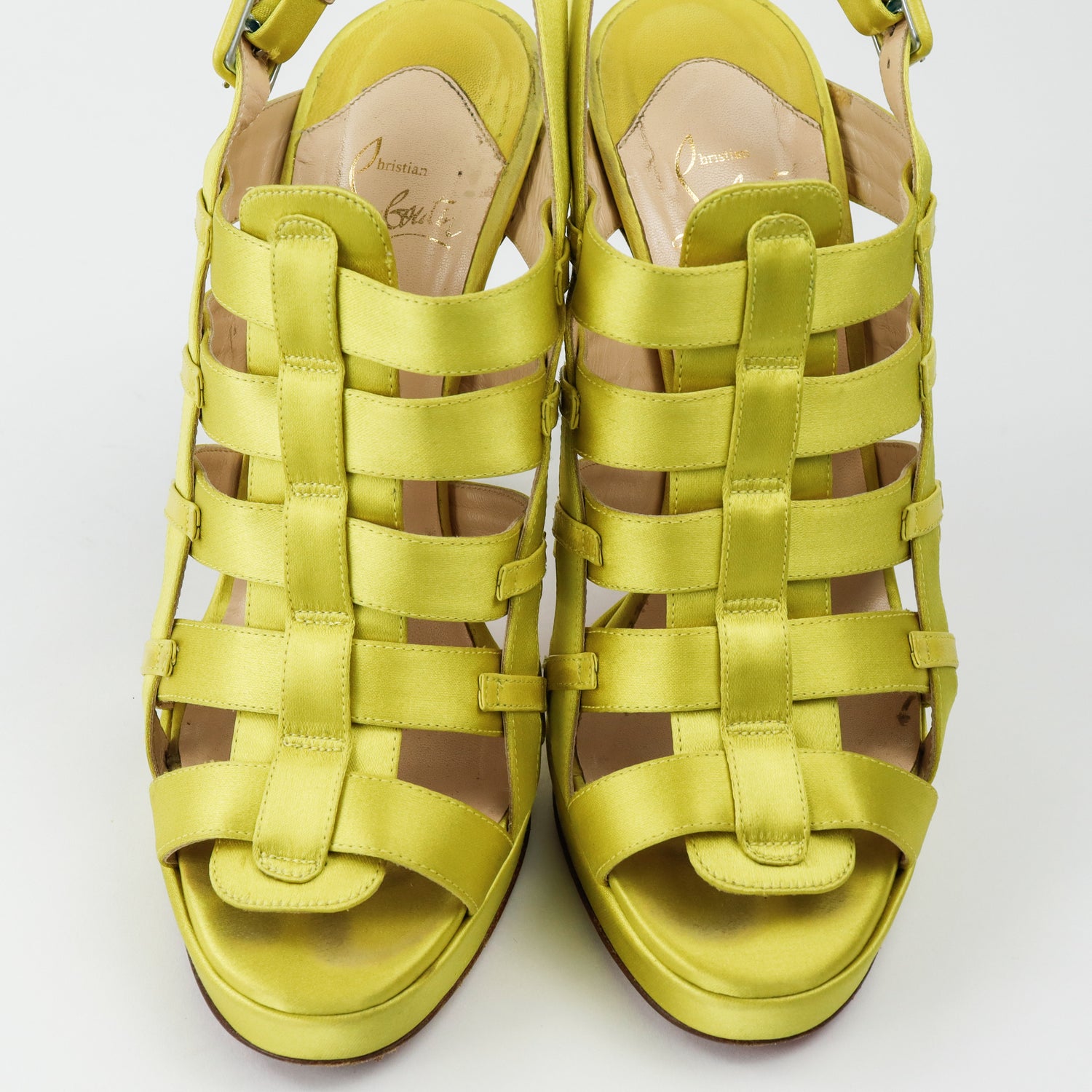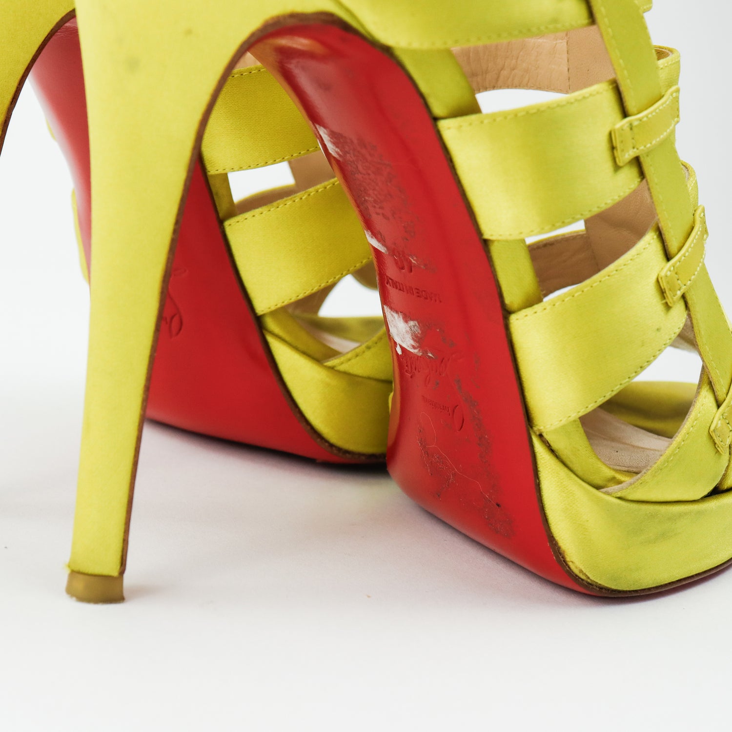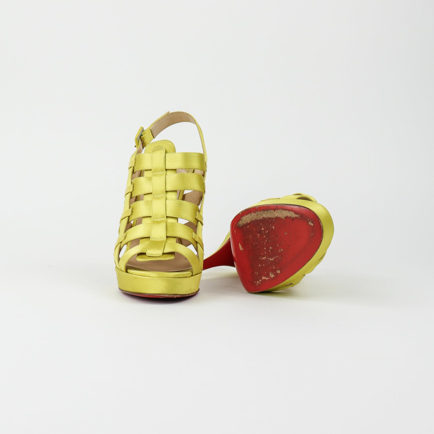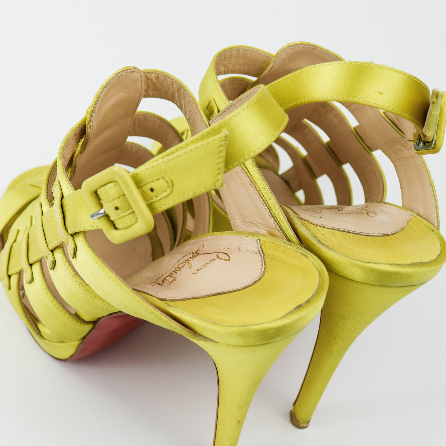 Sandalias Christian Louboutin Paquita de satín amarillo con detalles de cuero en la parte superior, costuras a tono en toda la prenda, tacones y plataformas cubiertos y cierres de hebilla en los tobillos.
