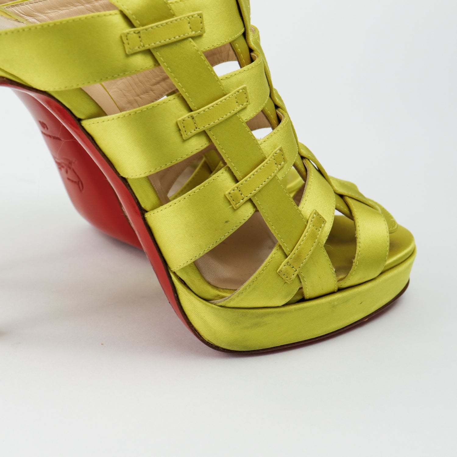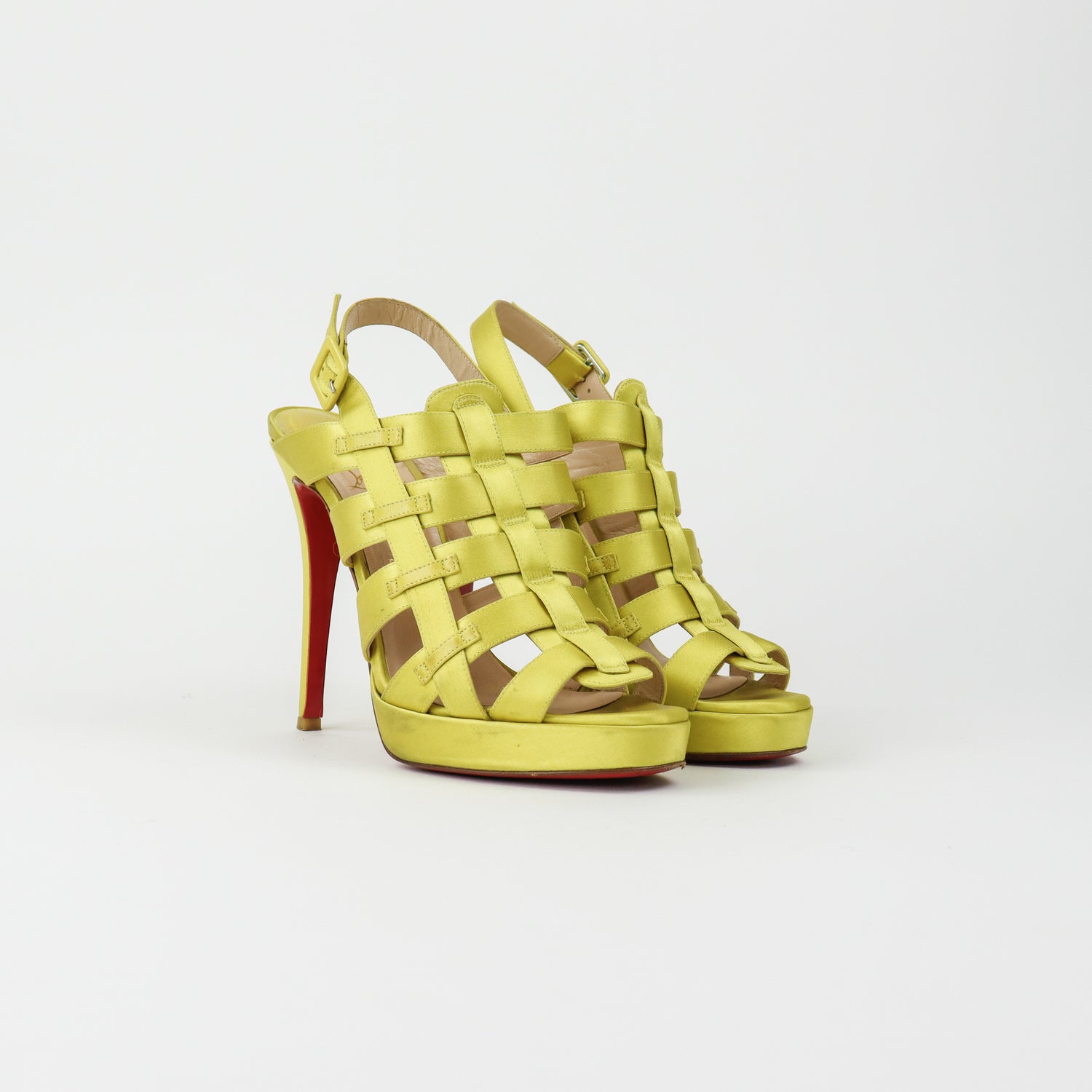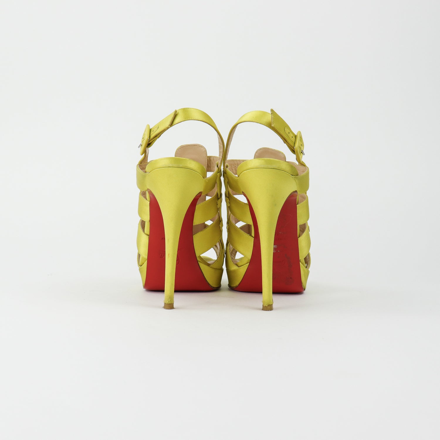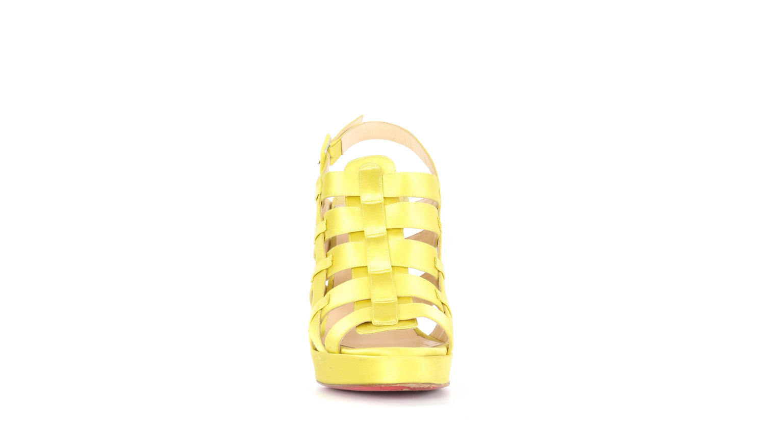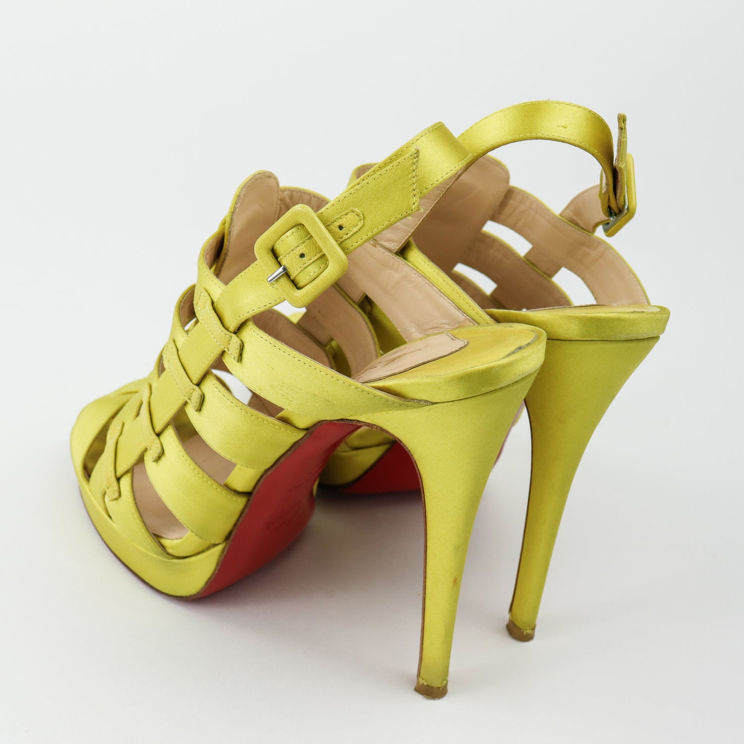 Sandalias Christian Louboutin Paquita de satín amarillo con detalles de cuero en la parte superior, costuras a tono en toda la prenda, tacones y plataformas cubiertos y cierres de hebilla en los tobillos.