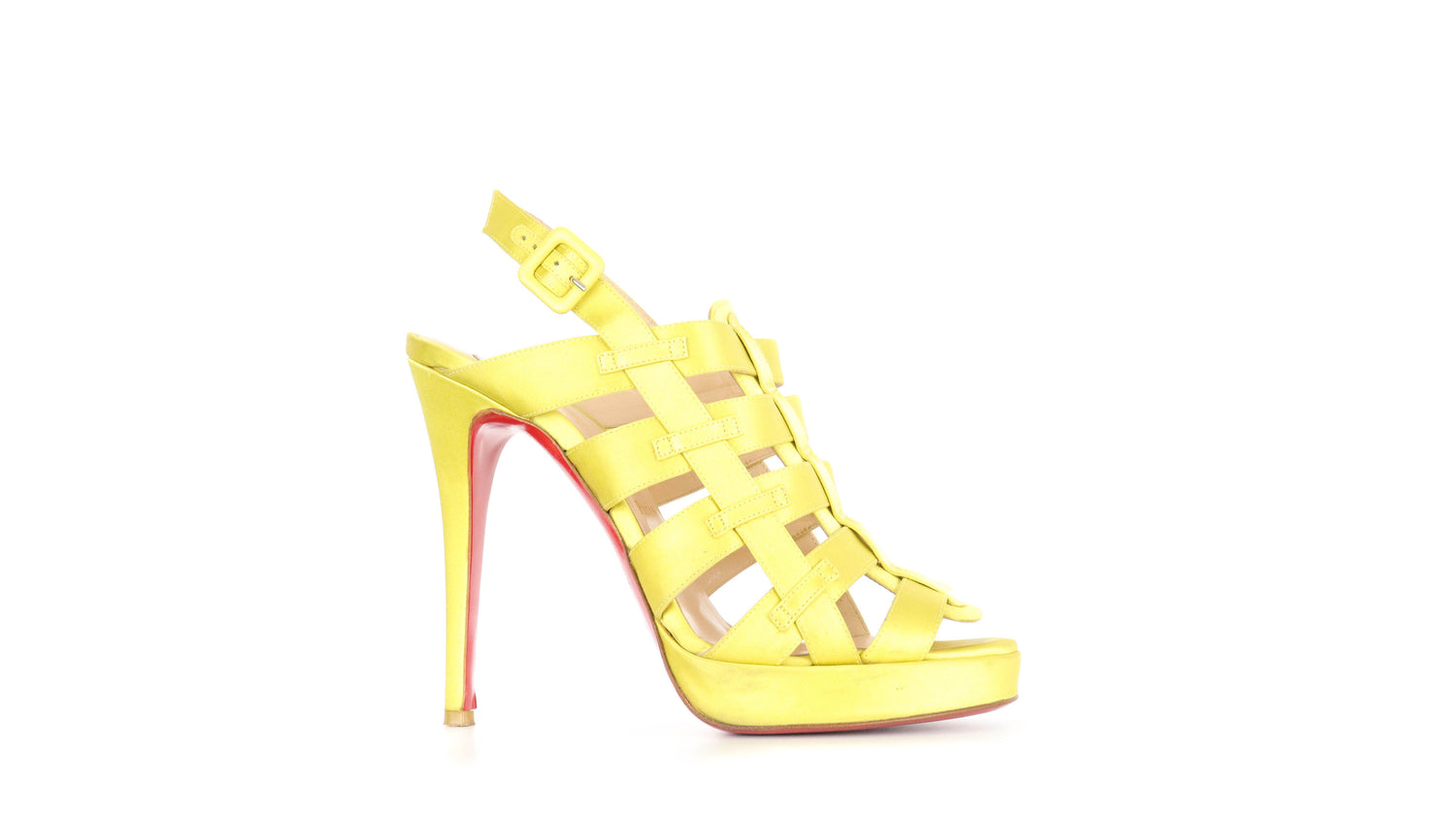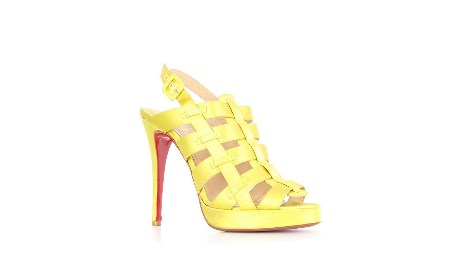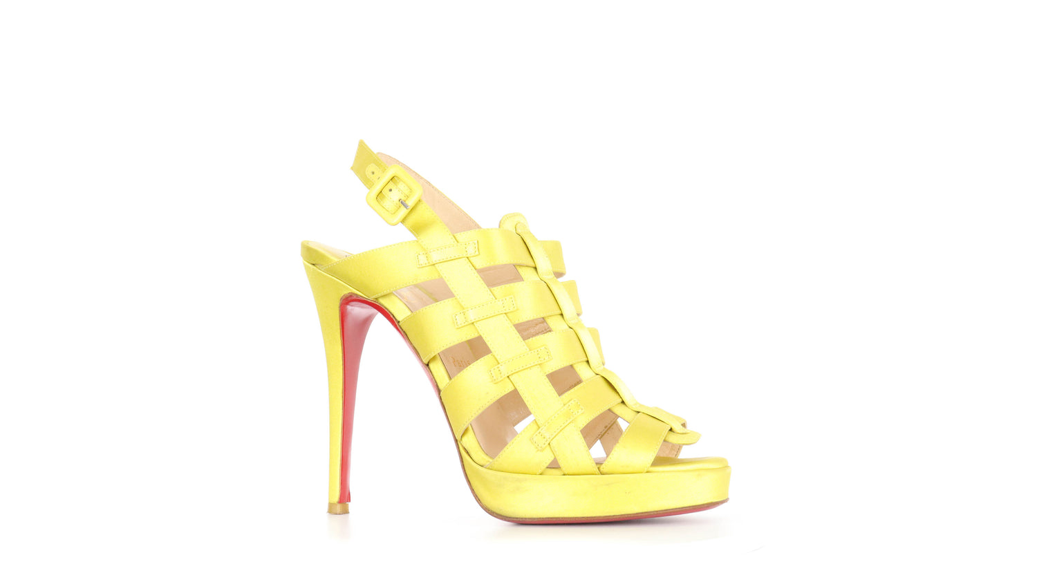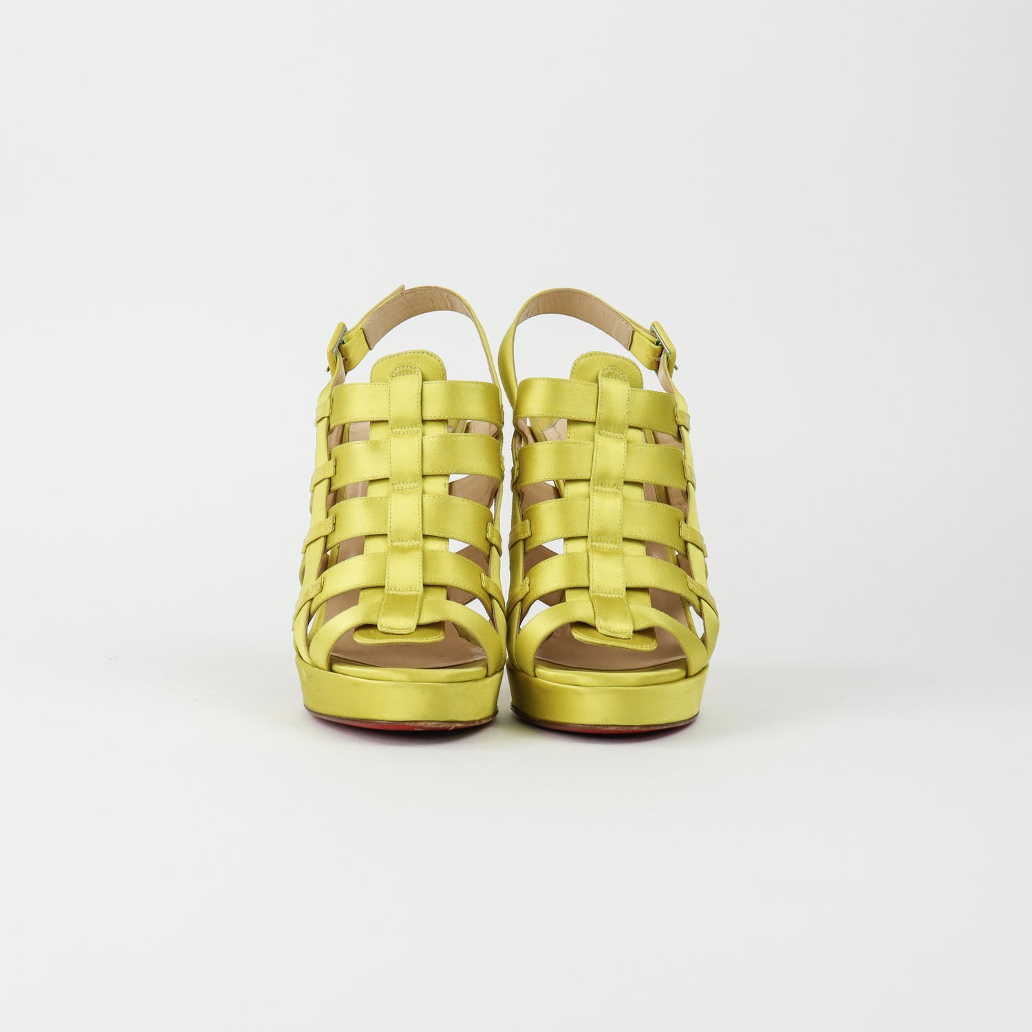 Sandalias Christian Louboutin Paquita de satín amarillo con detalles de cuero en la parte superior, costuras a tono en toda la prenda, tacones y plataformas cubiertos y cierres de hebilla en los tobillos.