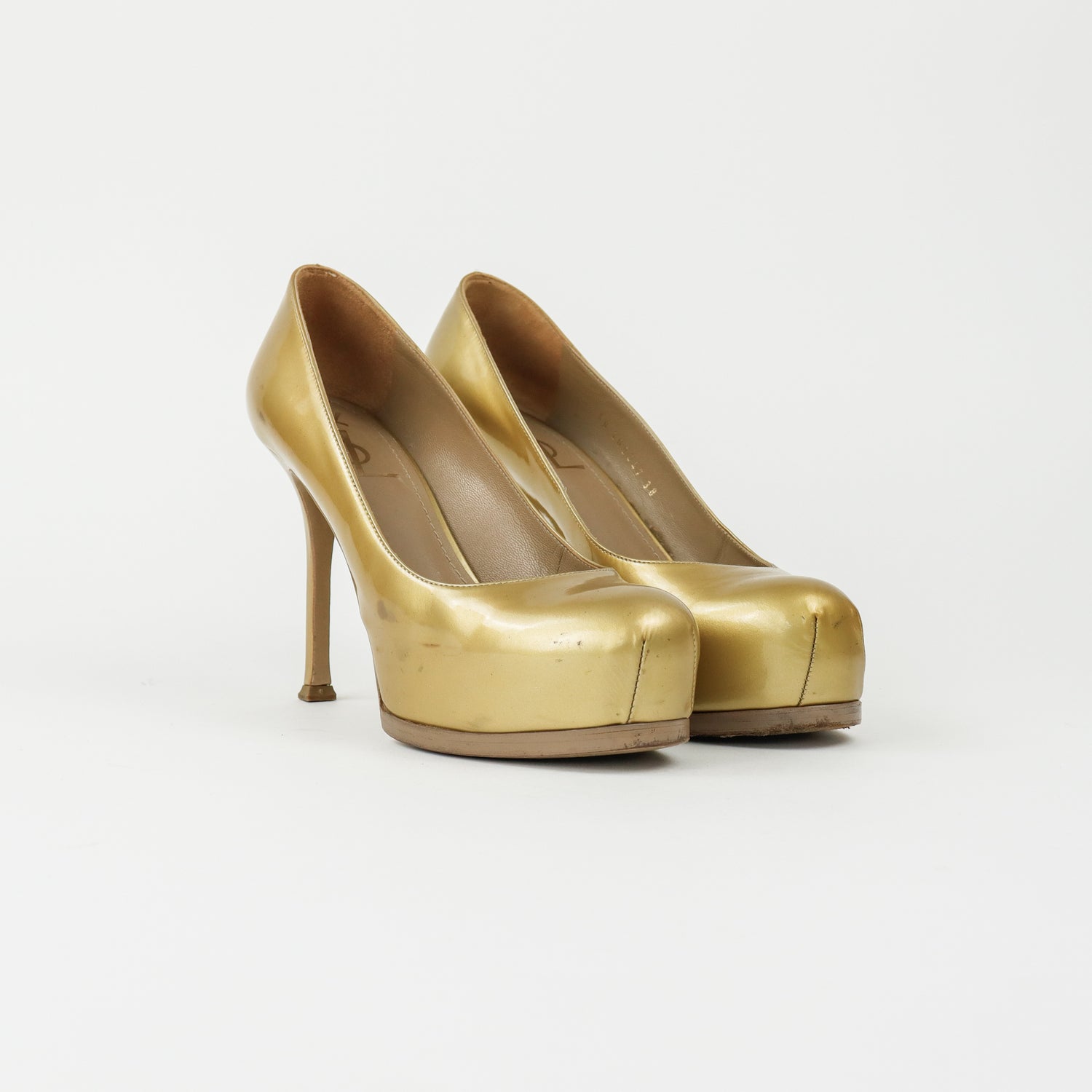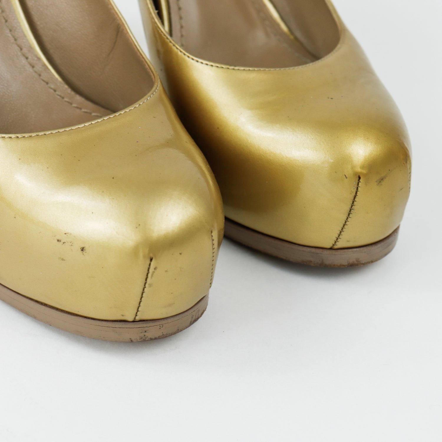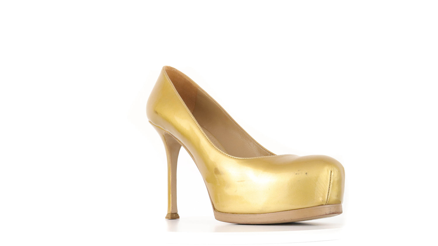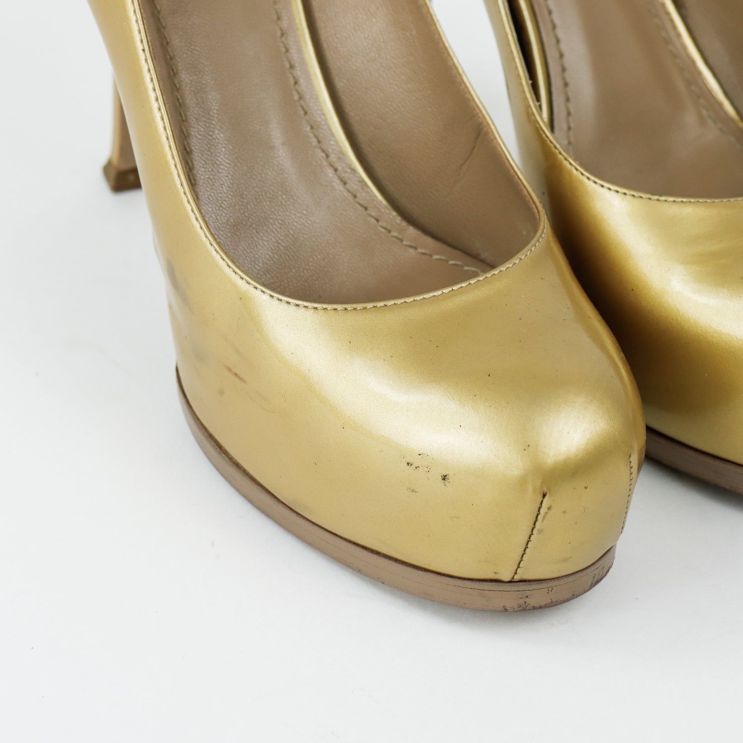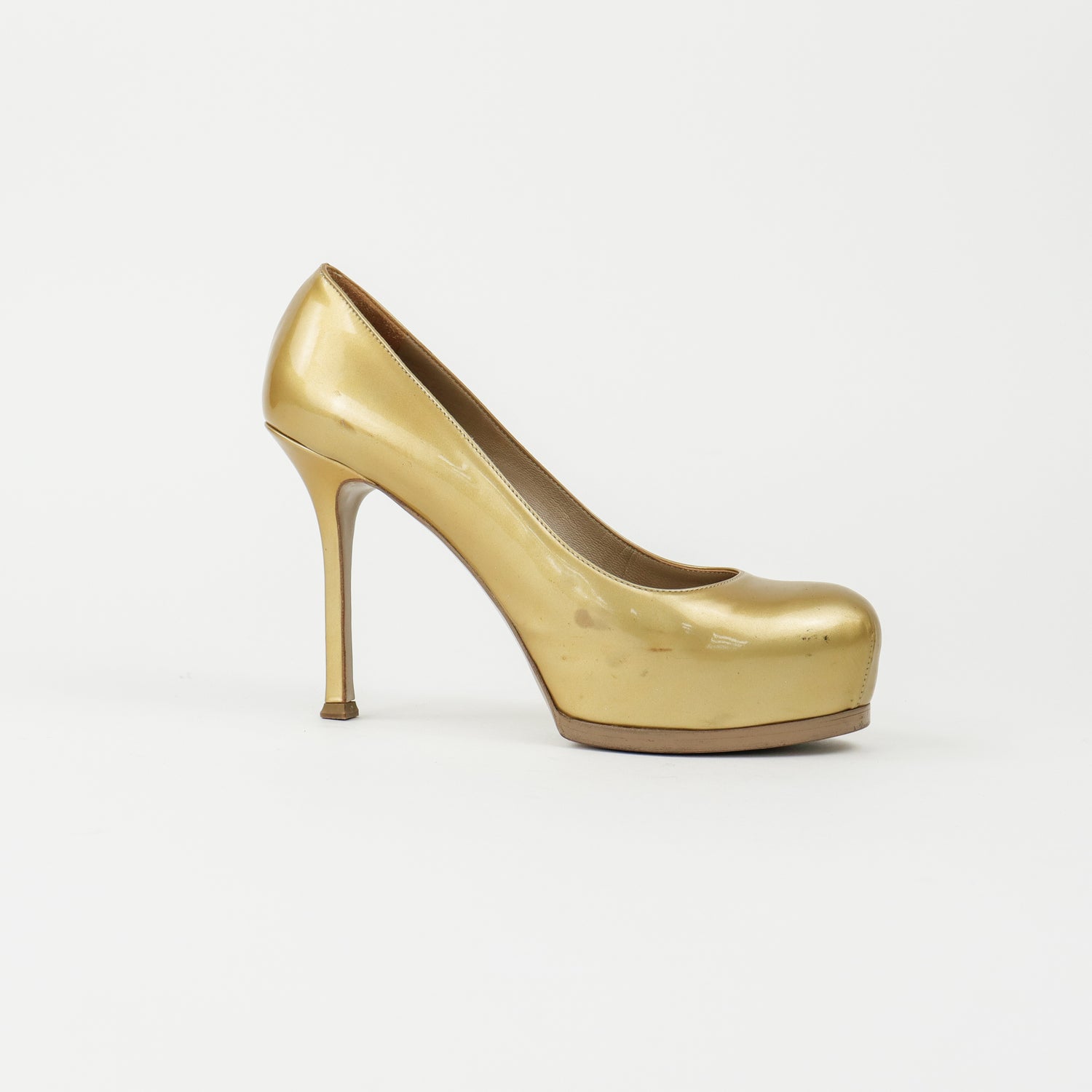 Zapatillas de tacón marca Yves Saint Laurent, confeccionados en piel color dorado, puntera redonda cerrada en el estilo característico de la marca, tacón stiletto y estilo slip-on.