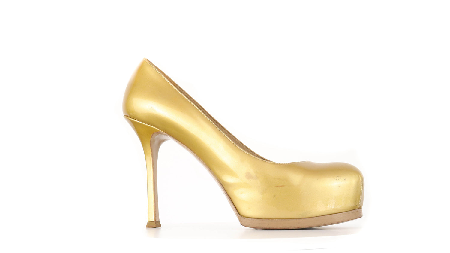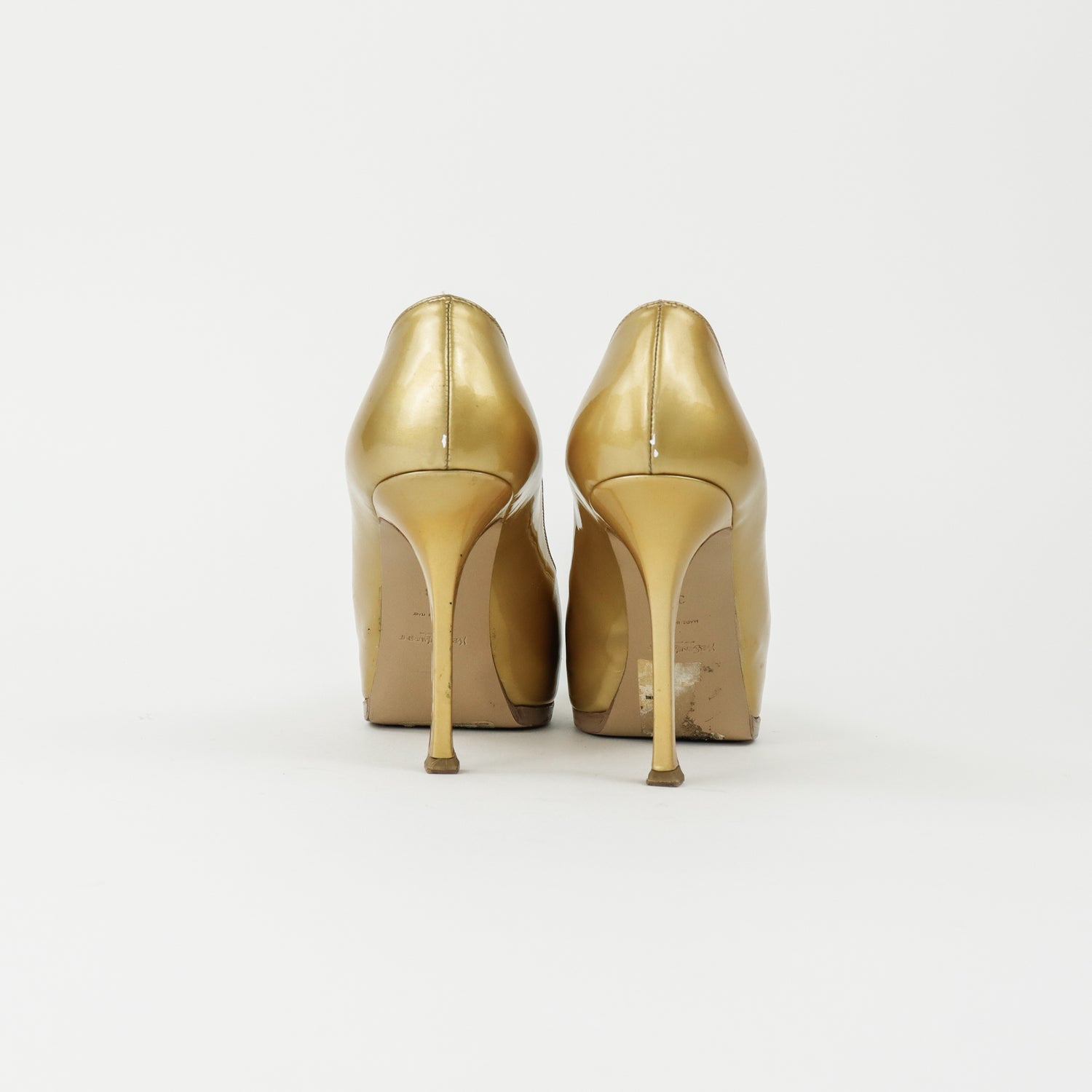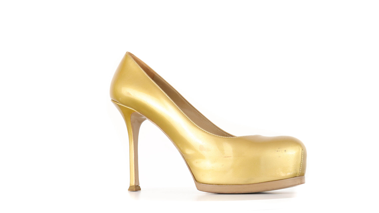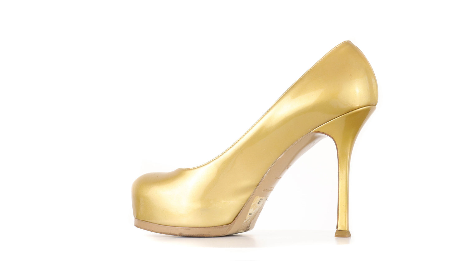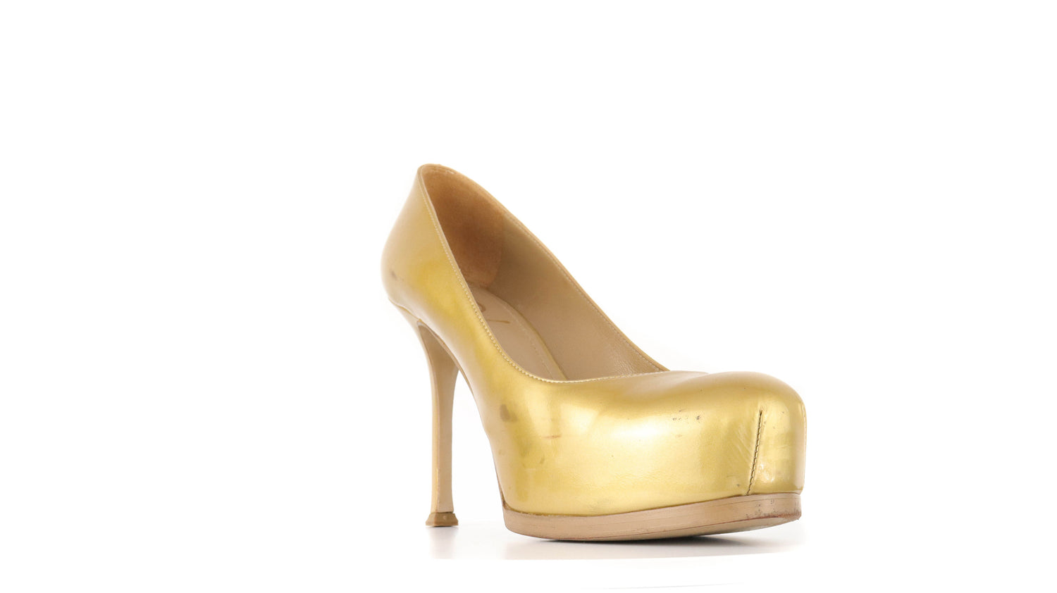 Zapatillas de tacón marca Yves Saint Laurent, confeccionados en piel color dorado, puntera redonda cerrada en el estilo característico de la marca, tacón stiletto y estilo slip-on.