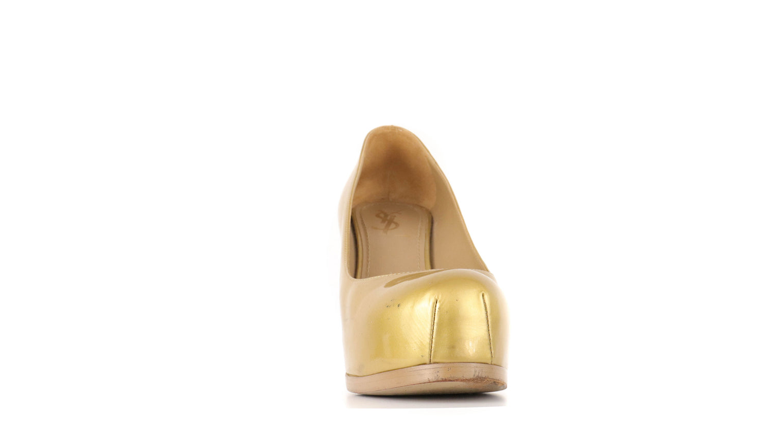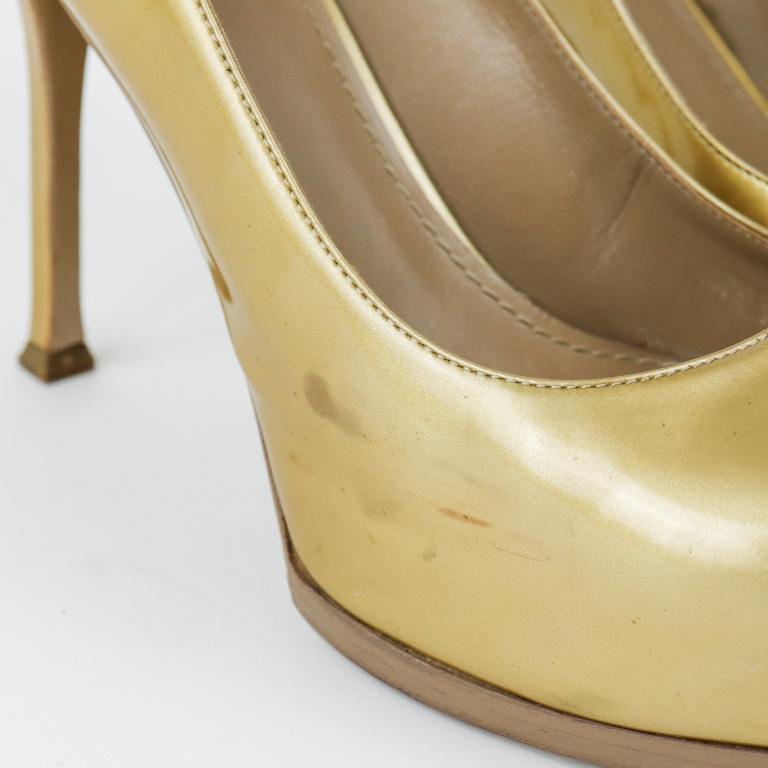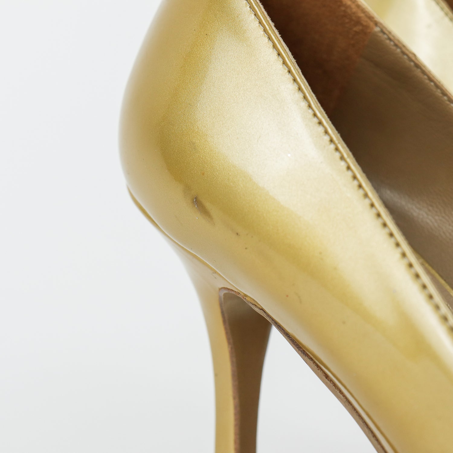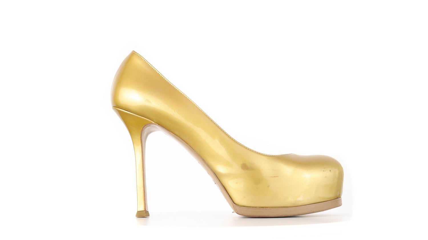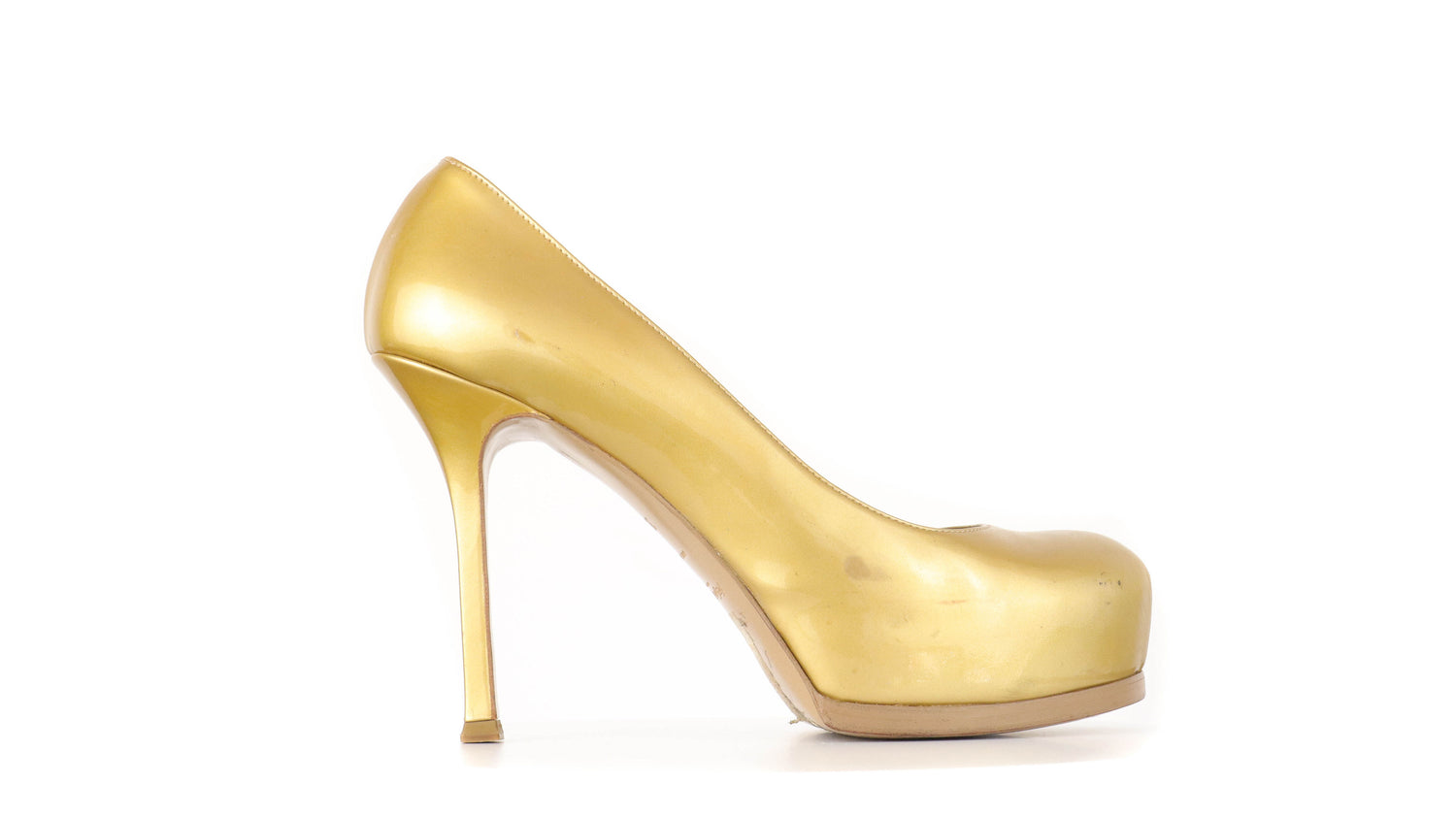Zapatillas de tacón marca Yves Saint Laurent, confeccionados en piel color dorado, puntera redonda cerrada en el estilo característico de la marca, tacón stiletto y estilo slip-on.