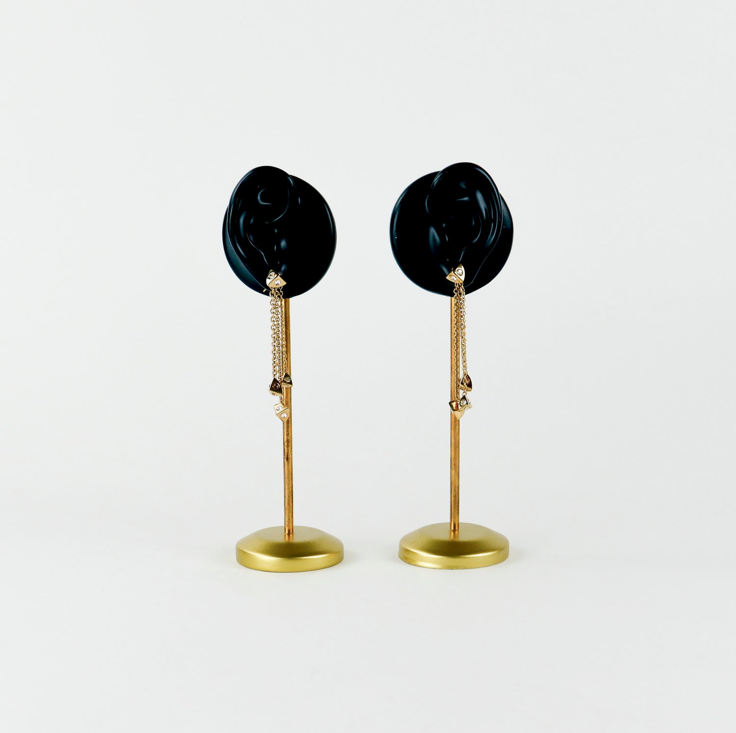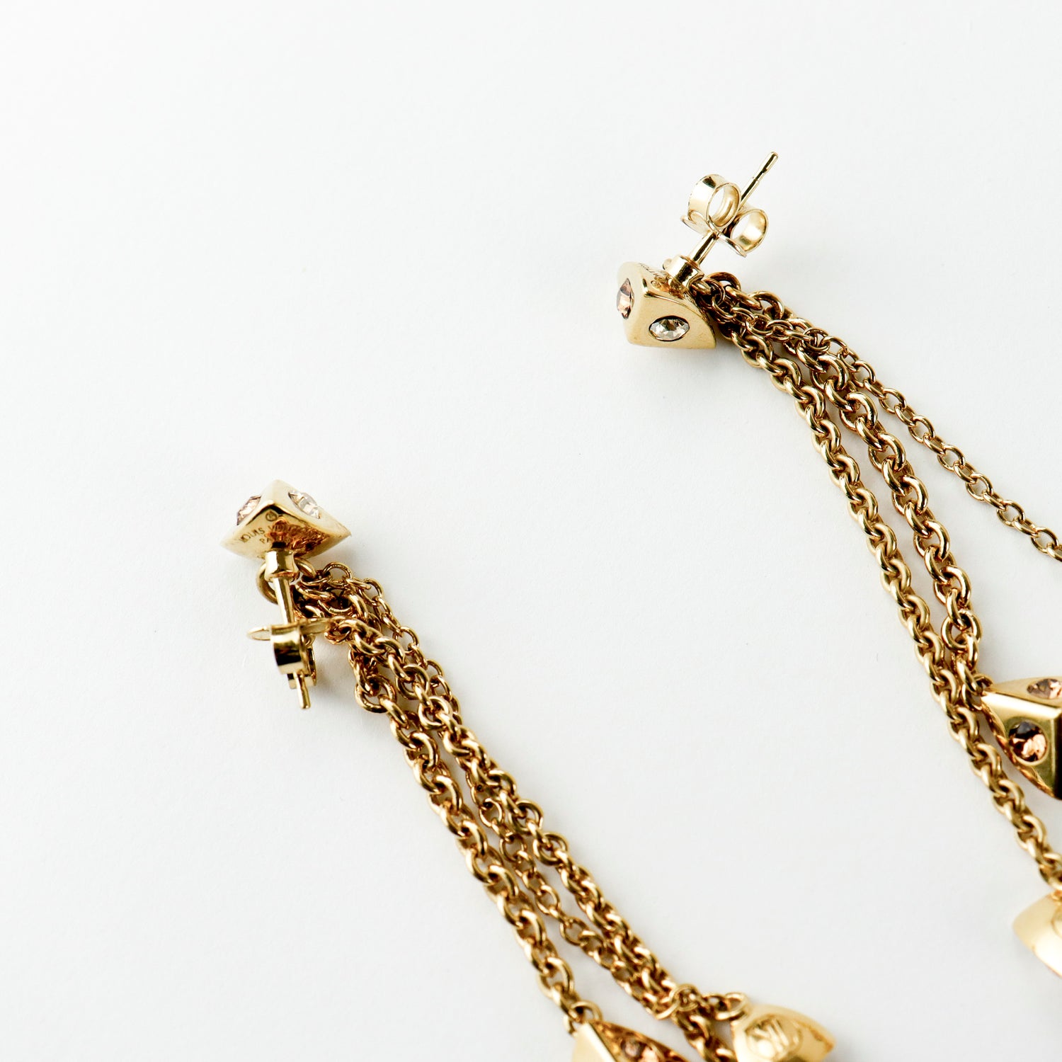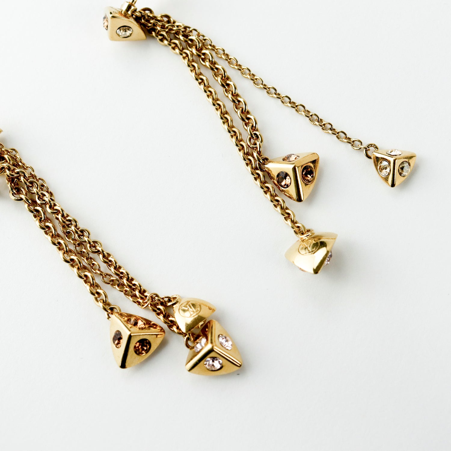 Par de aretes colgantes Louis Vuitton, fabricados en metal dorado, diseñados con barbas y prismáticos adornados con circonias y el característico logo de la marca.