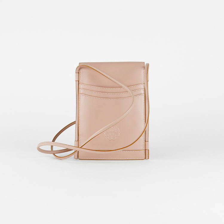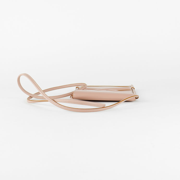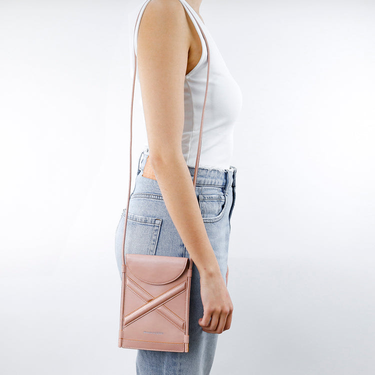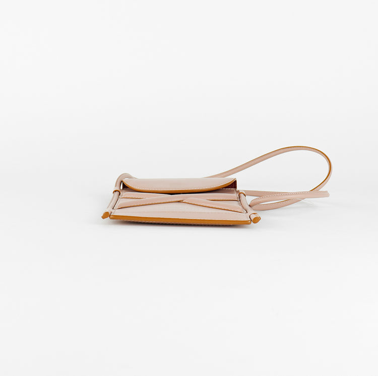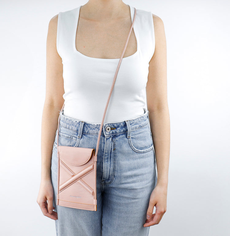 Bolso tipo crossbody Alexander McQueen, de la colección Curve, diseño aplanado con tiras cruzadas acolchadas en alto relieve, confeccionado en suave piel de cordero color rosa claro y vino al interior.