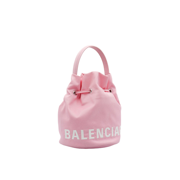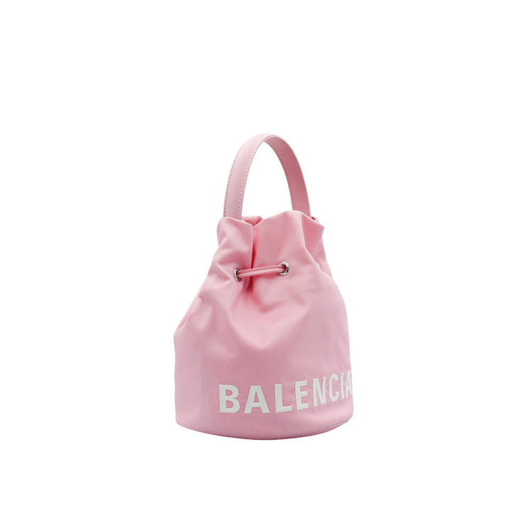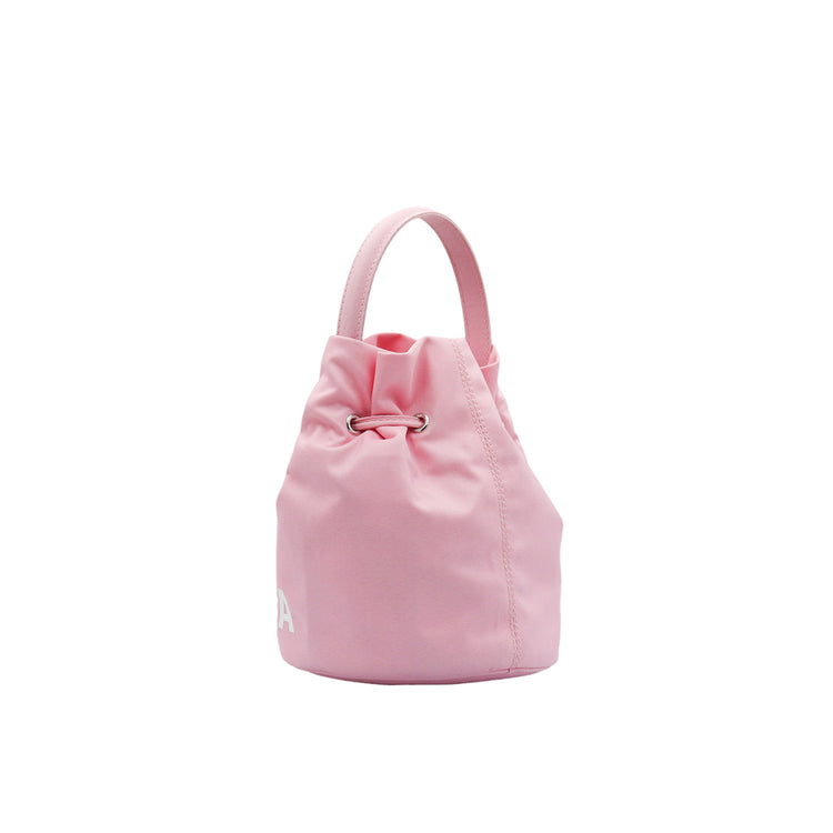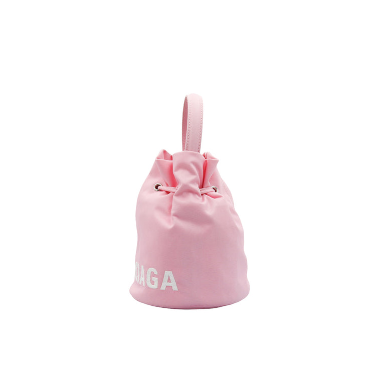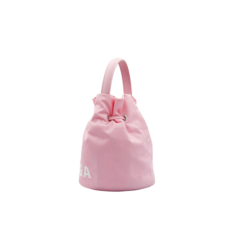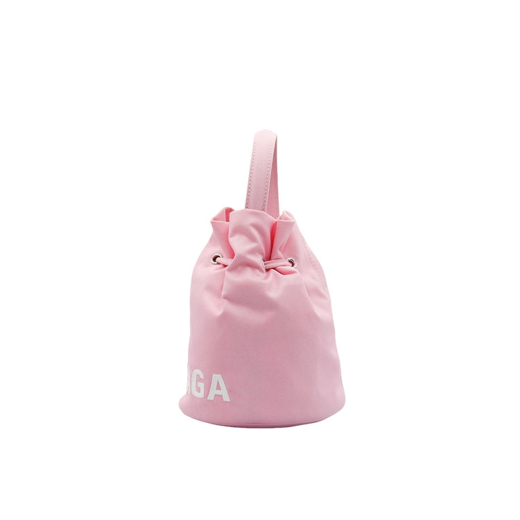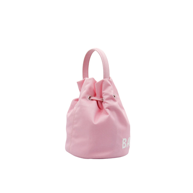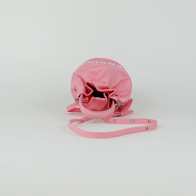 Bolso Balenciaga Wheel Bucket Bag, confeccionado en nylon color rosa con el nombre de la marca bordada en color blanco.