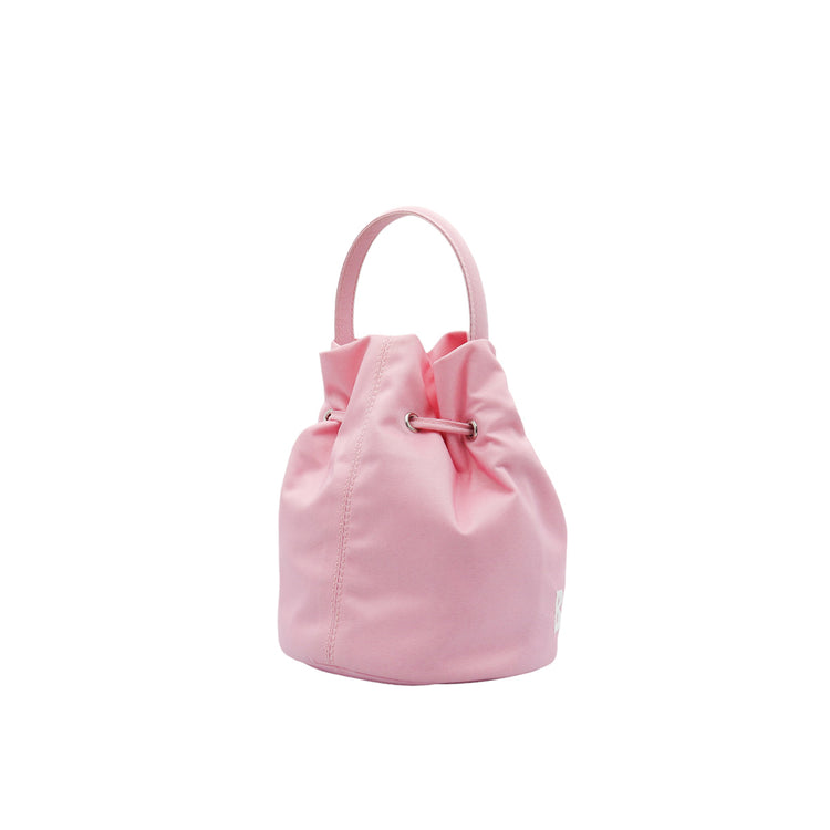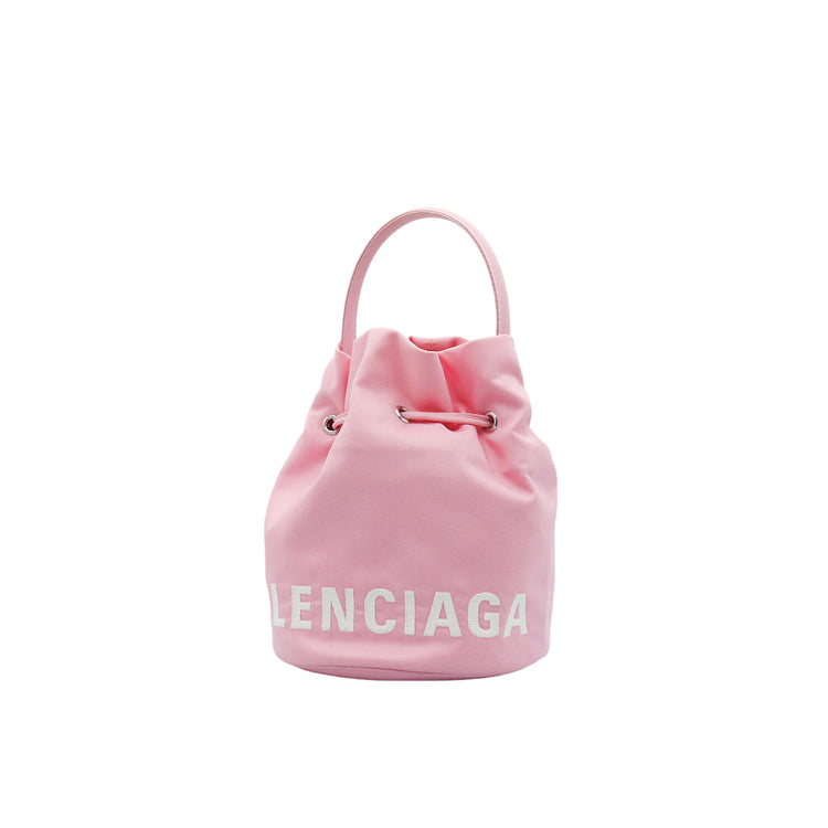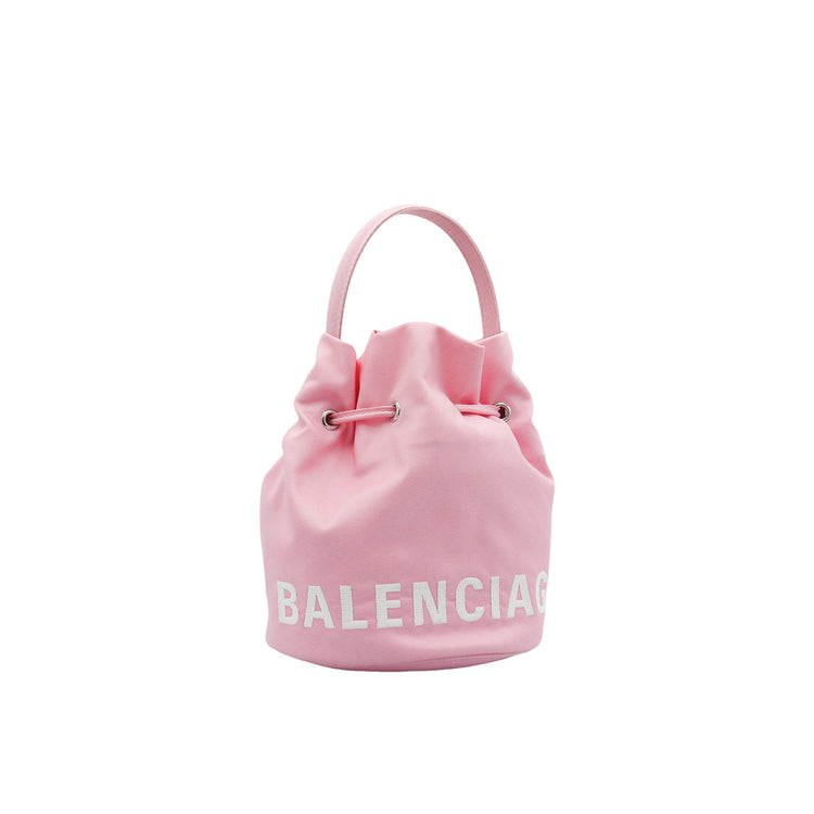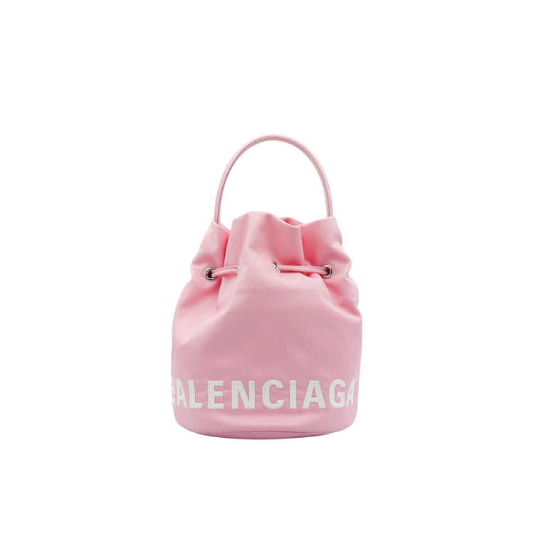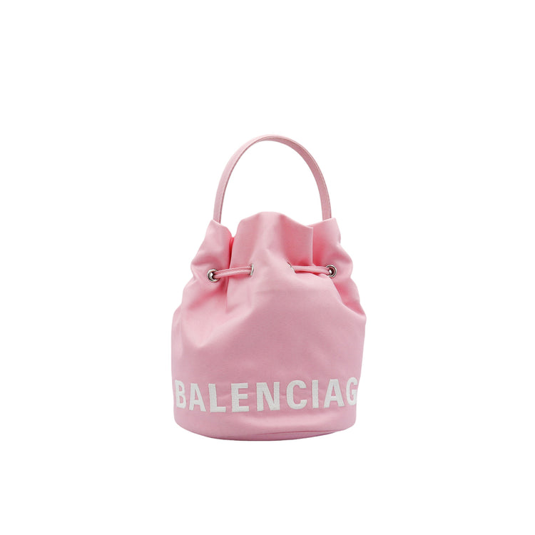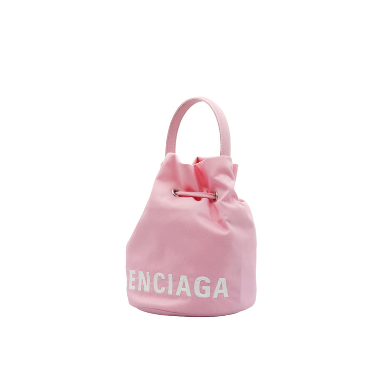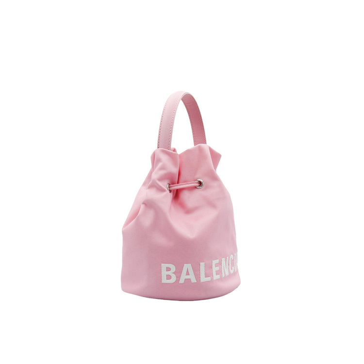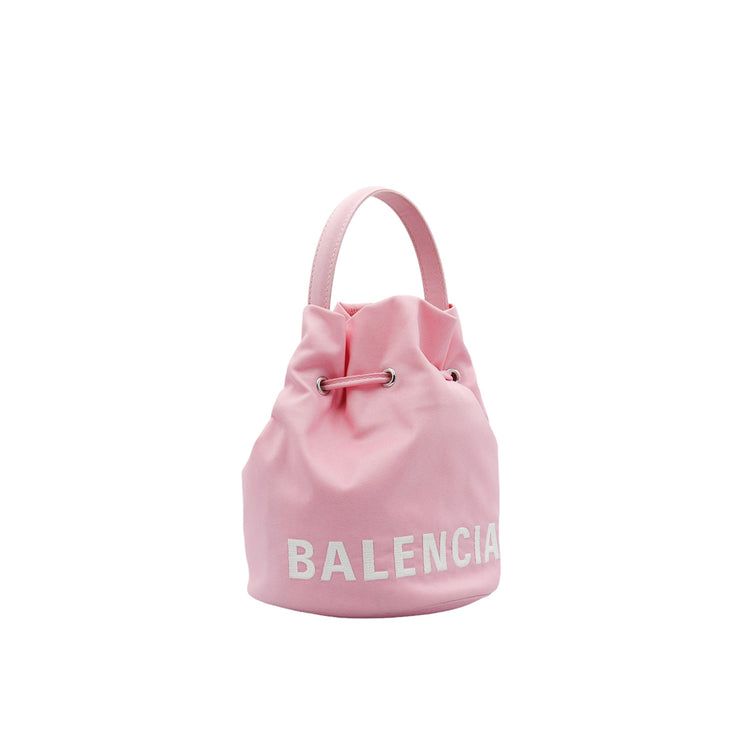 Bolso Balenciaga Wheel Bucket Bag, confeccionado en nylon color rosa con el nombre de la marca bordada en color blanco.