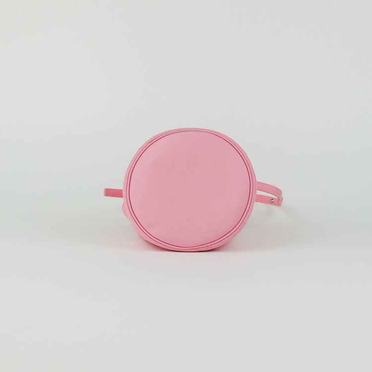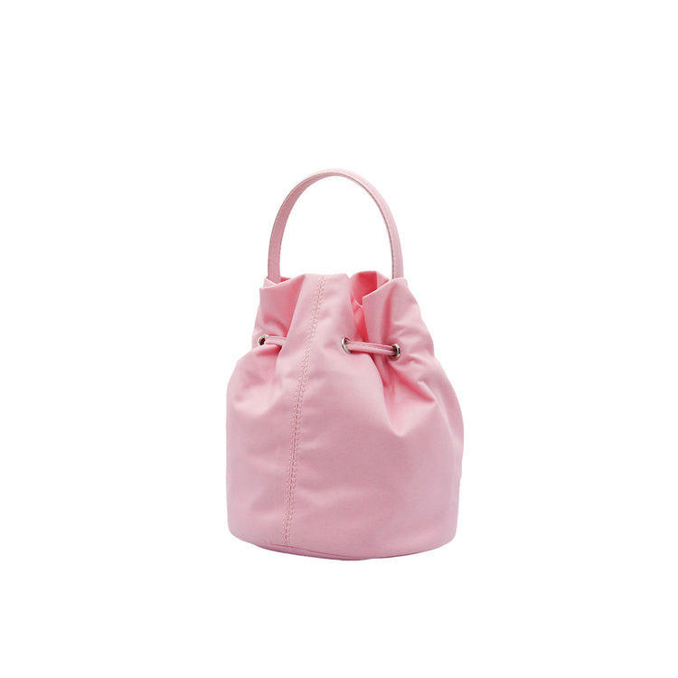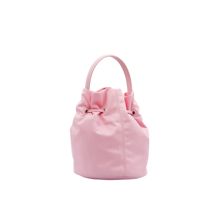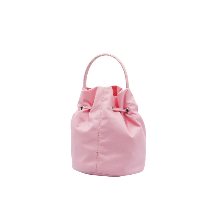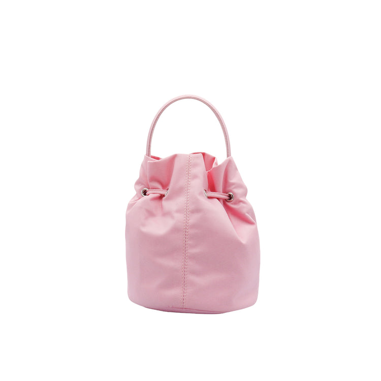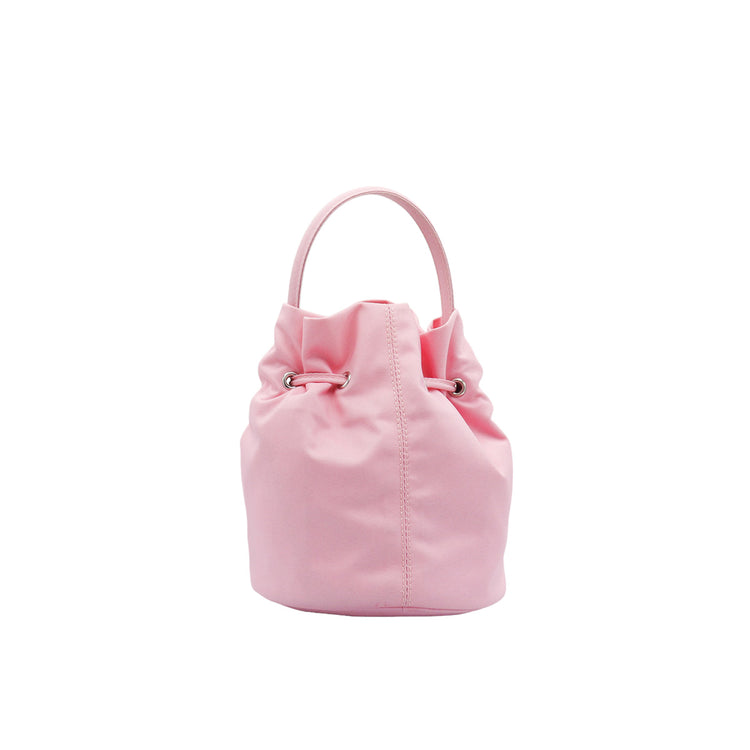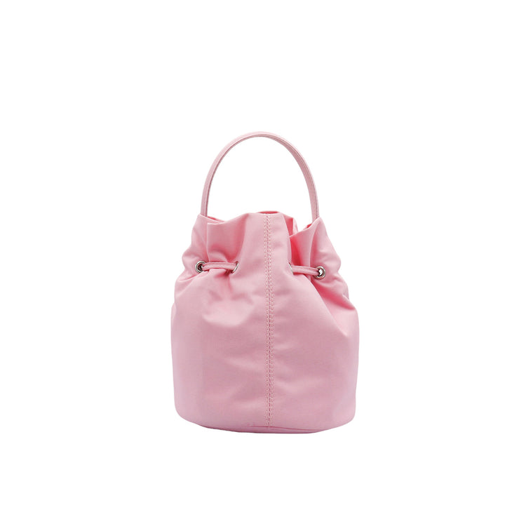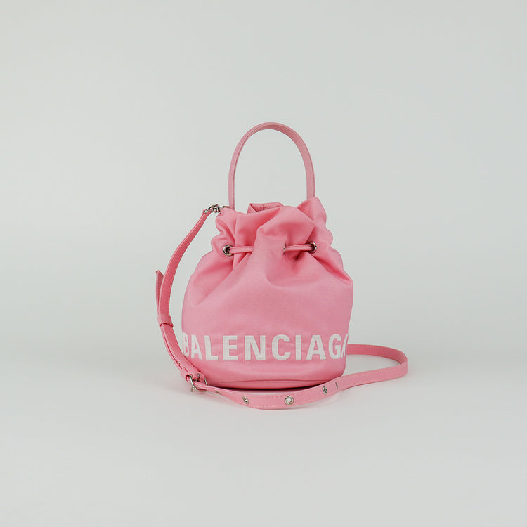Bolso Balenciaga Wheel Bucket Bag, confeccionado en nylon color rosa con el nombre de la marca bordada en color blanco.