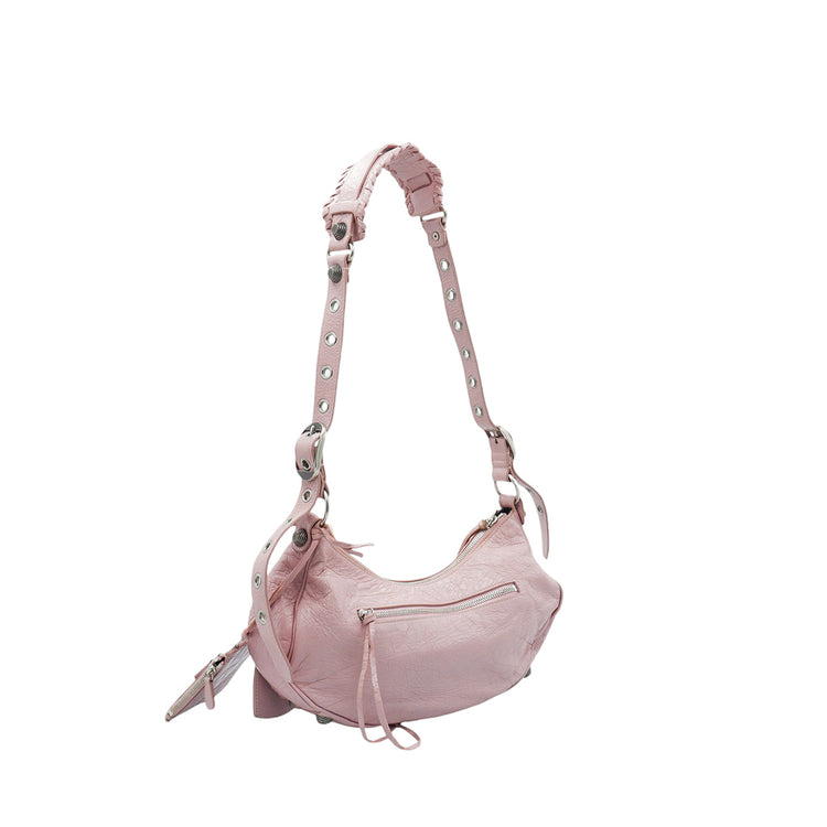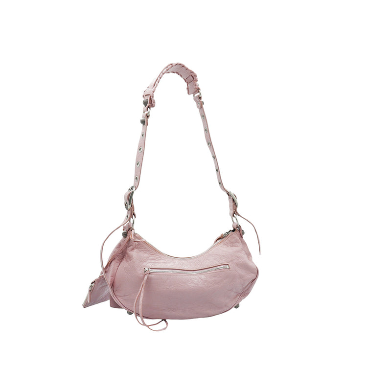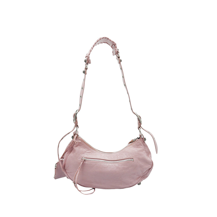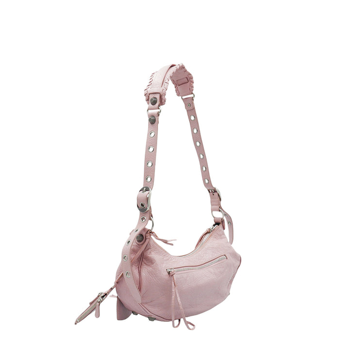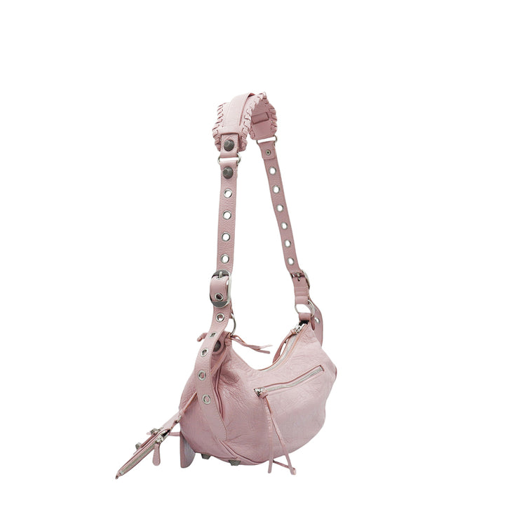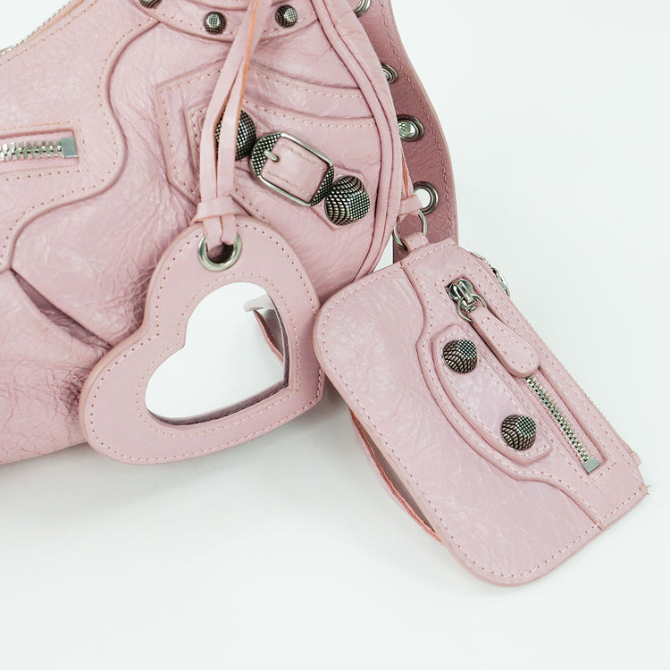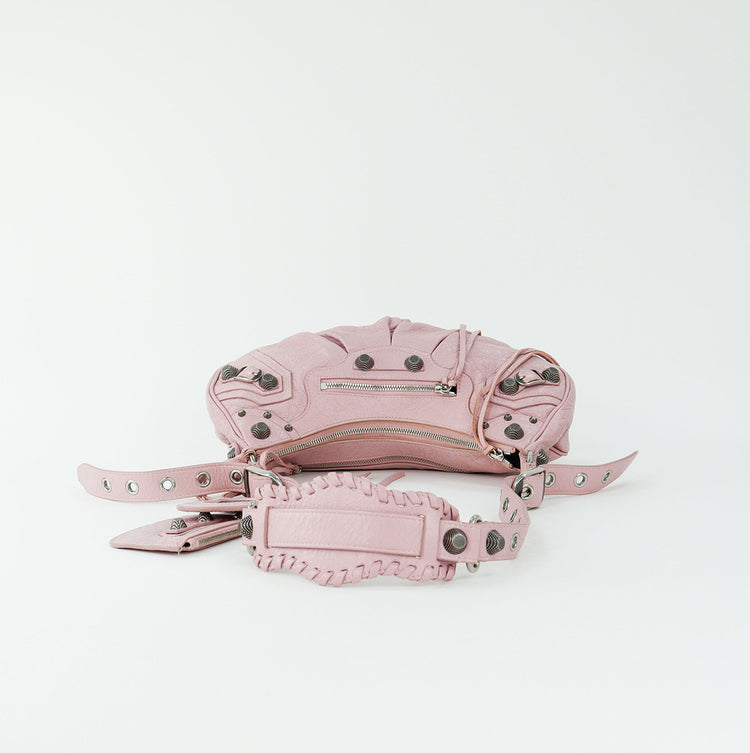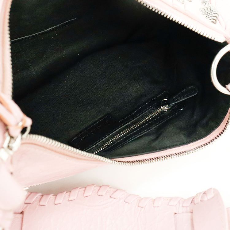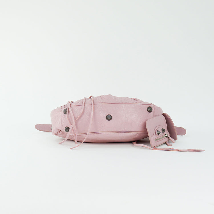 Bolso marca Balenciaga, de la línea Le Cagole, confeccionado en suave piel tipo avejentada color rosa, con forro interno en textil negro, con espejo y monedero extraíbles.
