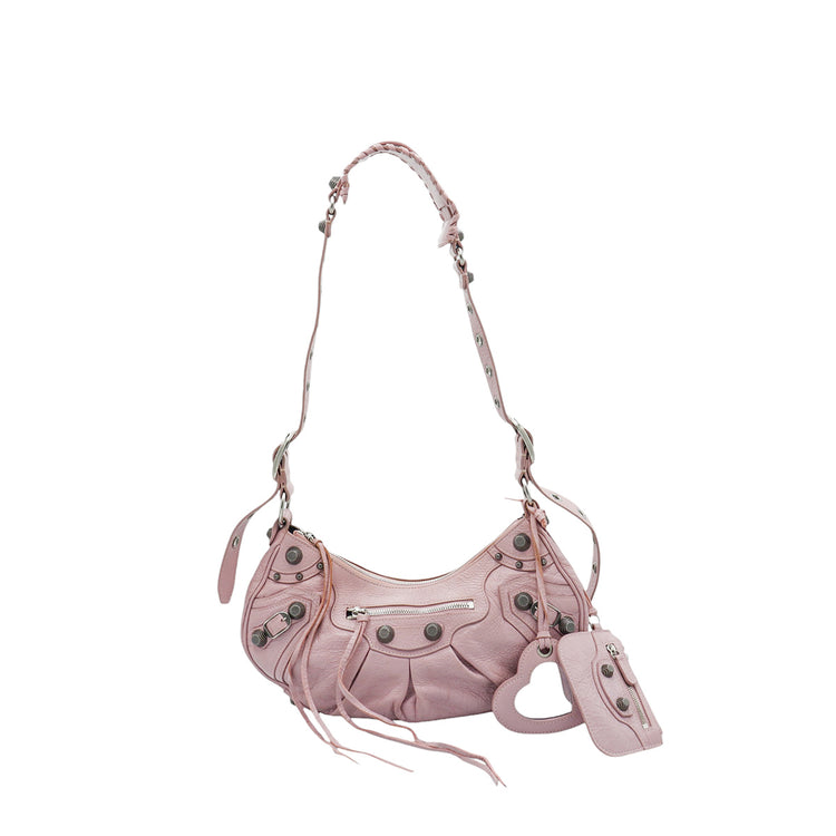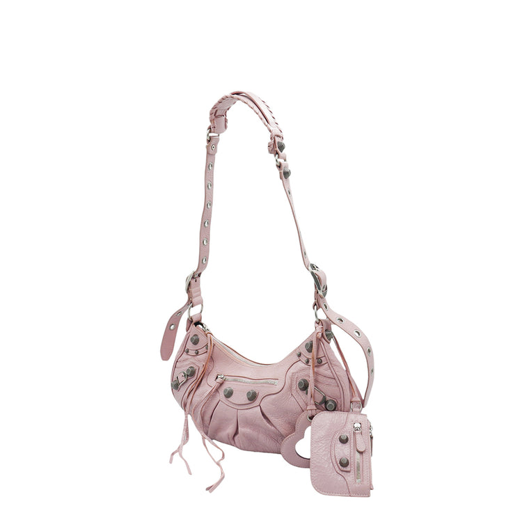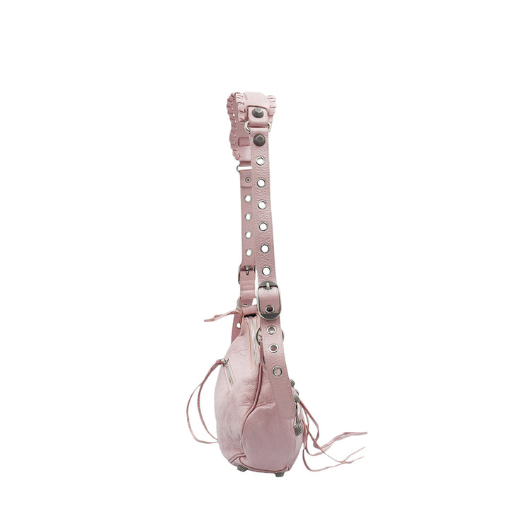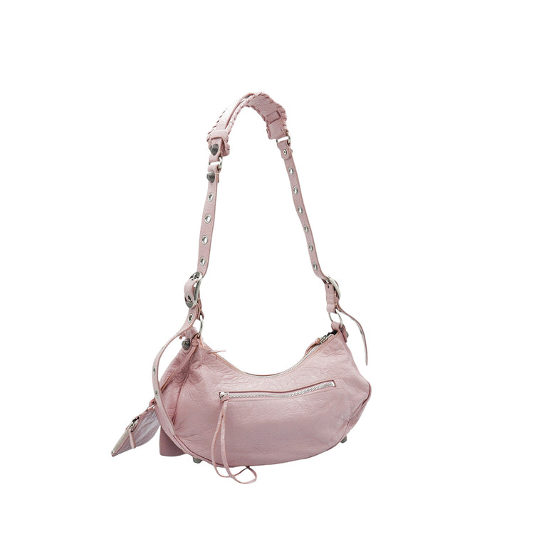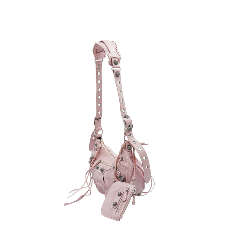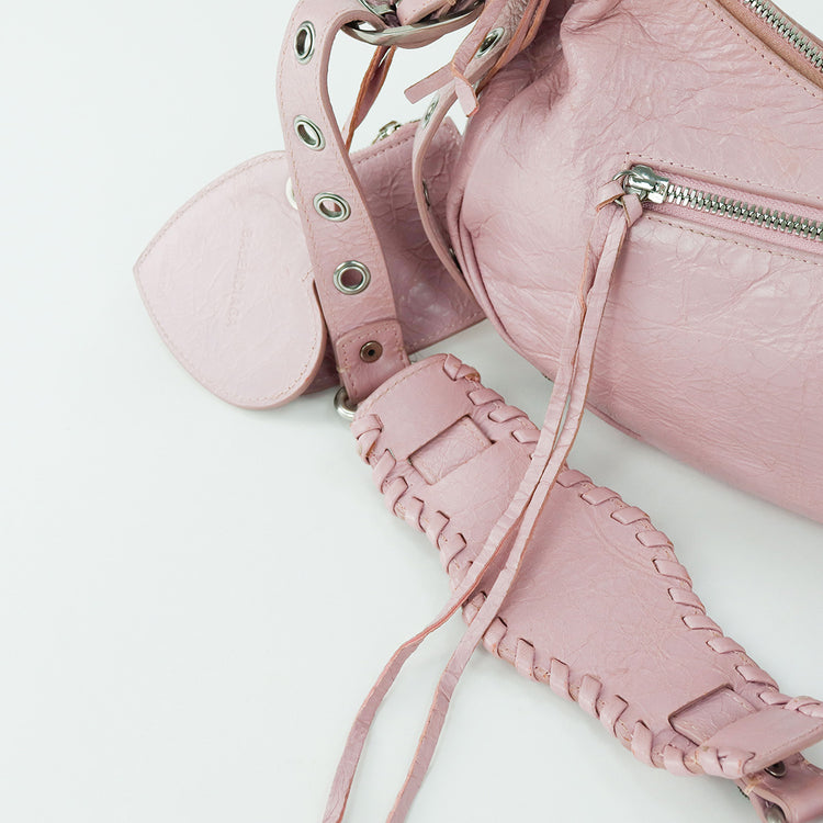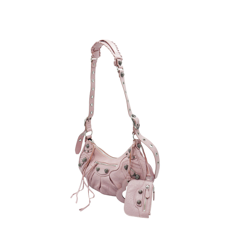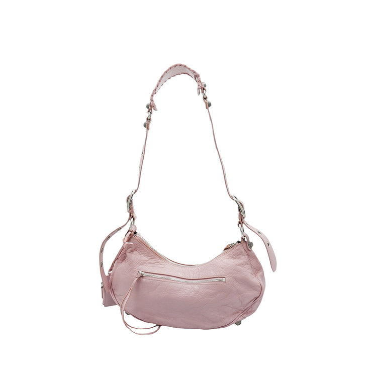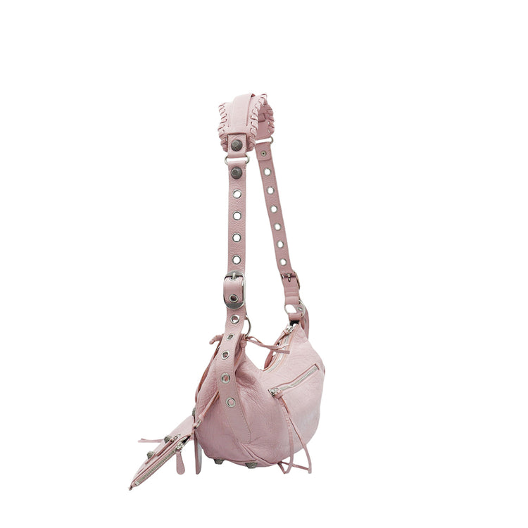 Bolso marca Balenciaga, de la línea Le Cagole, confeccionado en suave piel tipo avejentada color rosa, con forro interno en textil negro, con espejo y monedero extraíbles.