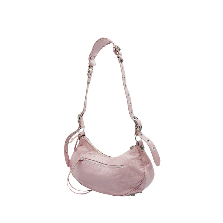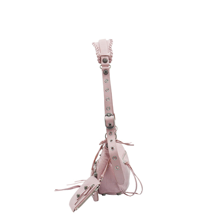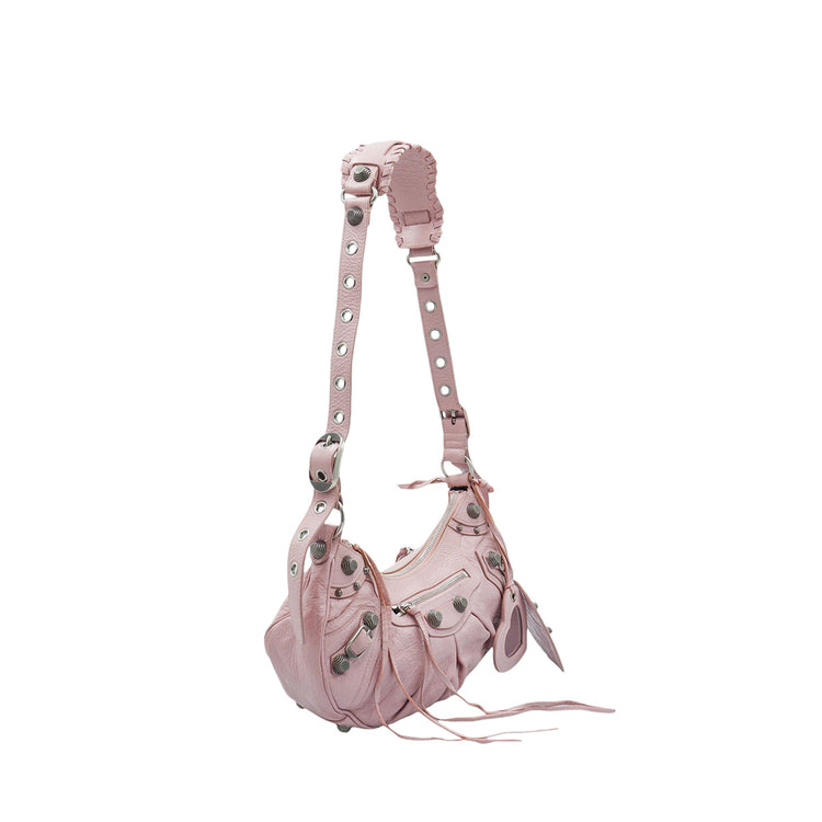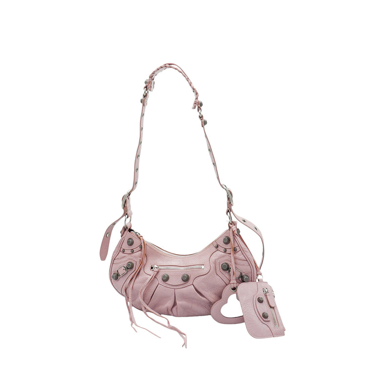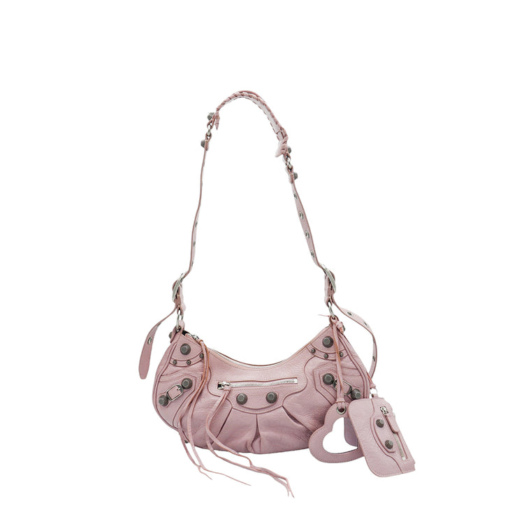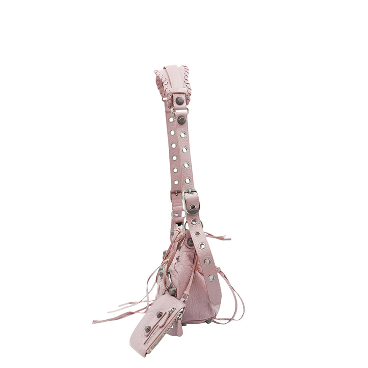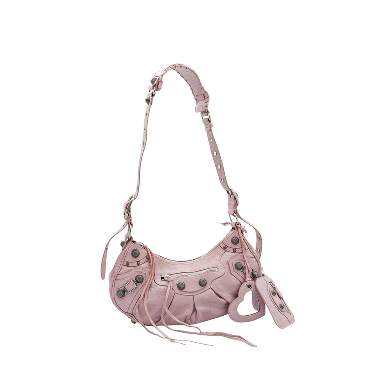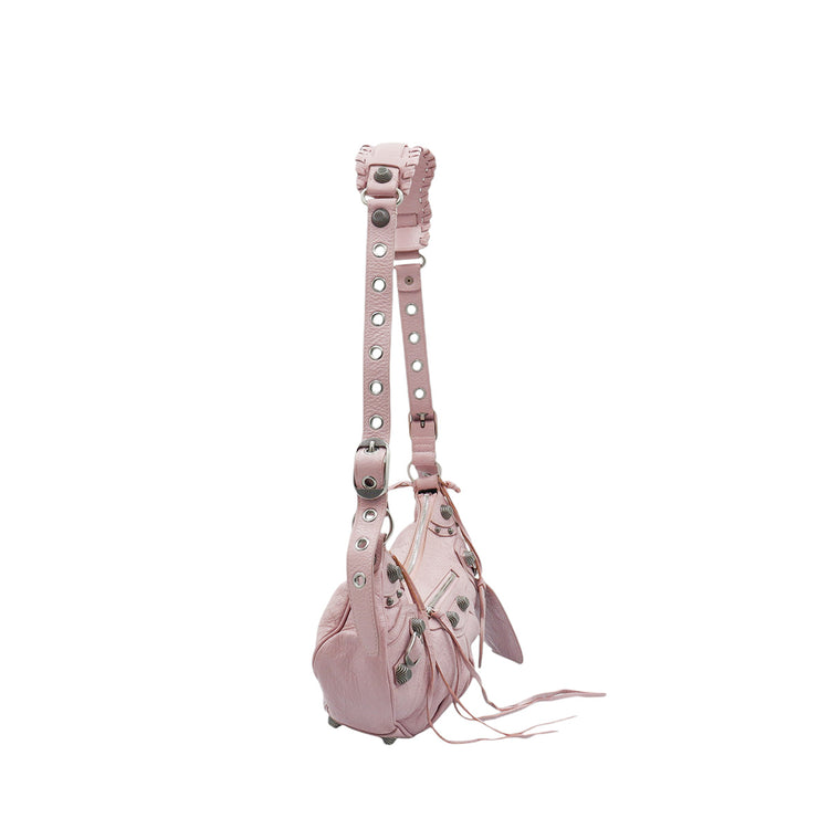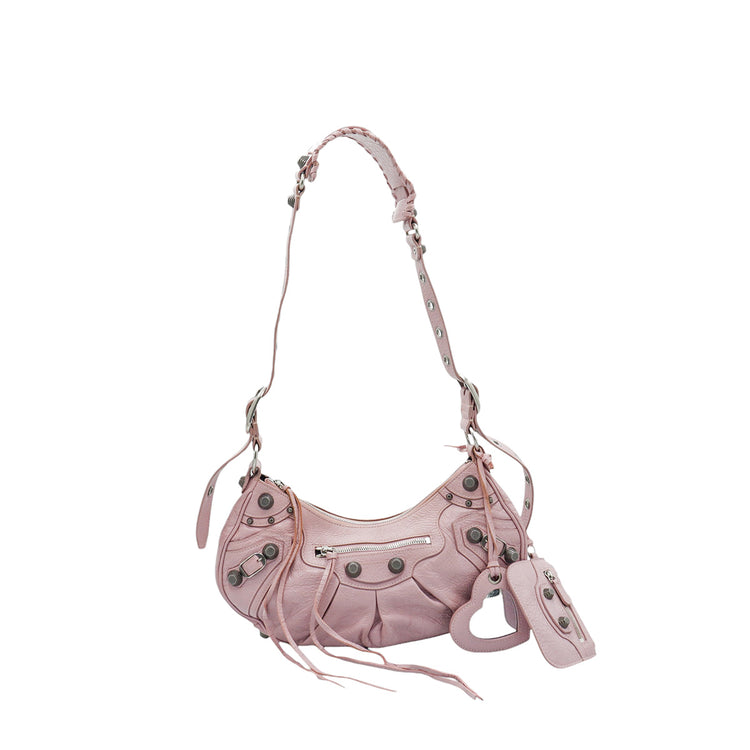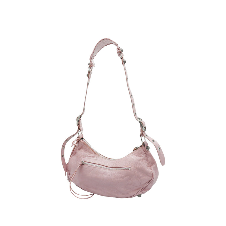 Bolso marca Balenciaga, de la línea Le Cagole, confeccionado en suave piel tipo avejentada color rosa, con forro interno en textil negro, con espejo y monedero extraíbles.