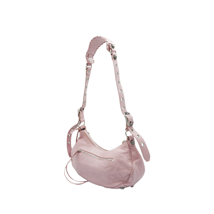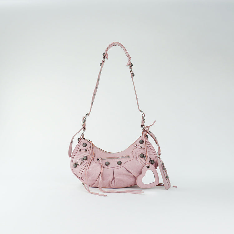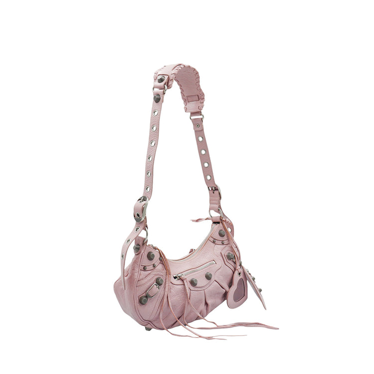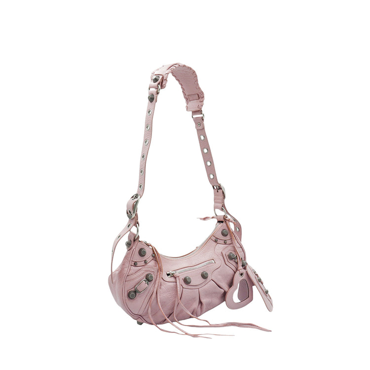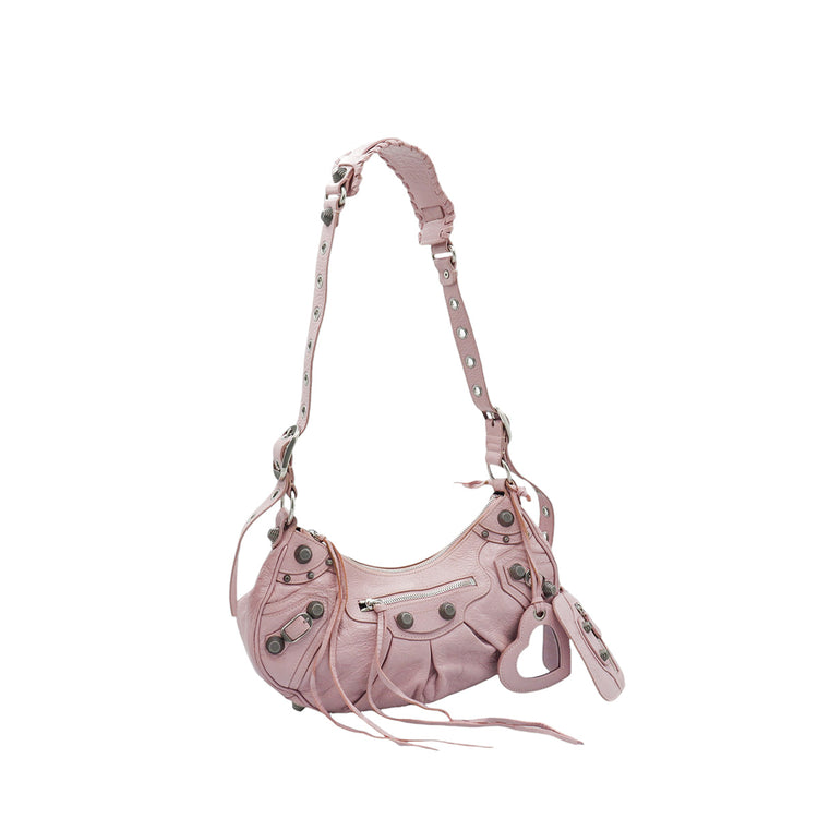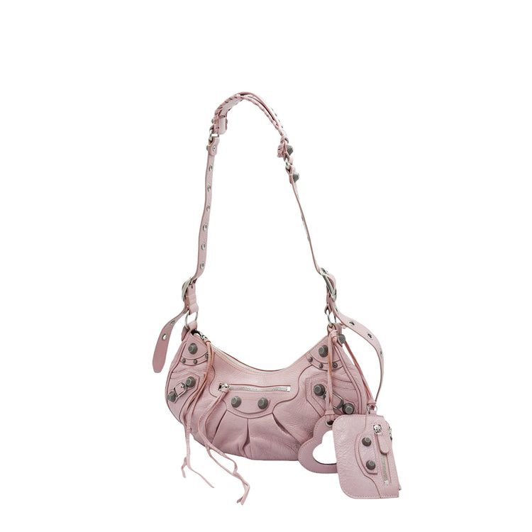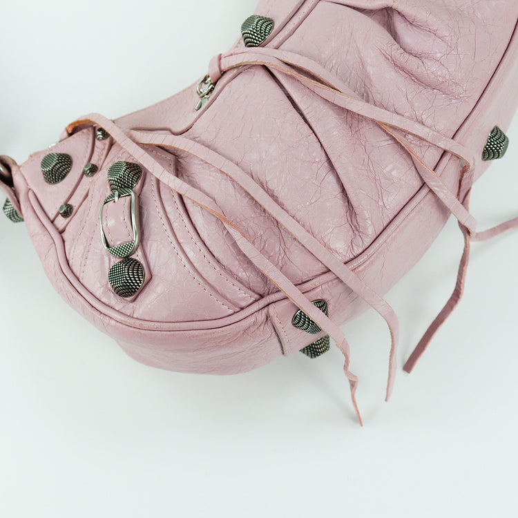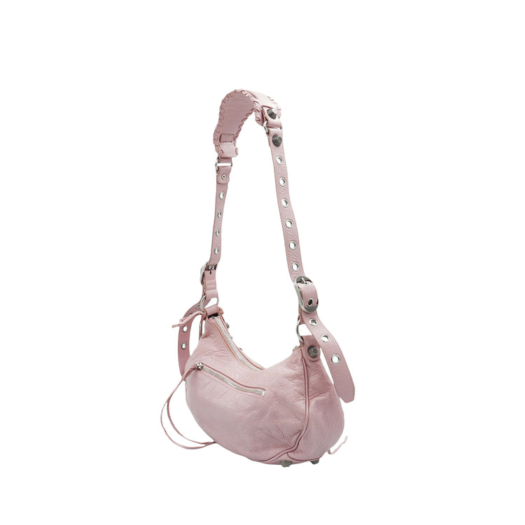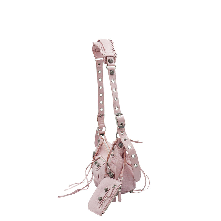 Bolso marca Balenciaga, de la línea Le Cagole, confeccionado en suave piel tipo avejentada color rosa, con forro interno en textil negro, con espejo y monedero extraíbles.
