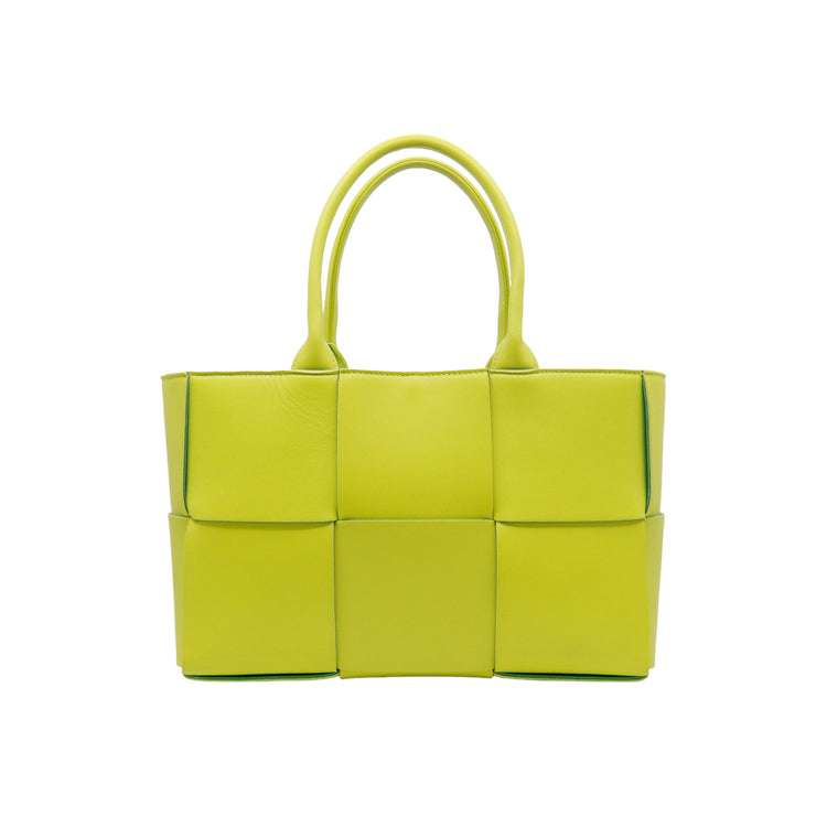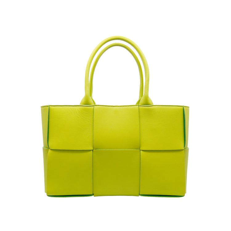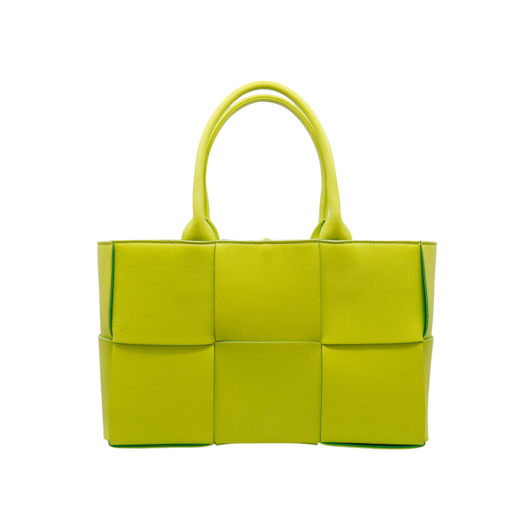 Bolso tipo tote Bottega Veneta Intrecciato de la línea Arco, confeccionado en piel color verde limón, bolso interno extraíble y forro en color verde, con 2 asas rígidas, pequeña mancha al interior.