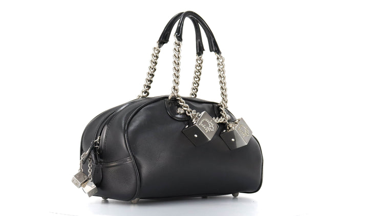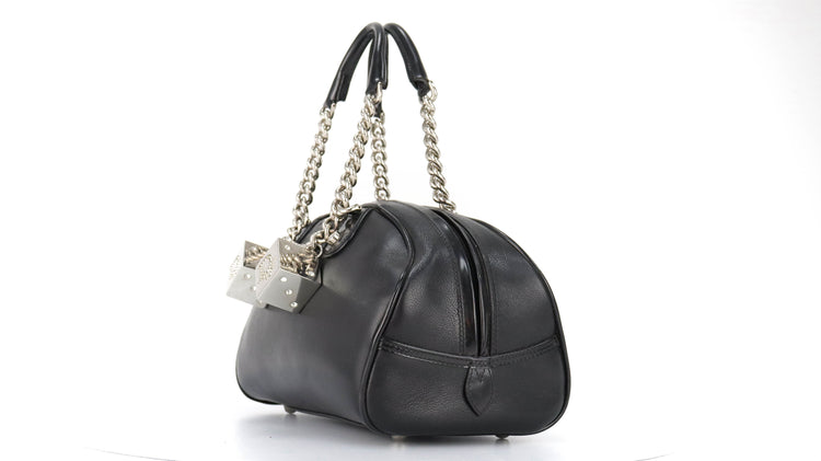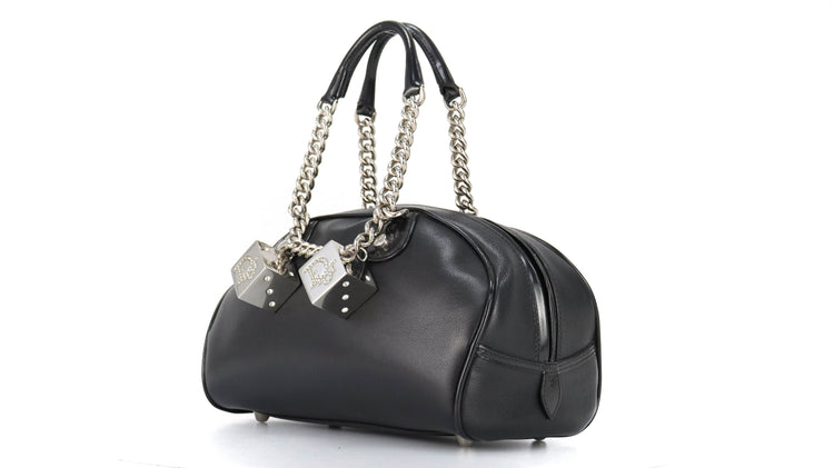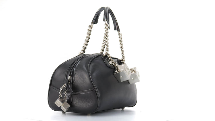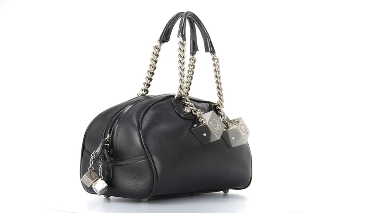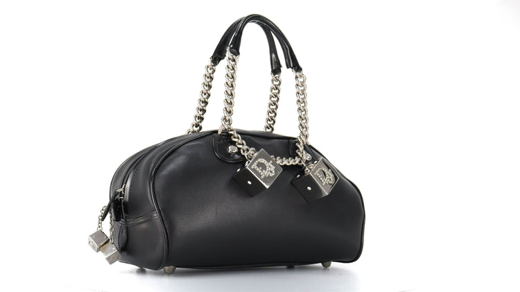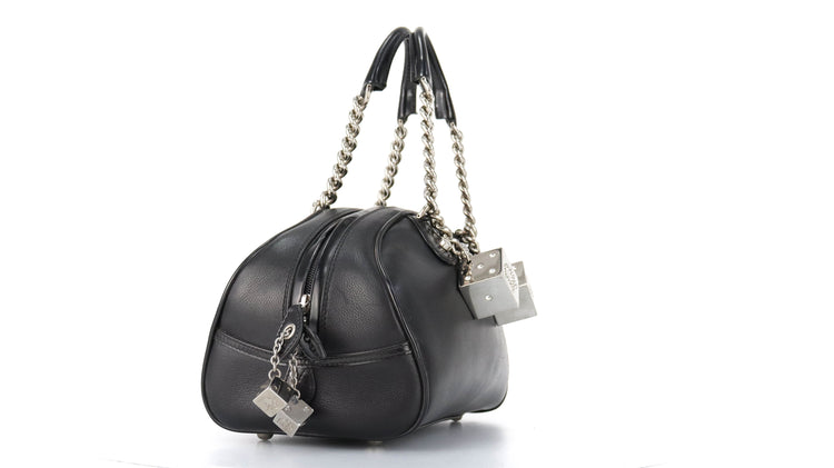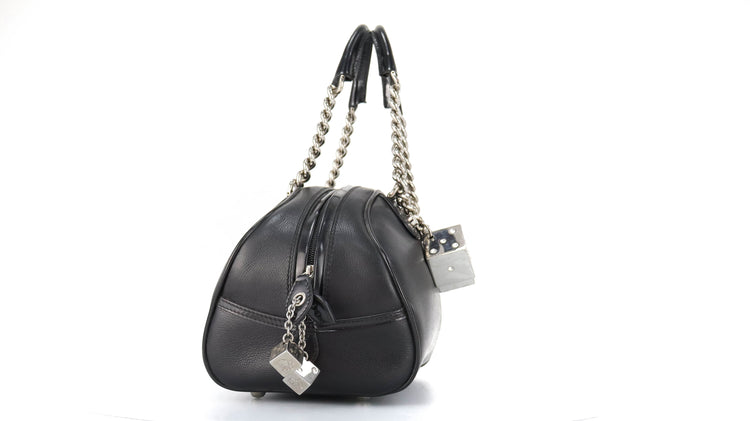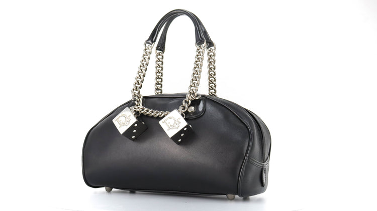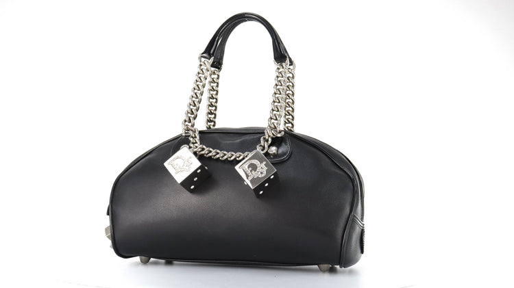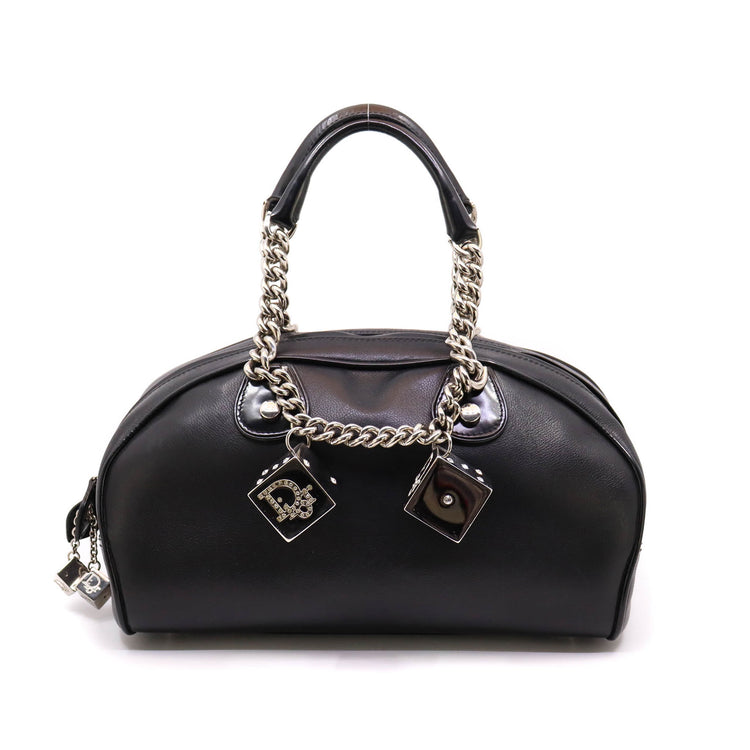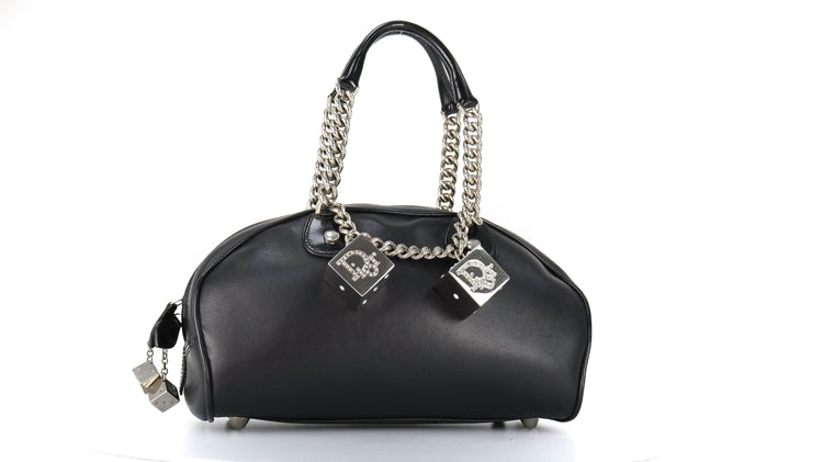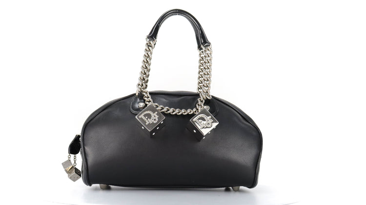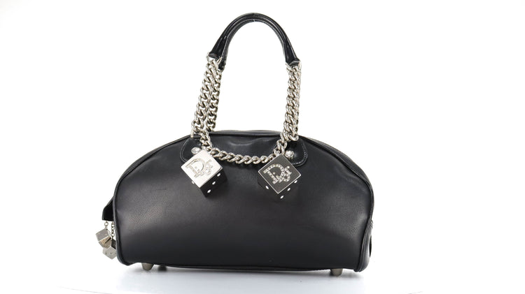 Increíble bolso de la marca Christian Dior, modelo Gambler Dice, confeccionado en piel de becerro color negro, forro y bolso interno en tela con el monograma de la marca, con cierre de cremallera interno y externo, herrajes en metal plateado, dados con sintéticos incrustados.