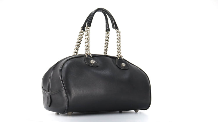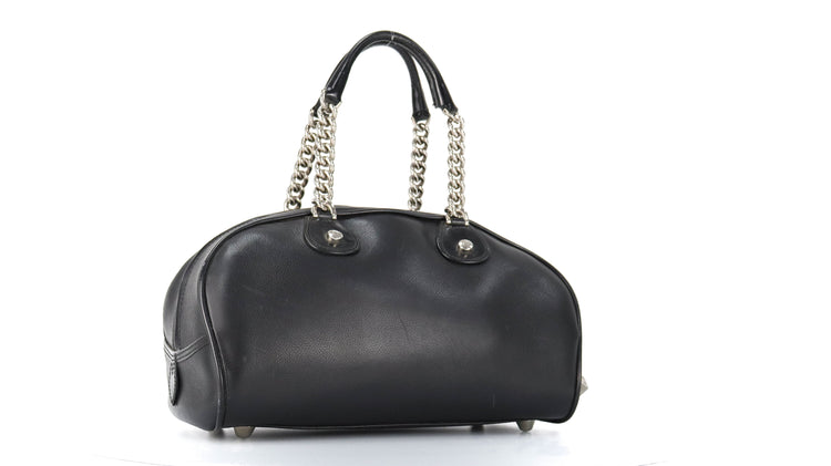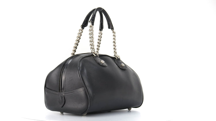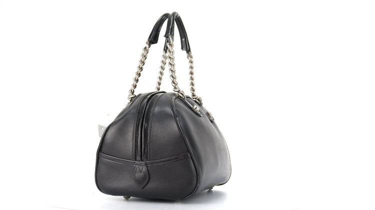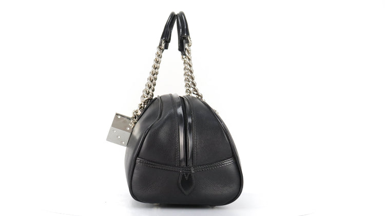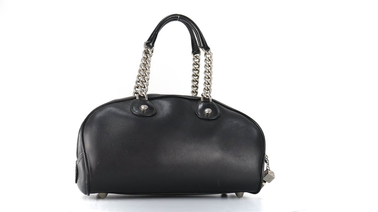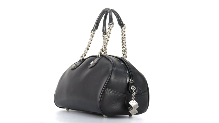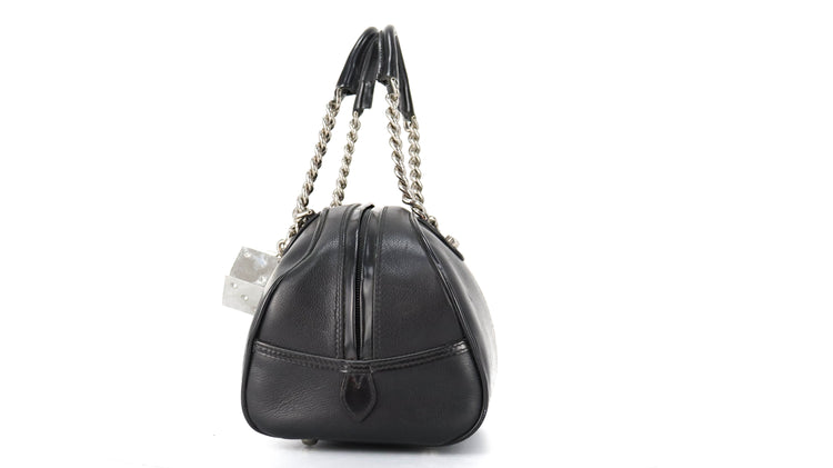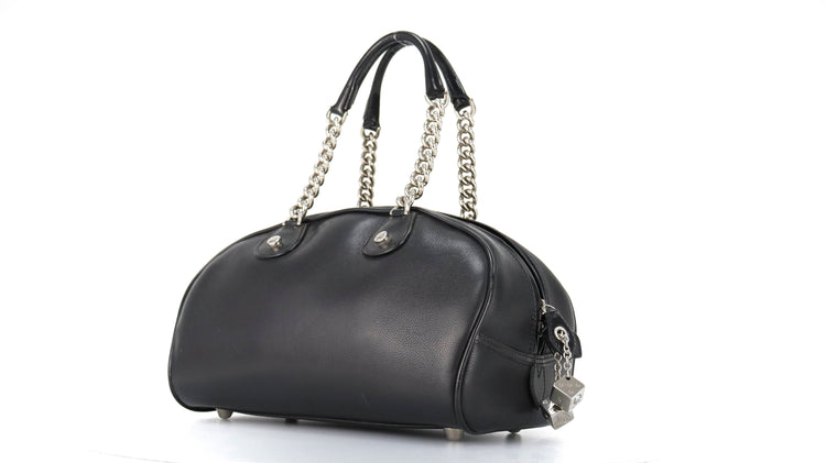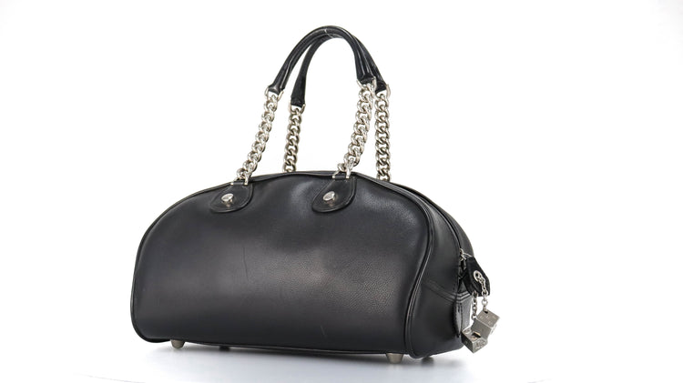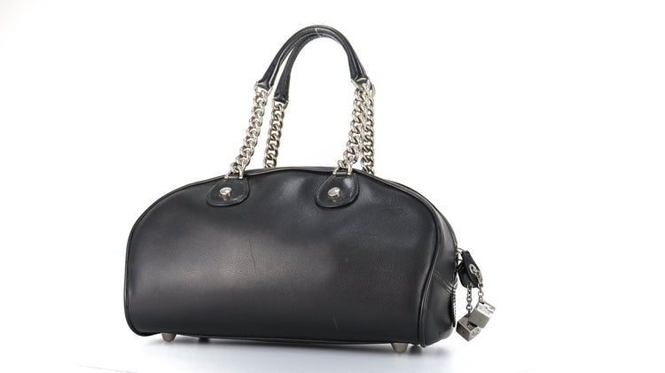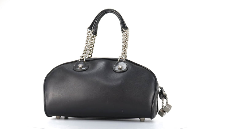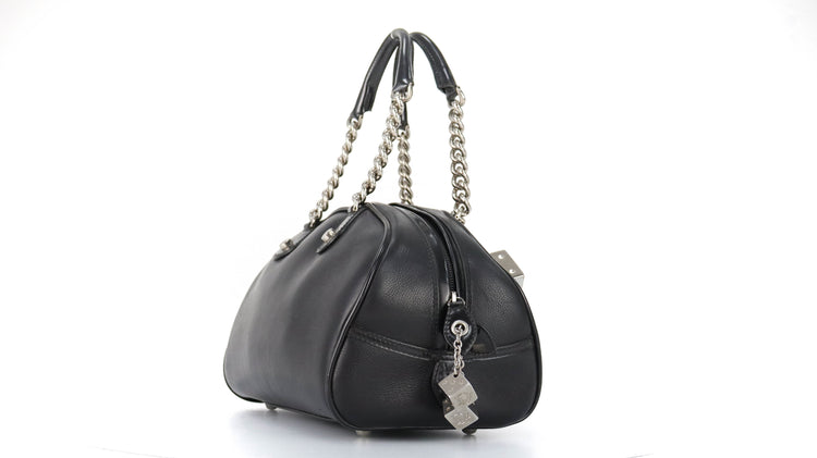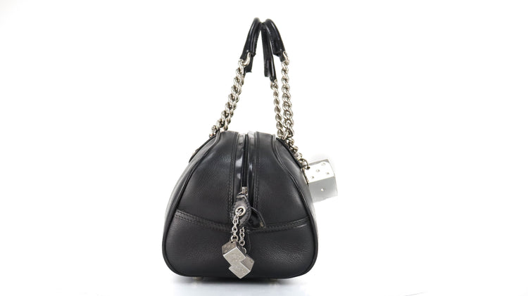 Increíble bolso de la marca Christian Dior, modelo Gambler Dice, confeccionado en piel de becerro color negro, forro y bolso interno en tela con el monograma de la marca, con cierre de cremallera interno y externo, herrajes en metal plateado, dados con sintéticos incrustados.