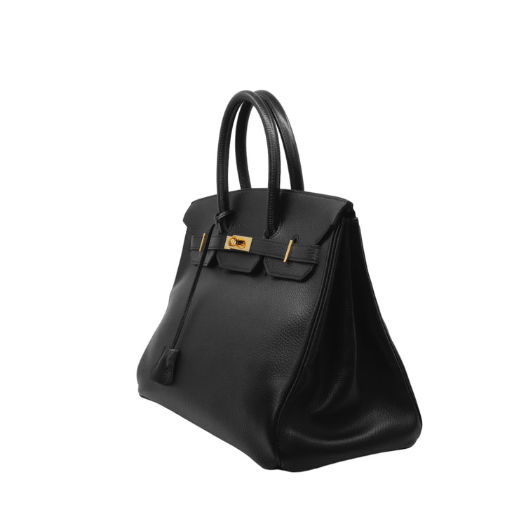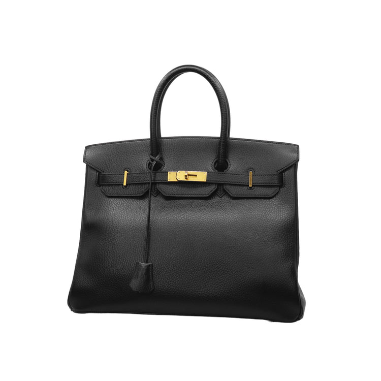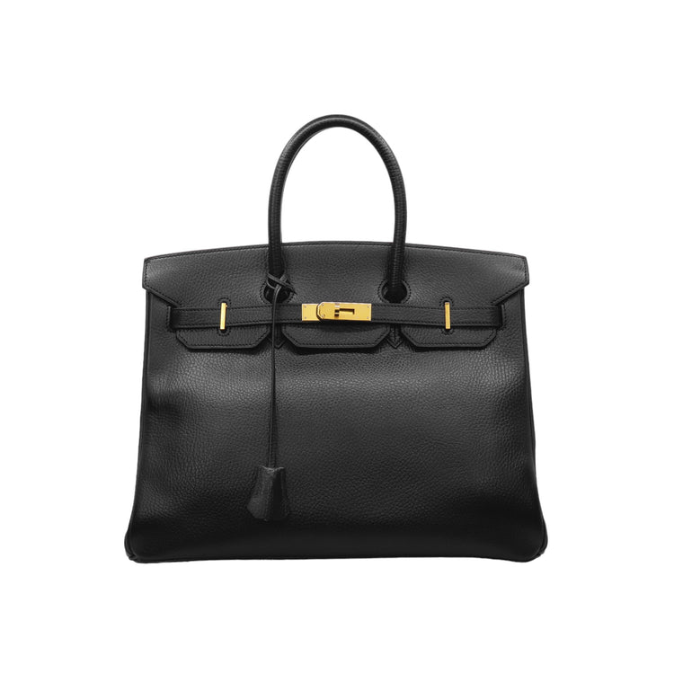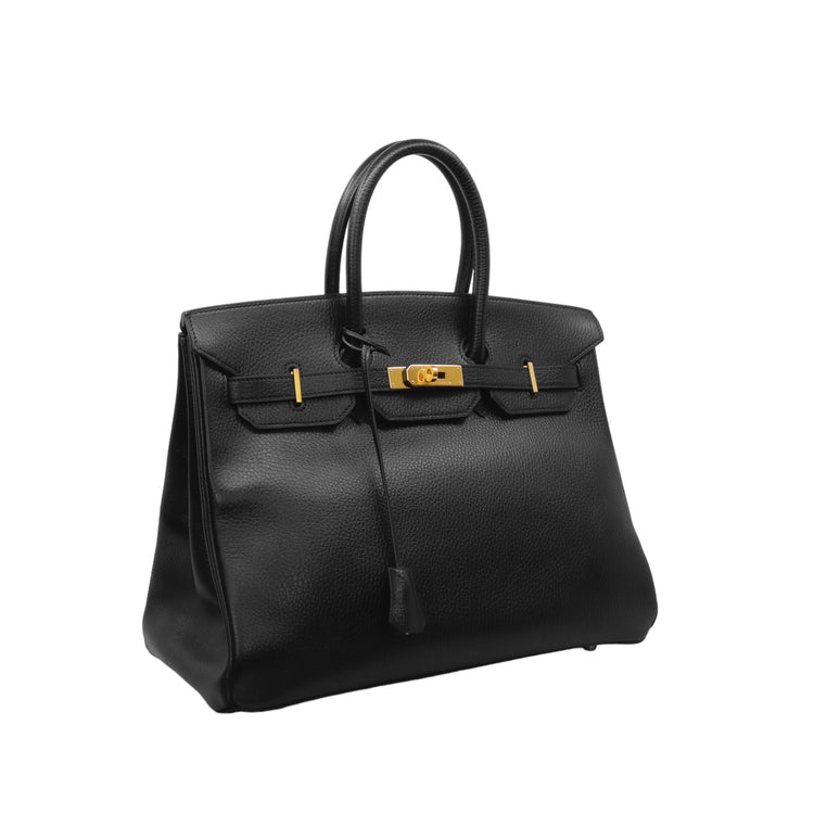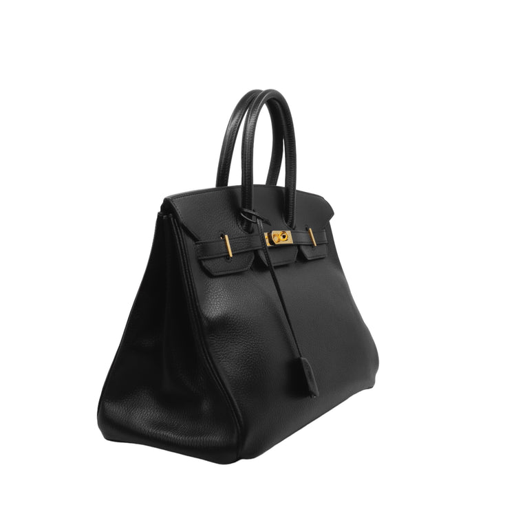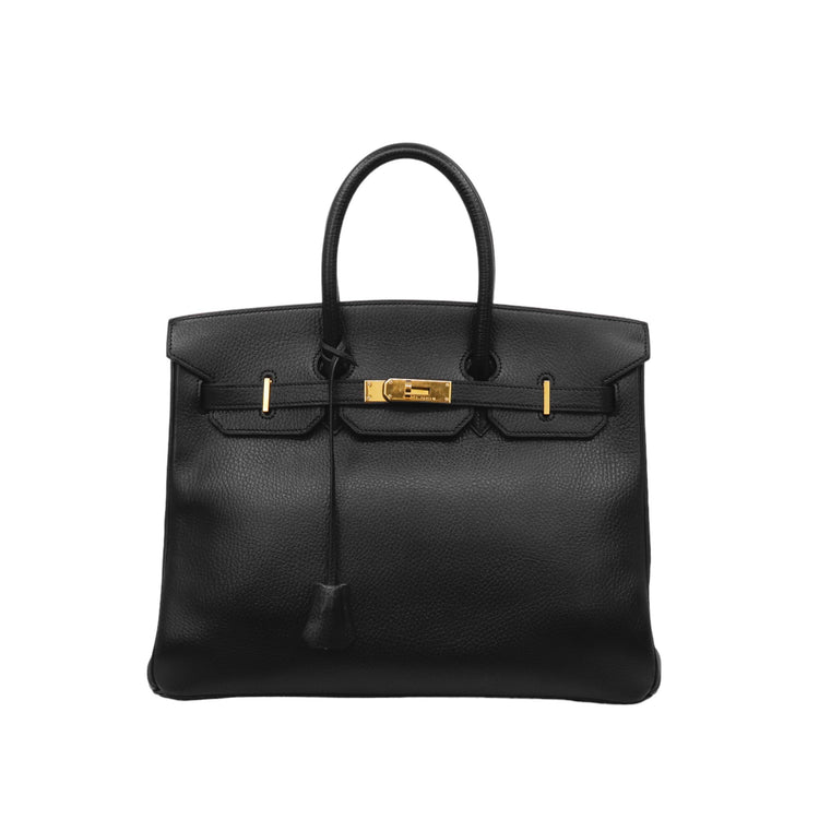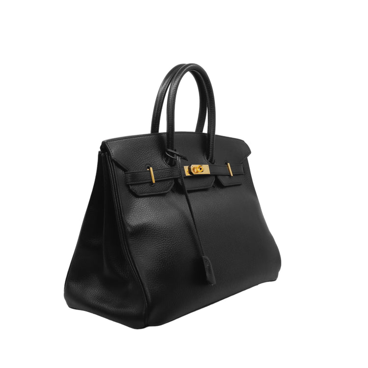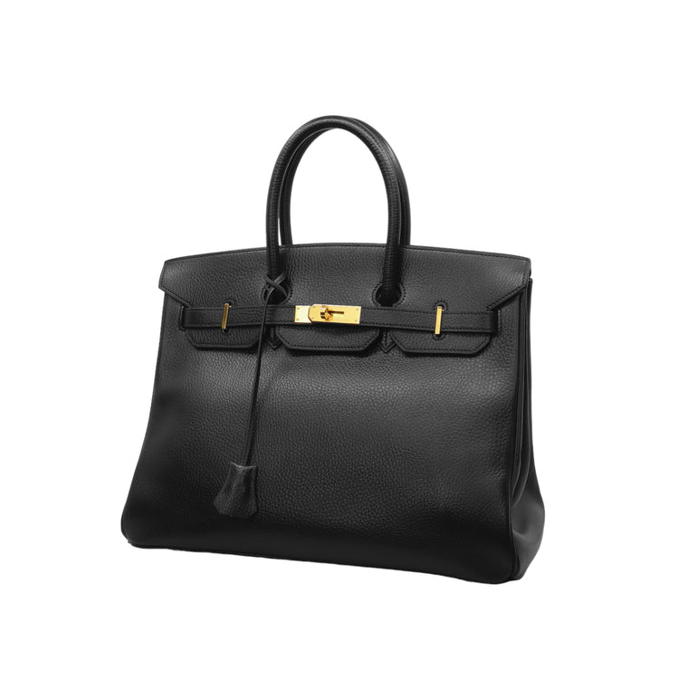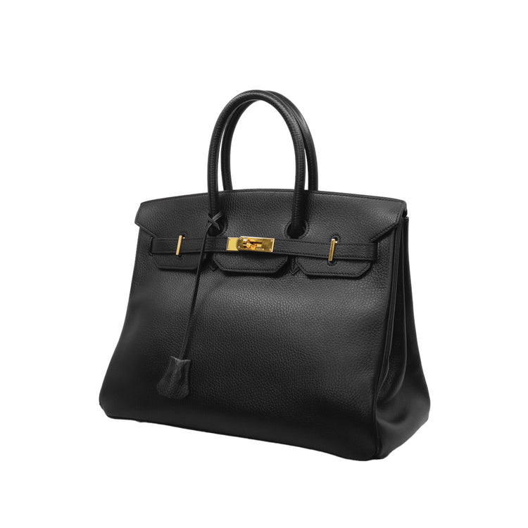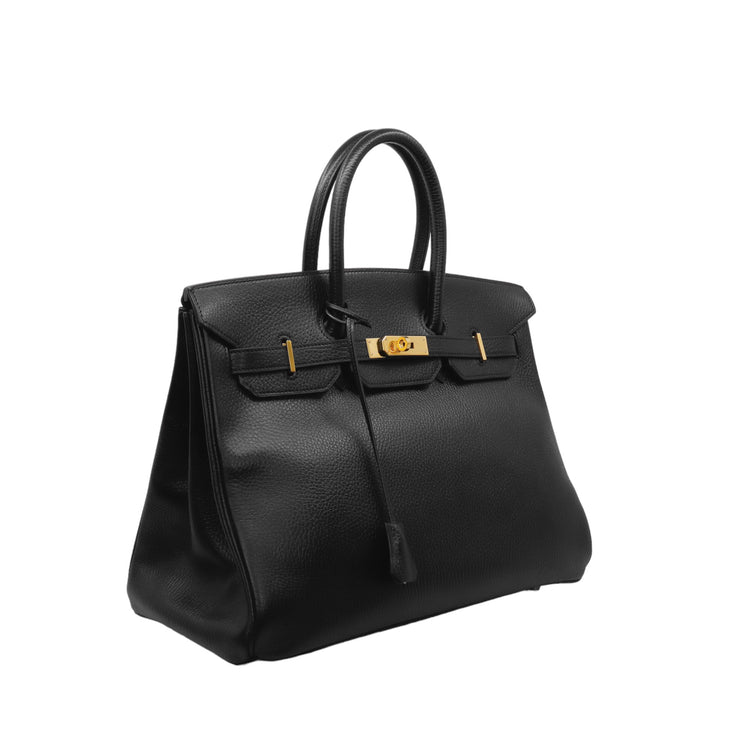 Bolso Hermés Birkin 35, confeccionado en suave piel de cordero color negro, con 2 asas tubulares rígidas, solapa al frente con herrajes y llave en color dorado, no incluye candado, placas con leves rayones.