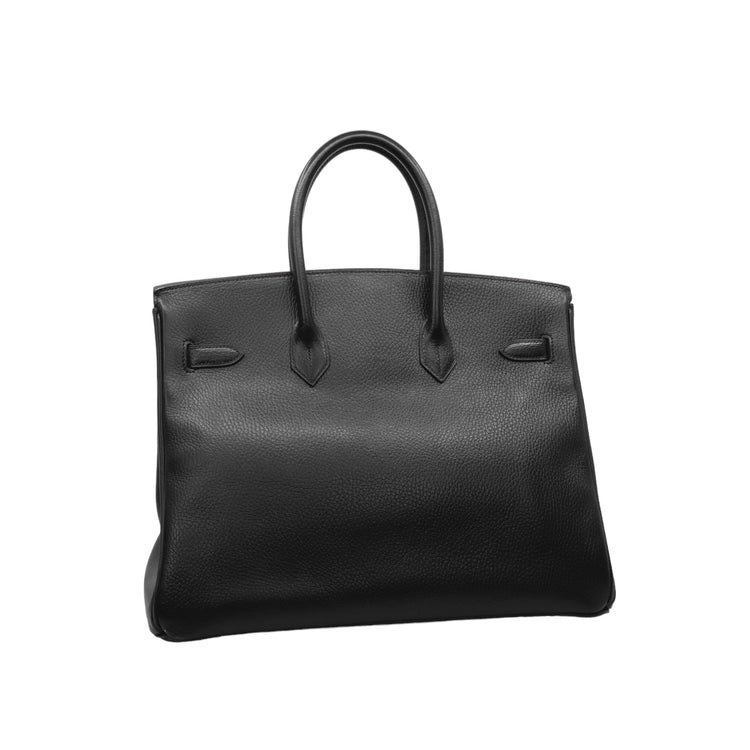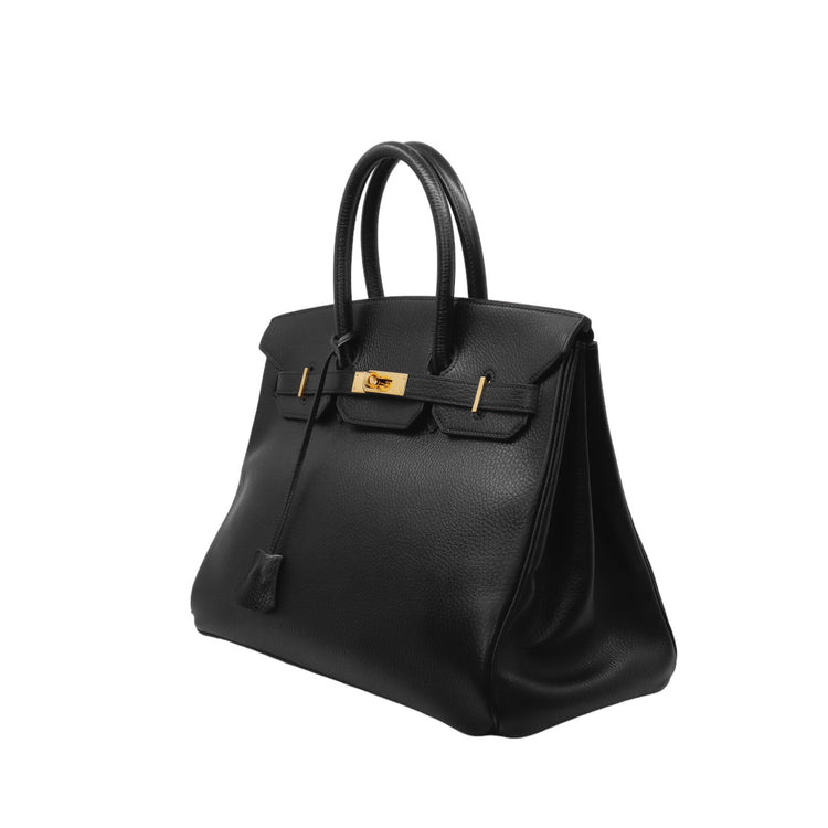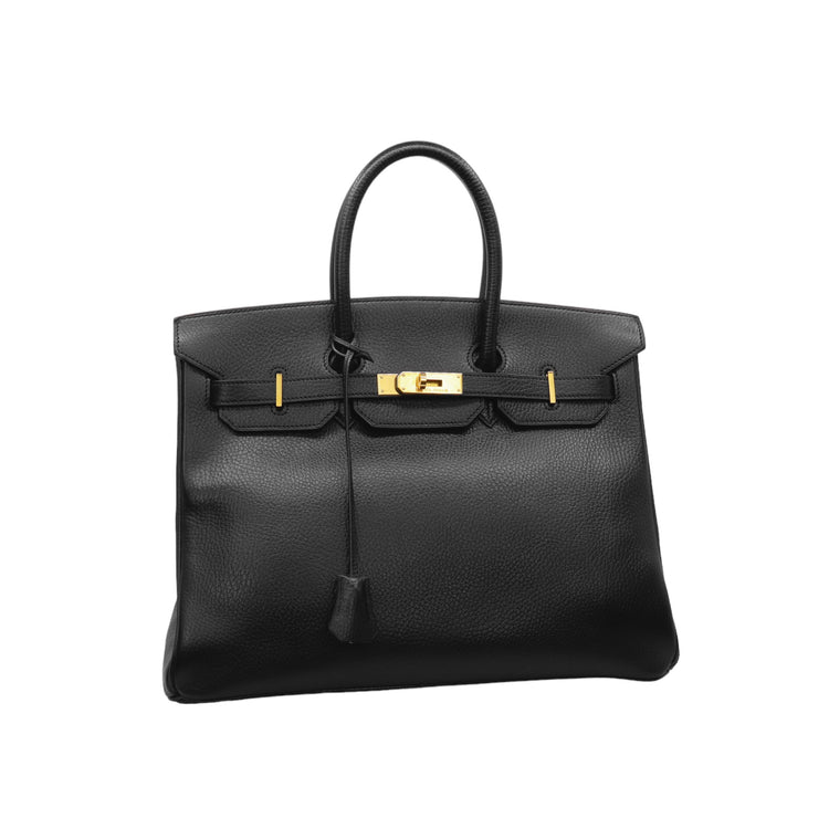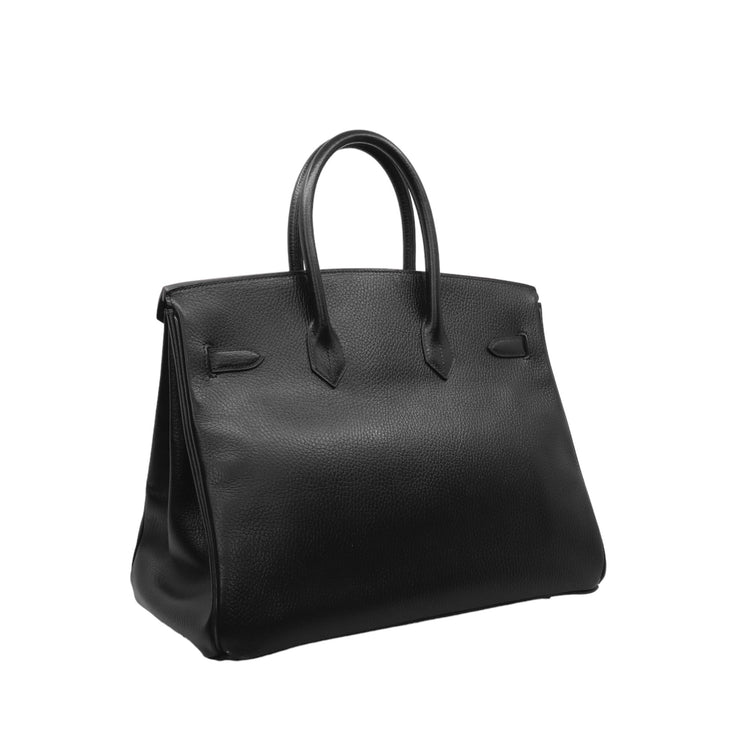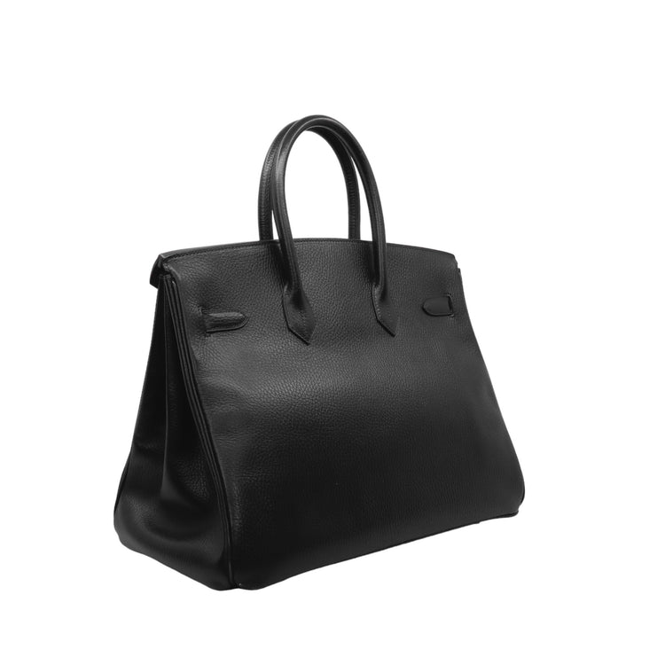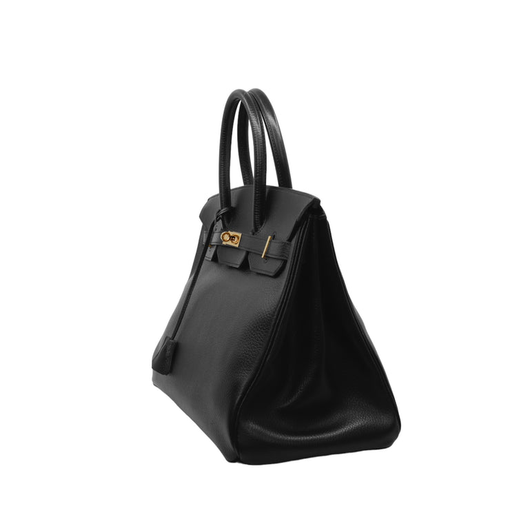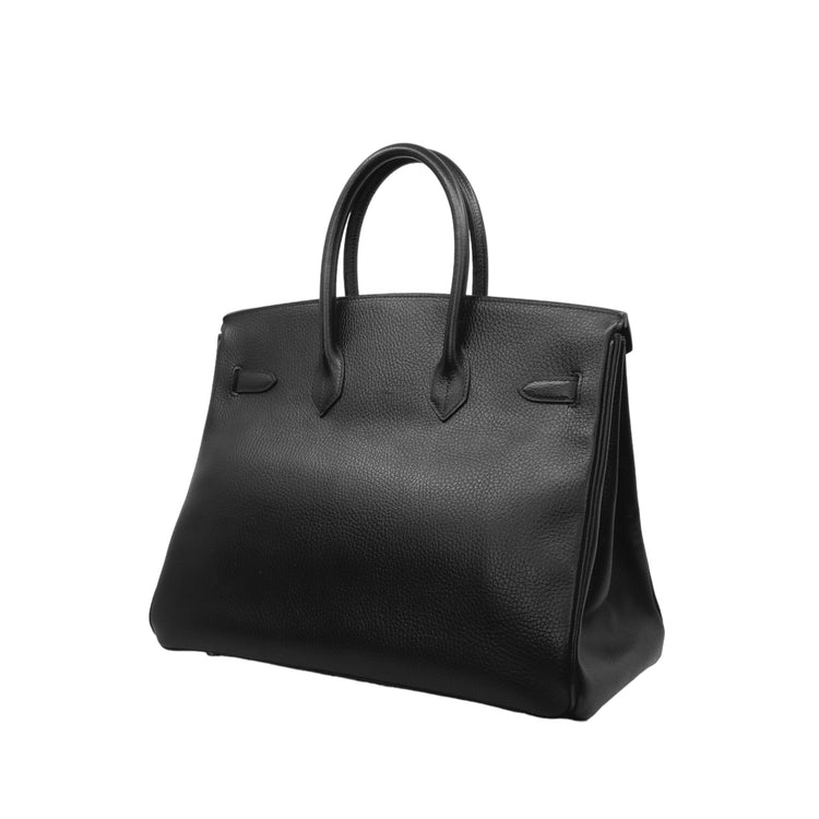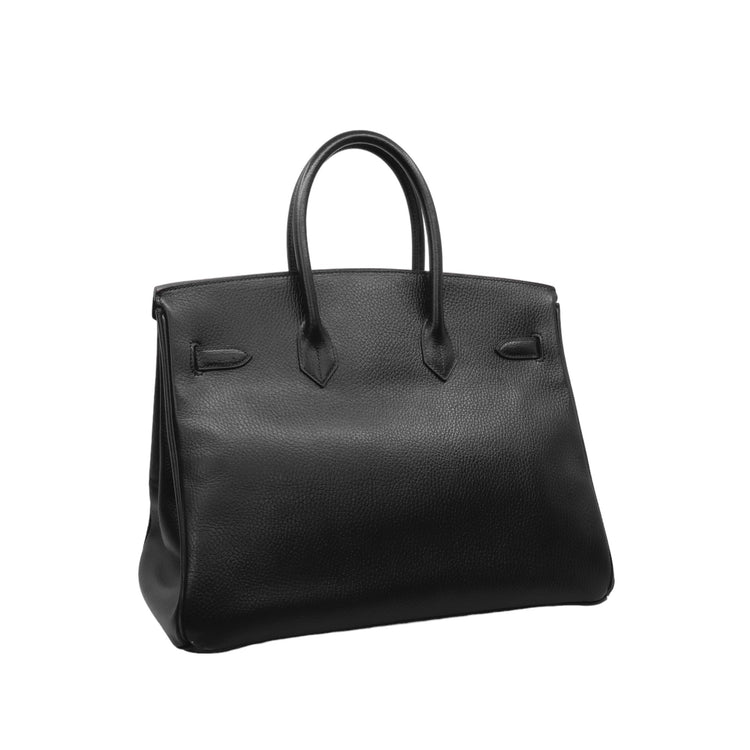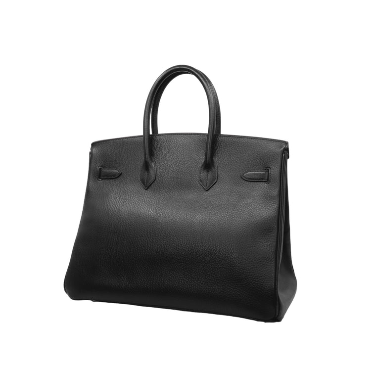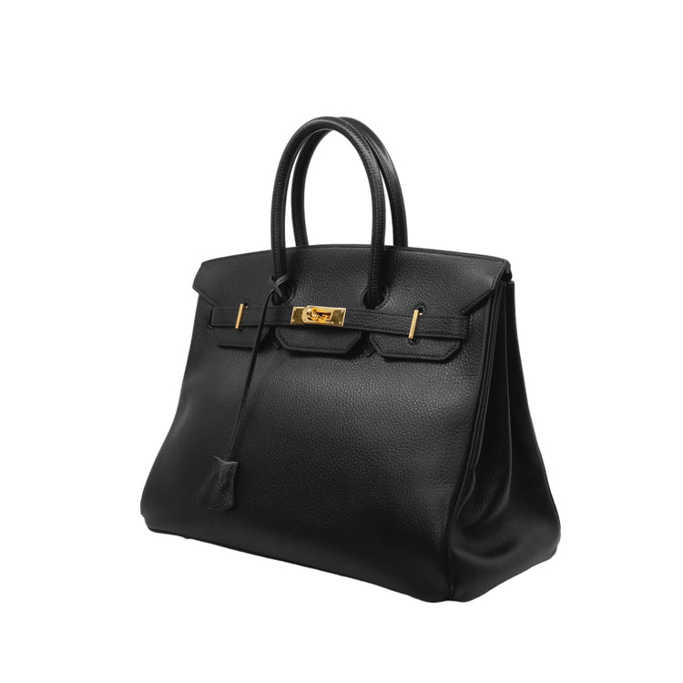 Bolso Hermés Birkin 35, confeccionado en suave piel de cordero color negro, con 2 asas tubulares rígidas, solapa al frente con herrajes y llave en color dorado, no incluye candado, placas con leves rayones.