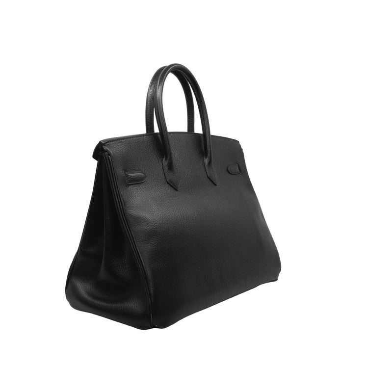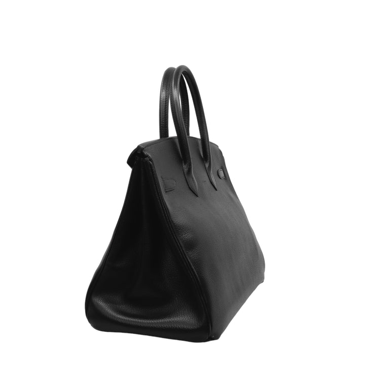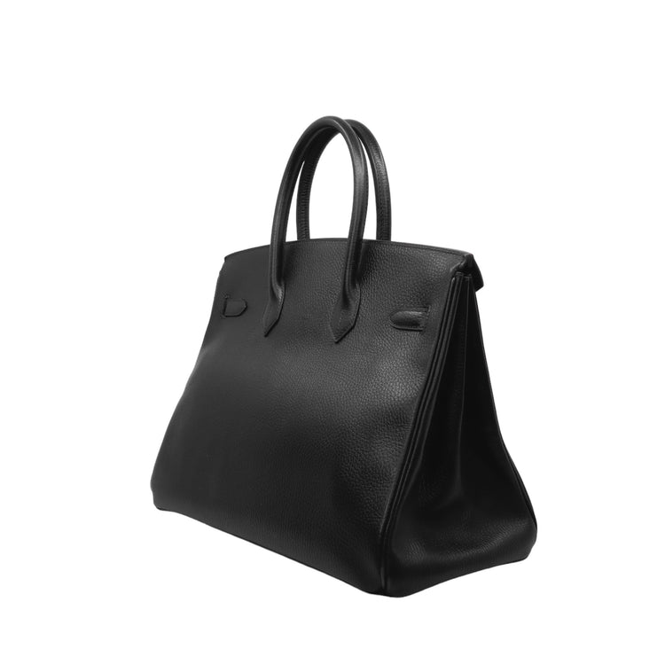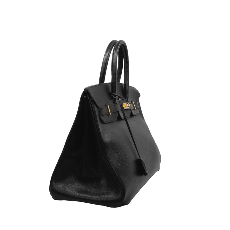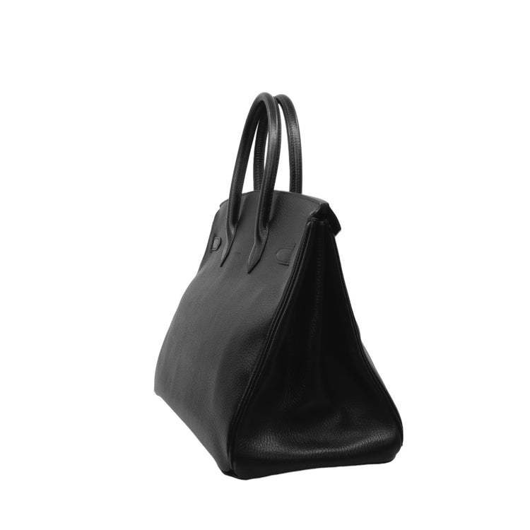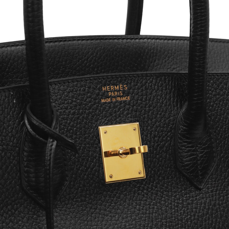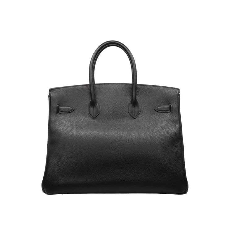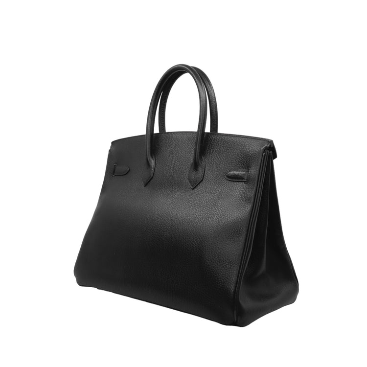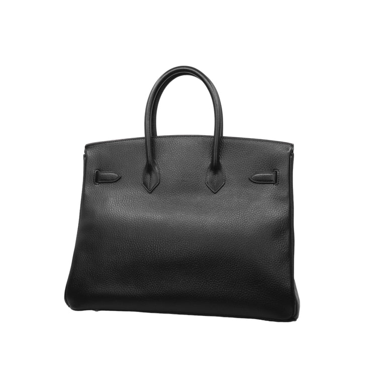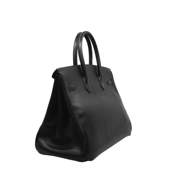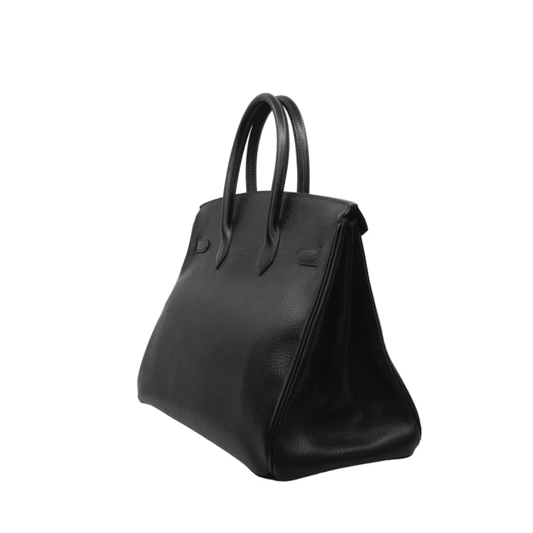 Bolso Hermés Birkin 35, confeccionado en suave piel de cordero color negro, con 2 asas tubulares rígidas, solapa al frente con herrajes y llave en color dorado, no incluye candado, placas con leves rayones.