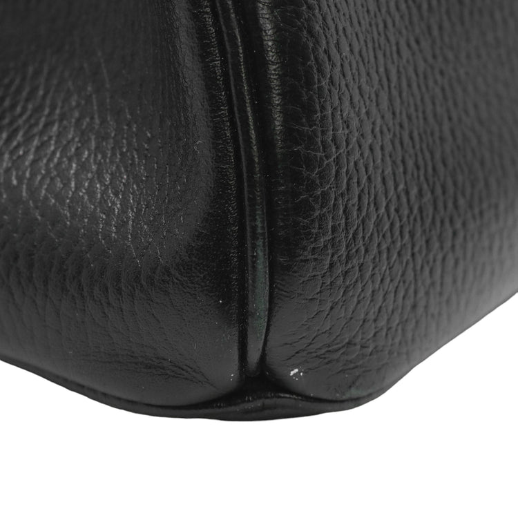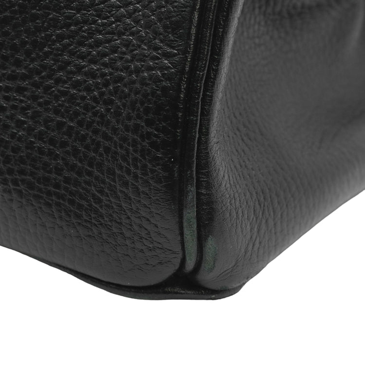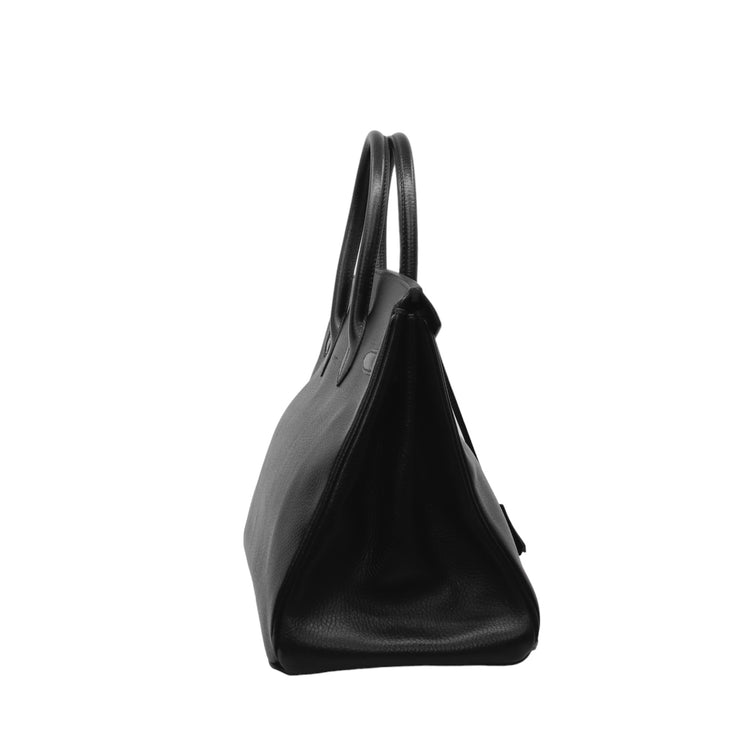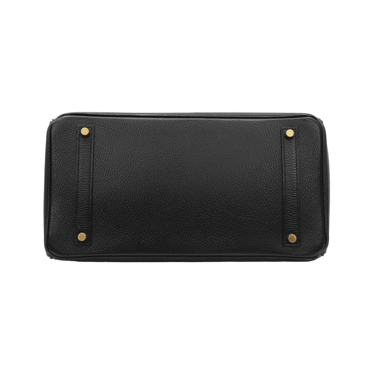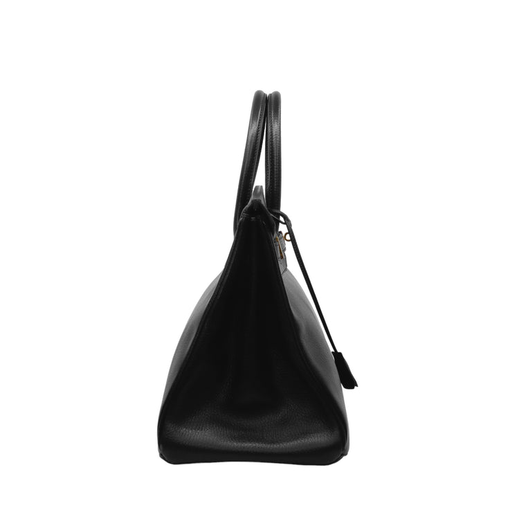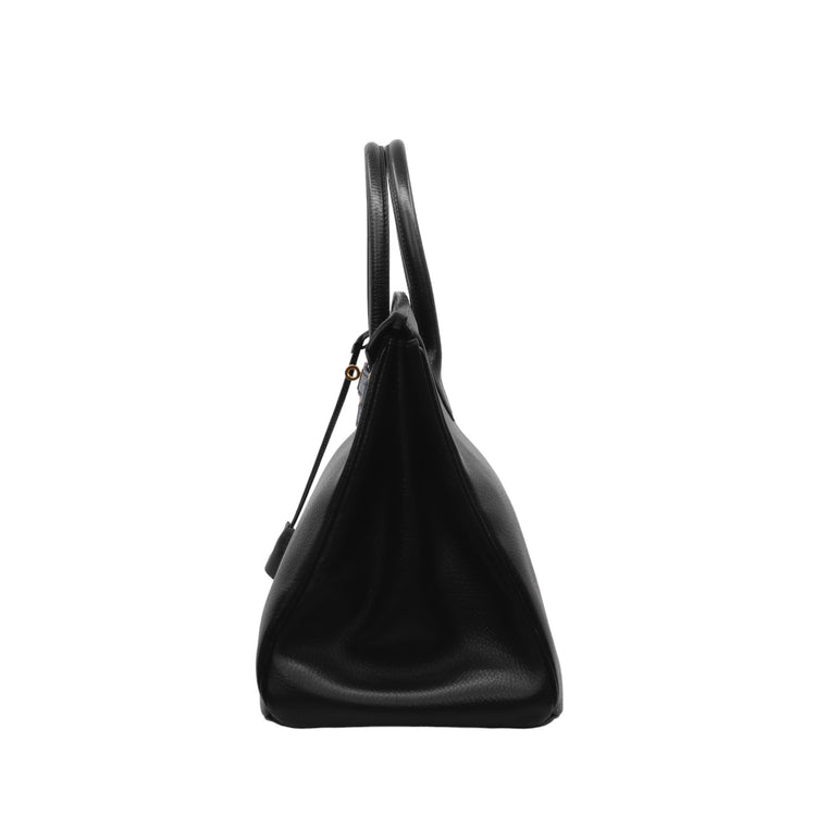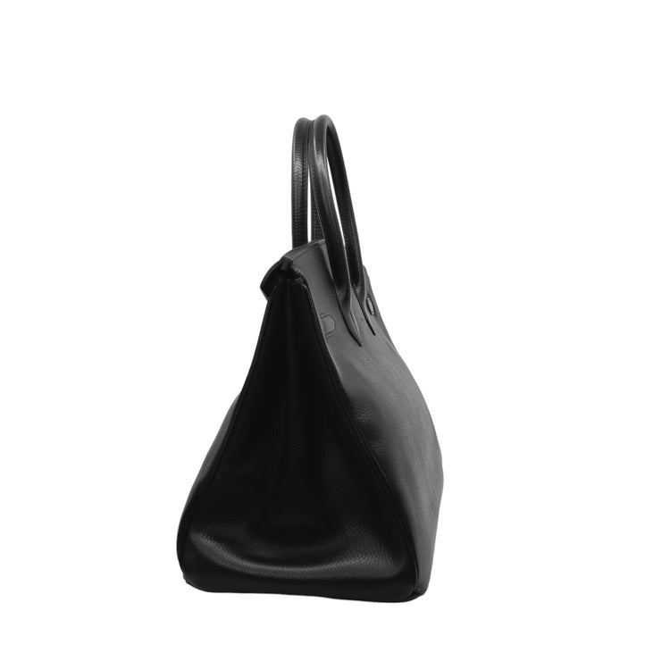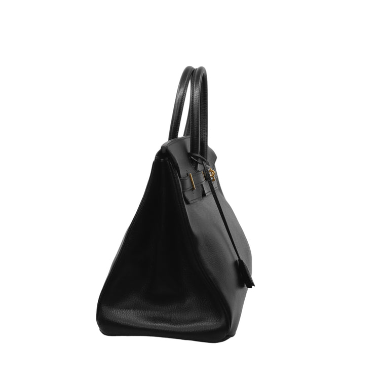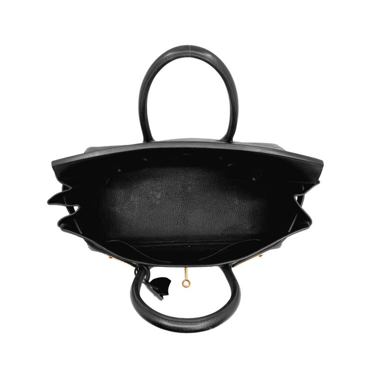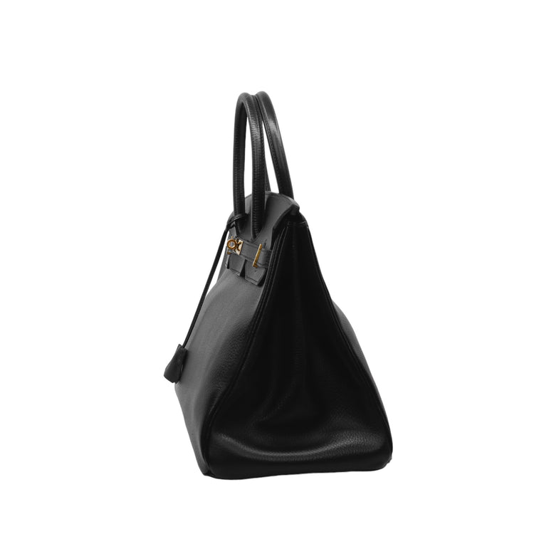 Bolso Hermés Birkin 35, confeccionado en suave piel de cordero color negro, con 2 asas tubulares rígidas, solapa al frente con herrajes y llave en color dorado, no incluye candado, placas con leves rayones.