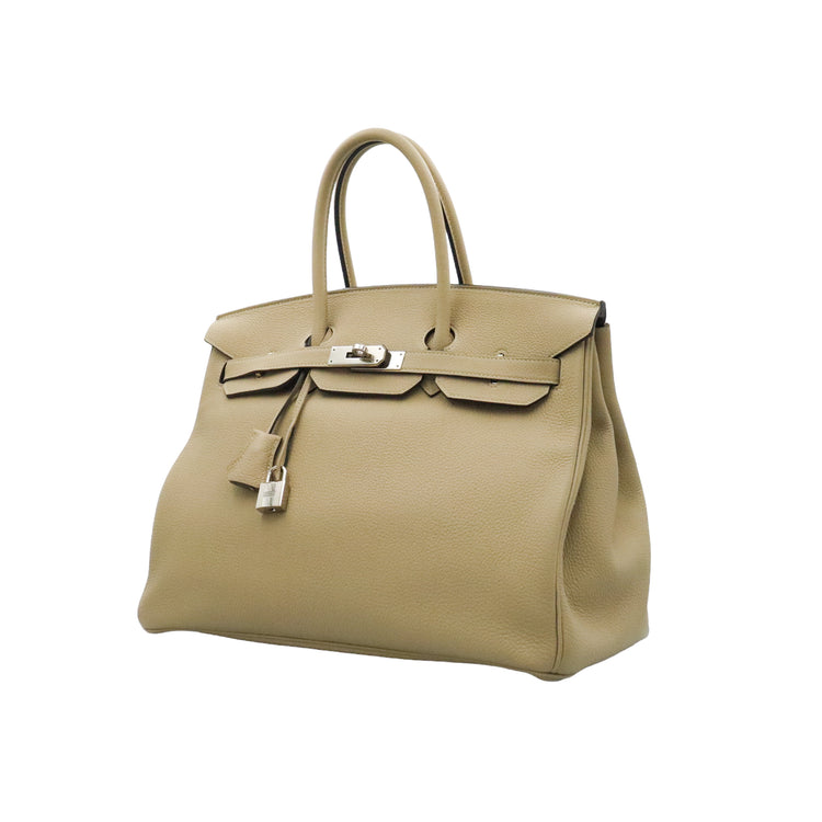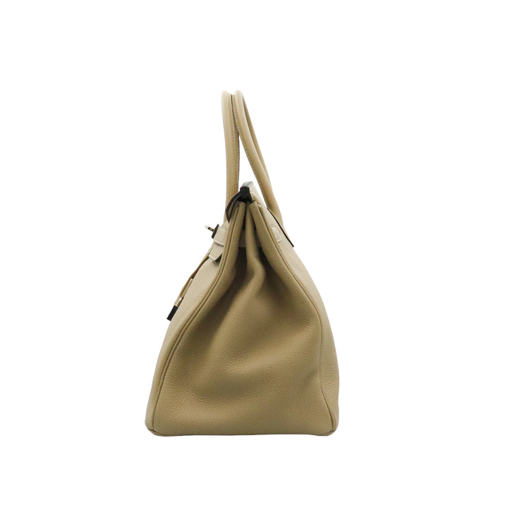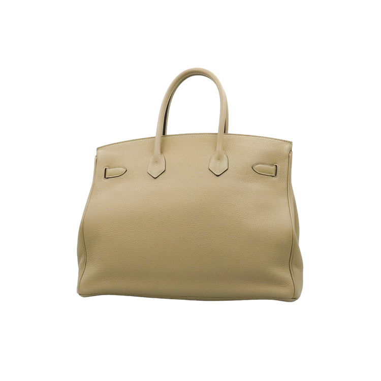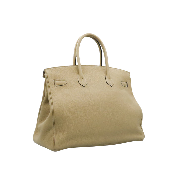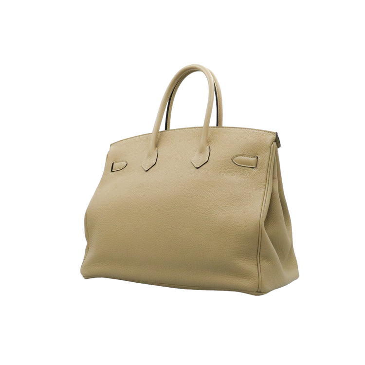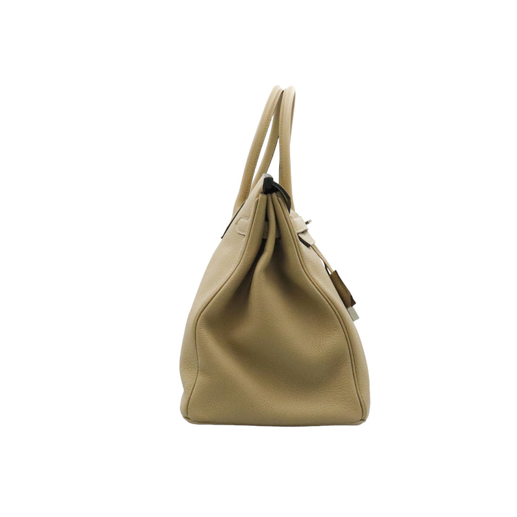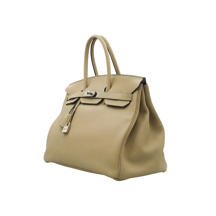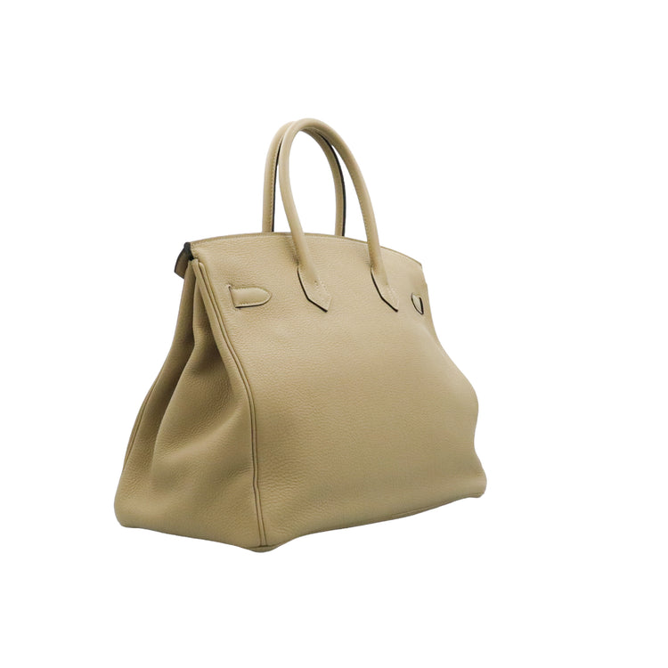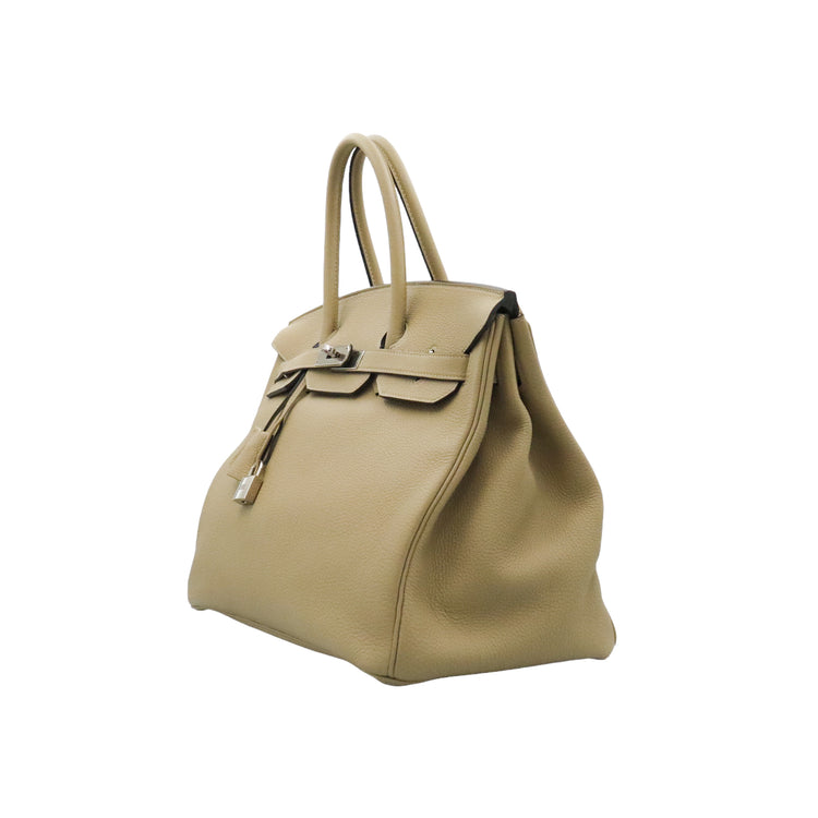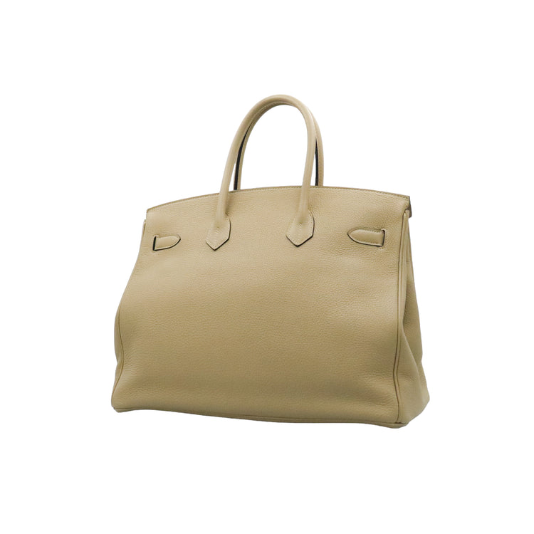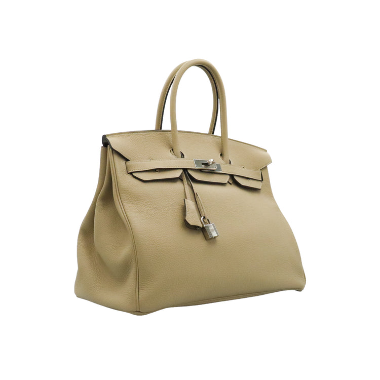 Bolso Hermés Birkin 35, confeccionado en suave piel de cordero color beige, con 2 asas tubulares rígidas, solapa al frente con herrajes, candado y llave en color plateado.