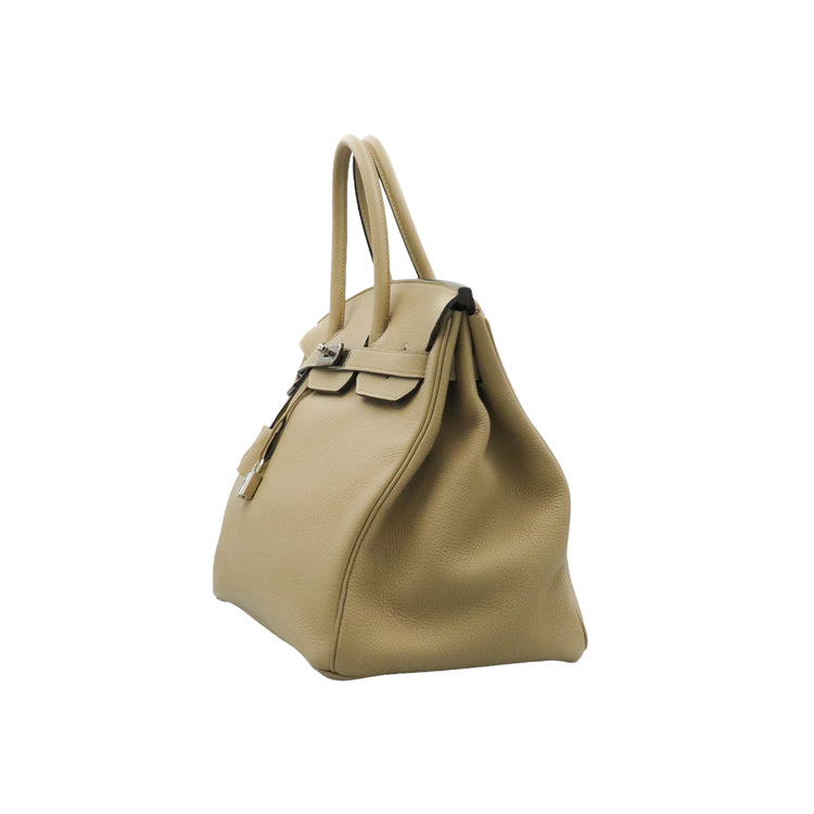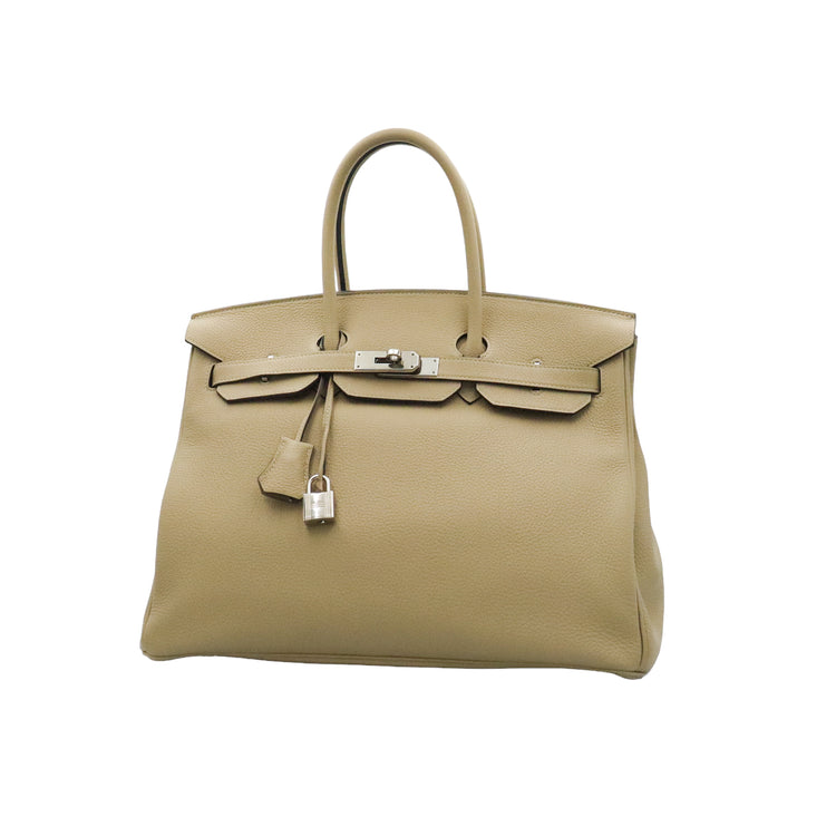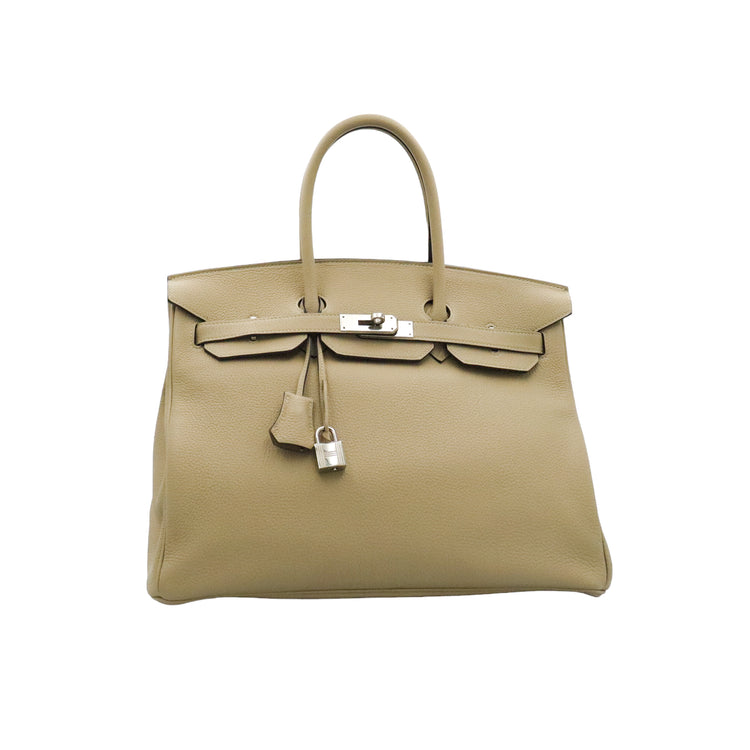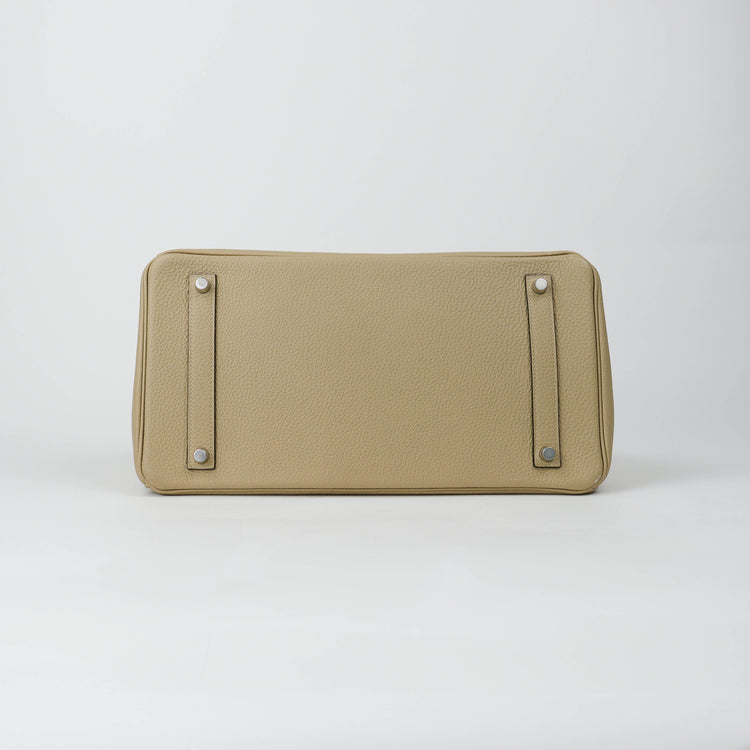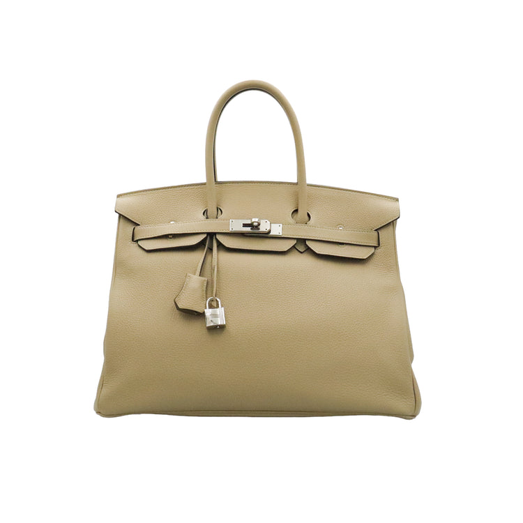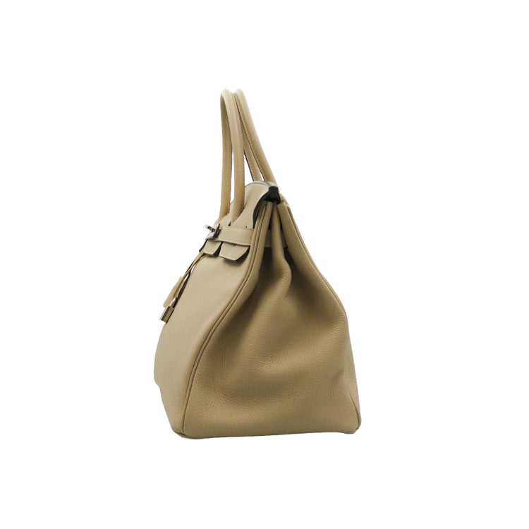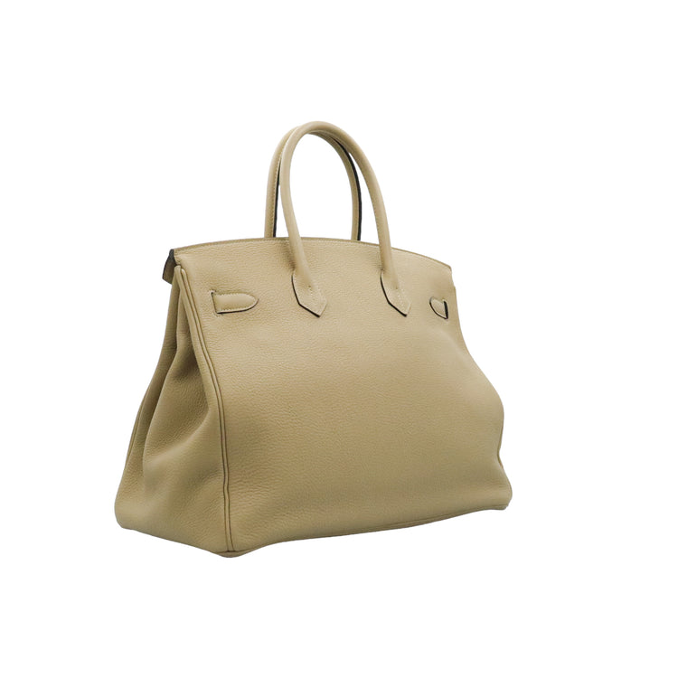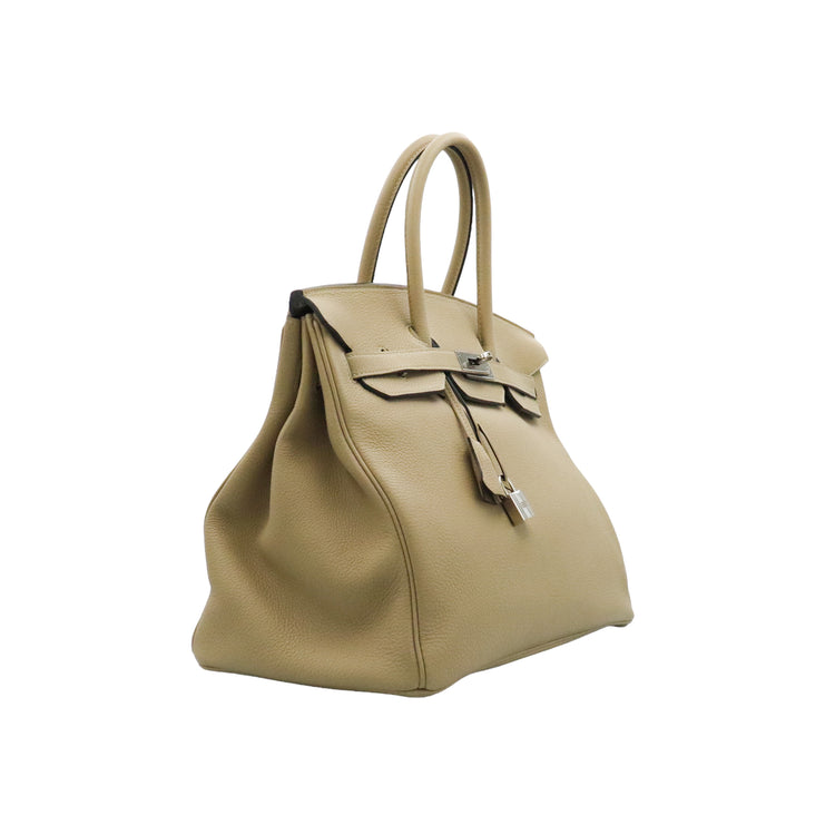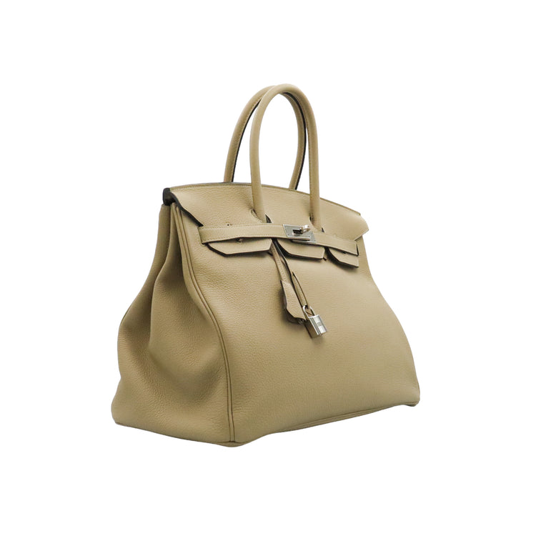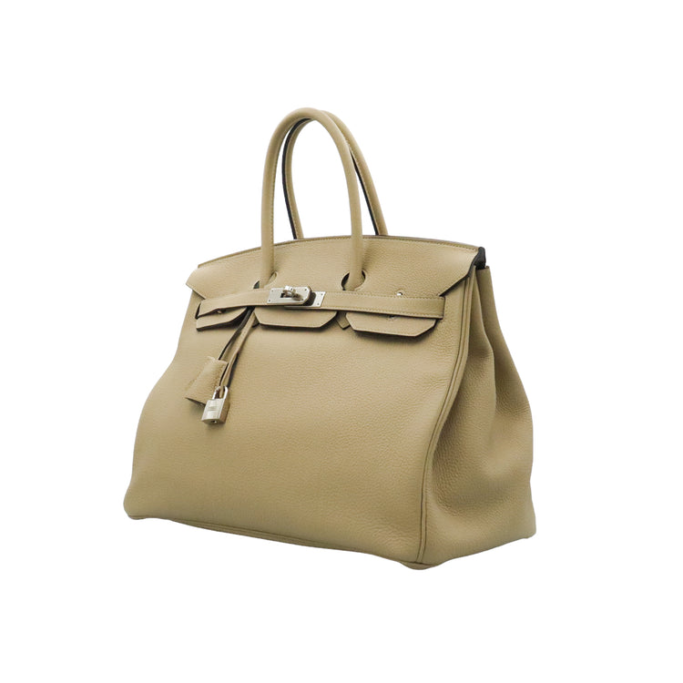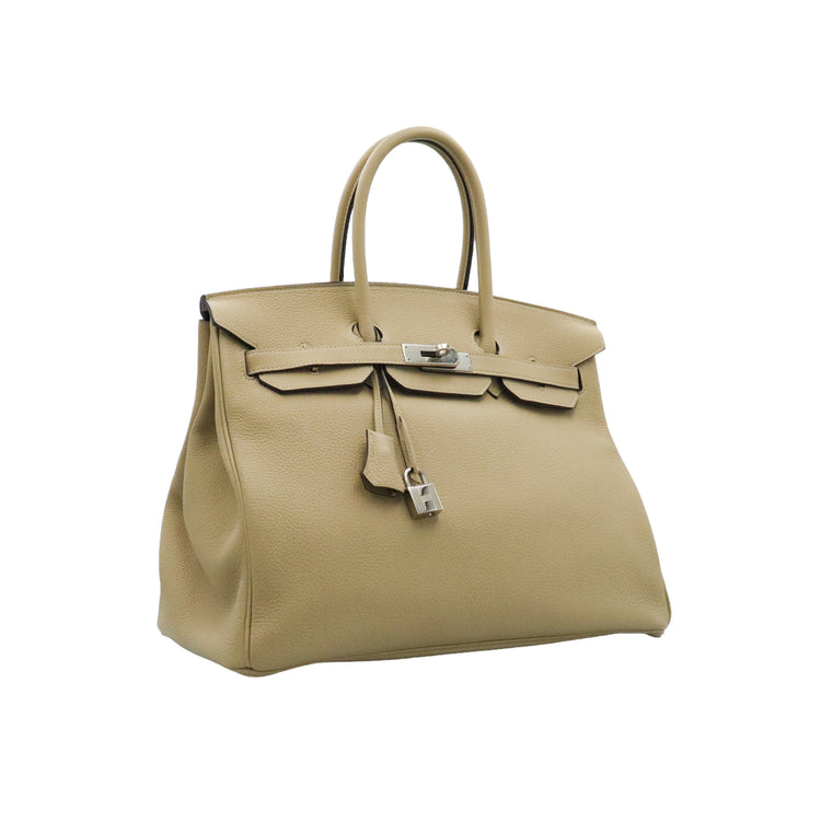 Bolso Hermés Birkin 35, confeccionado en suave piel de cordero color beige, con 2 asas tubulares rígidas, solapa al frente con herrajes, candado y llave en color plateado.