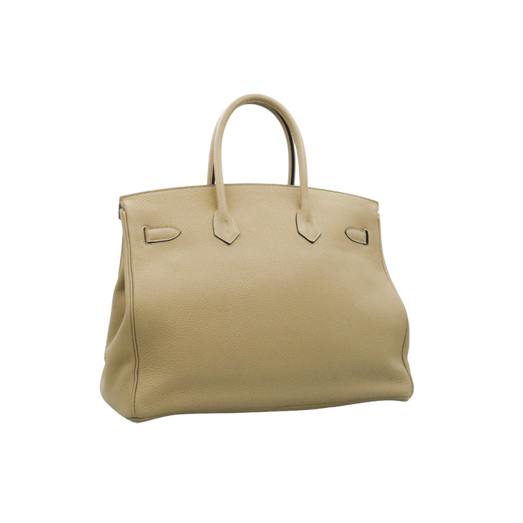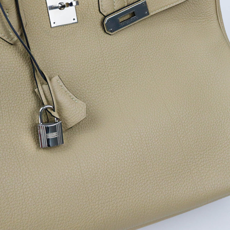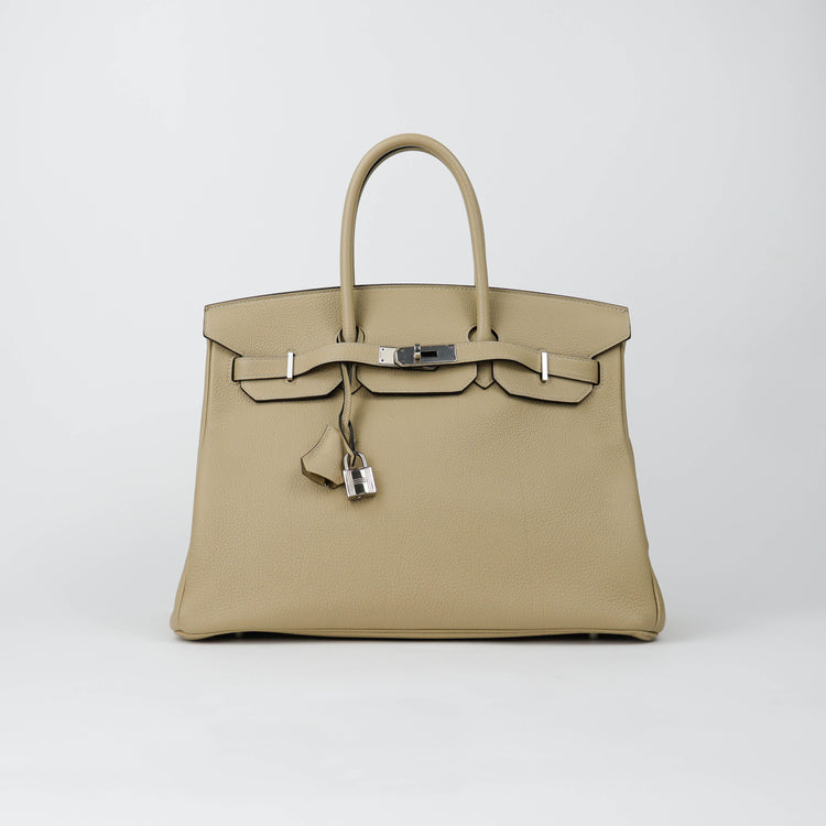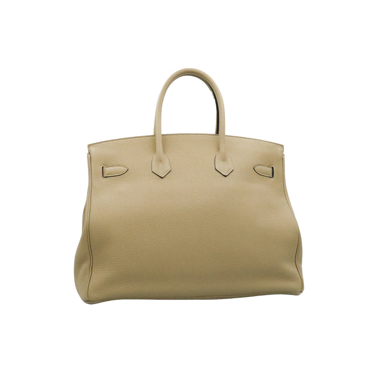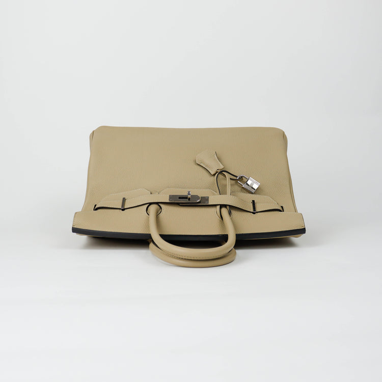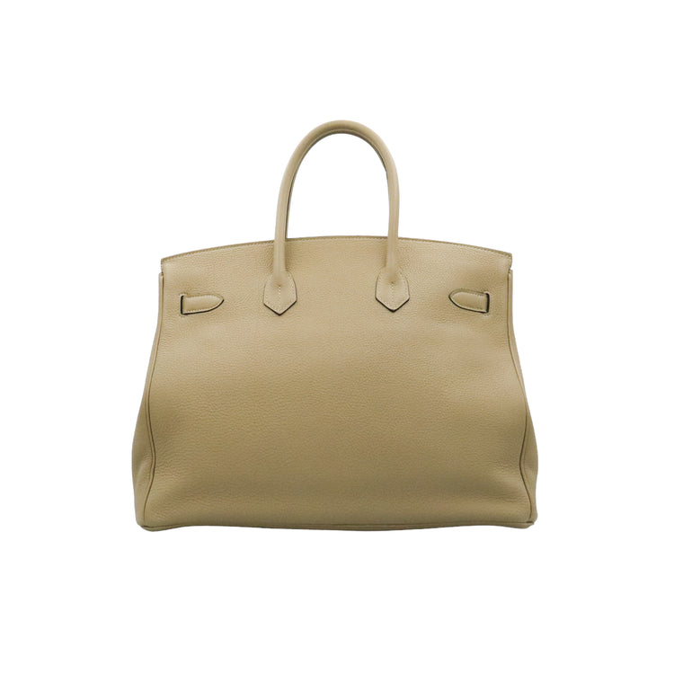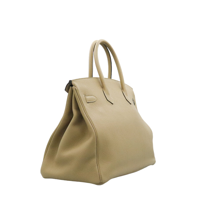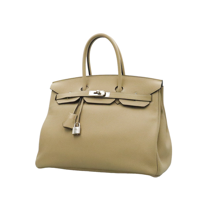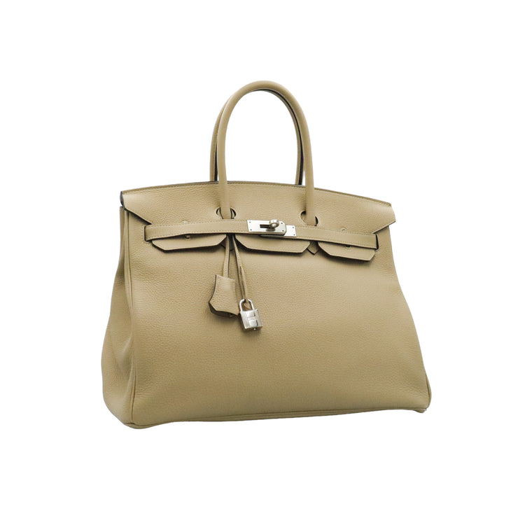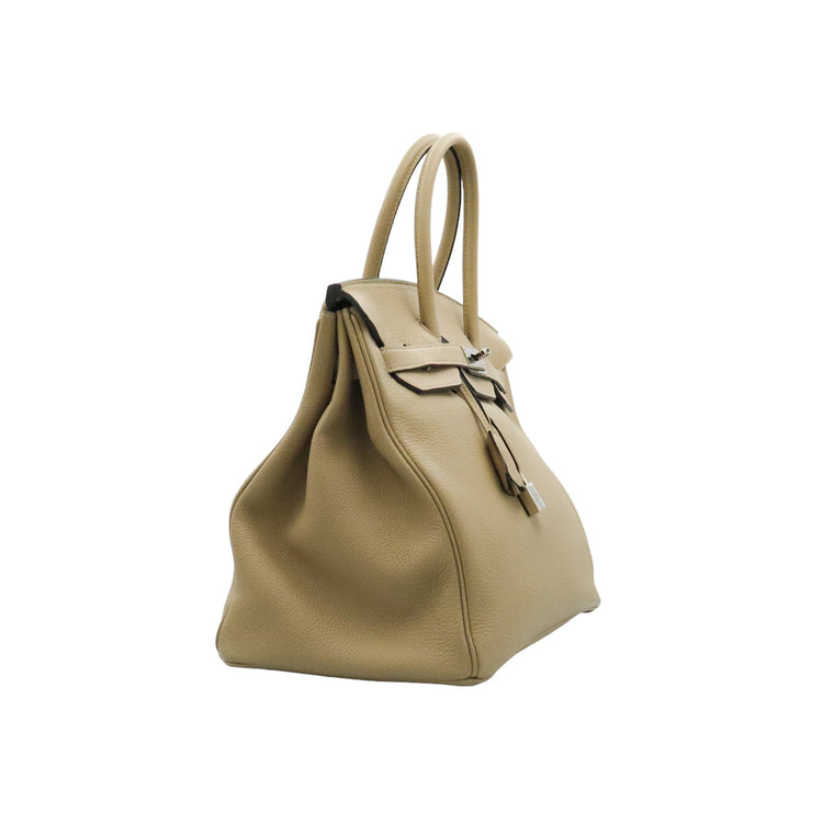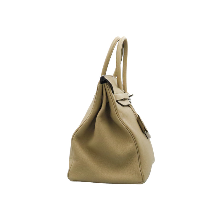 Bolso Hermés Birkin 35, confeccionado en suave piel de cordero color beige, con 2 asas tubulares rígidas, solapa al frente con herrajes, candado y llave en color plateado.