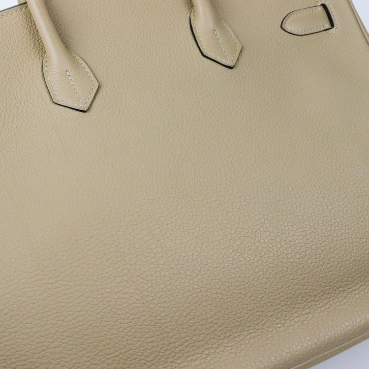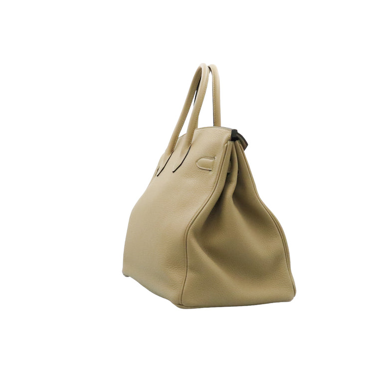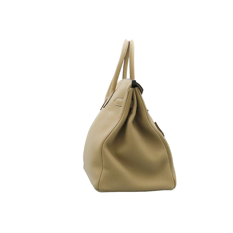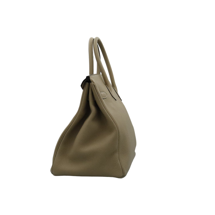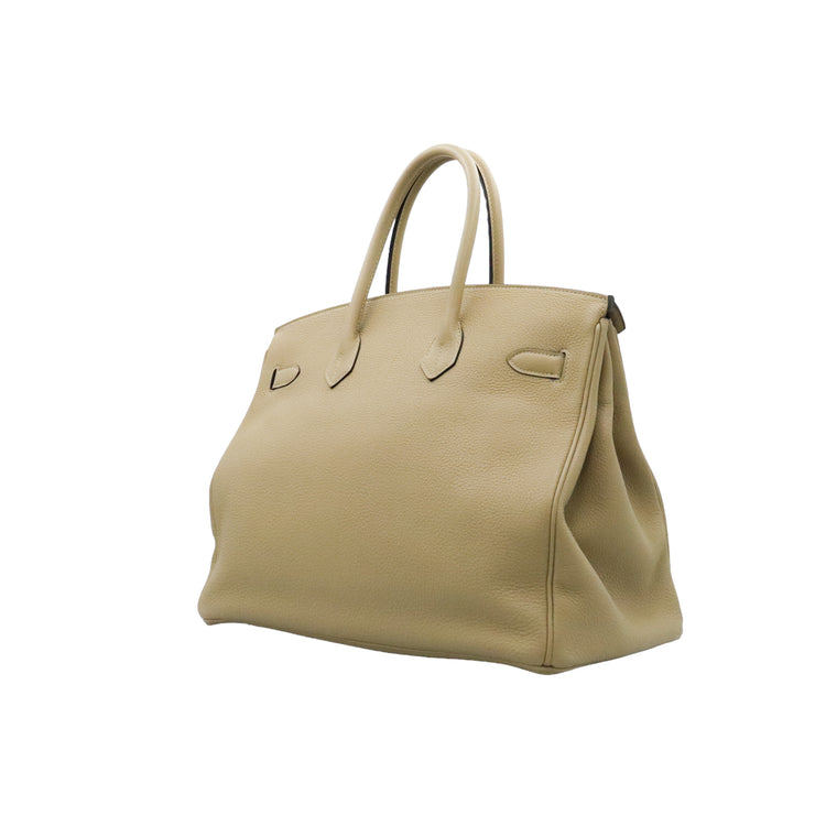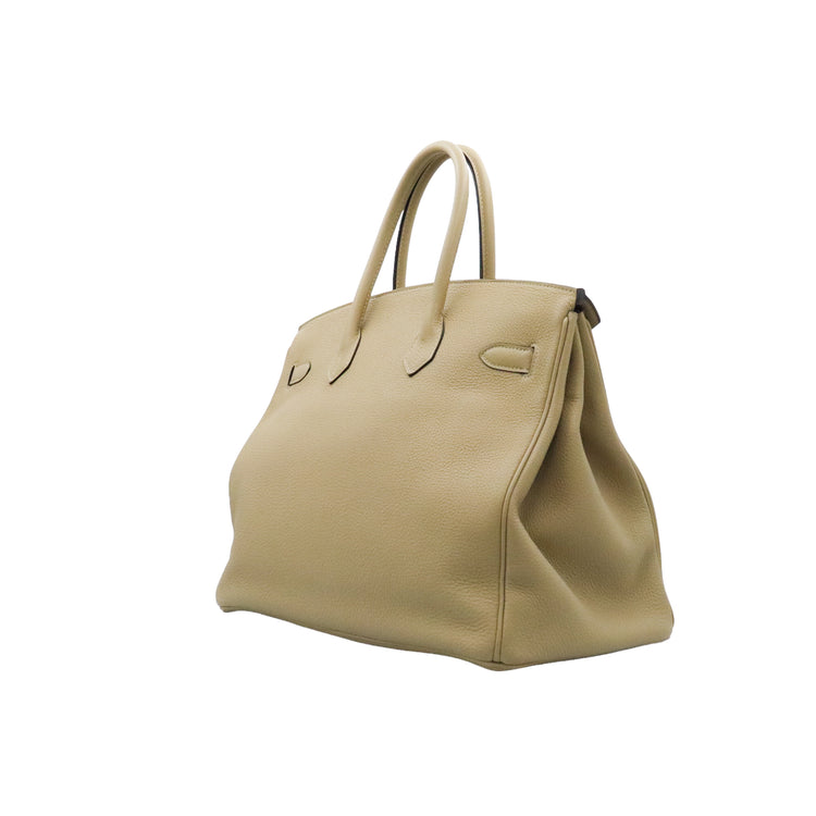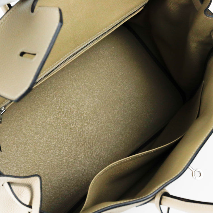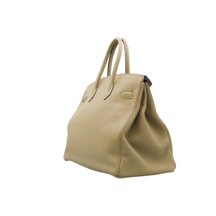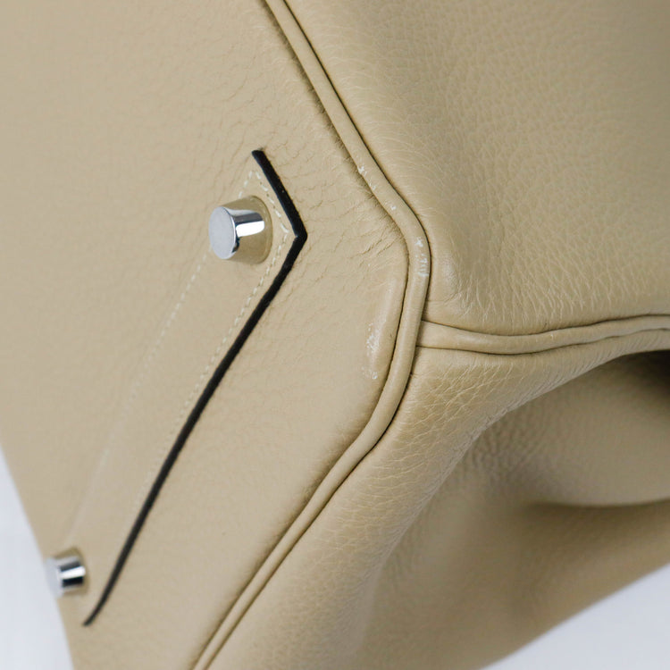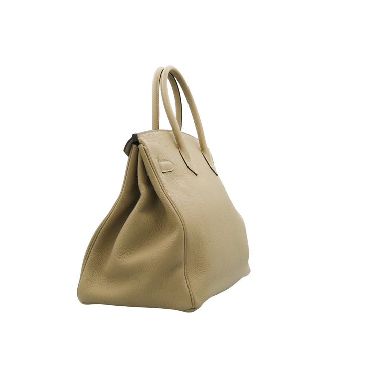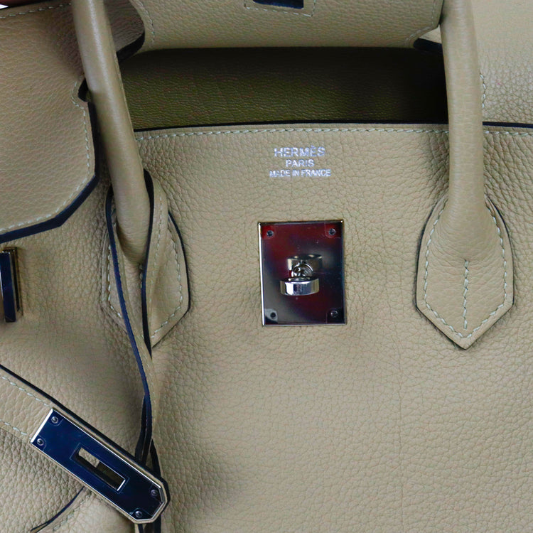 Bolso Hermés Birkin 35, confeccionado en suave piel de cordero color beige, con 2 asas tubulares rígidas, solapa al frente con herrajes, candado y llave en color plateado.