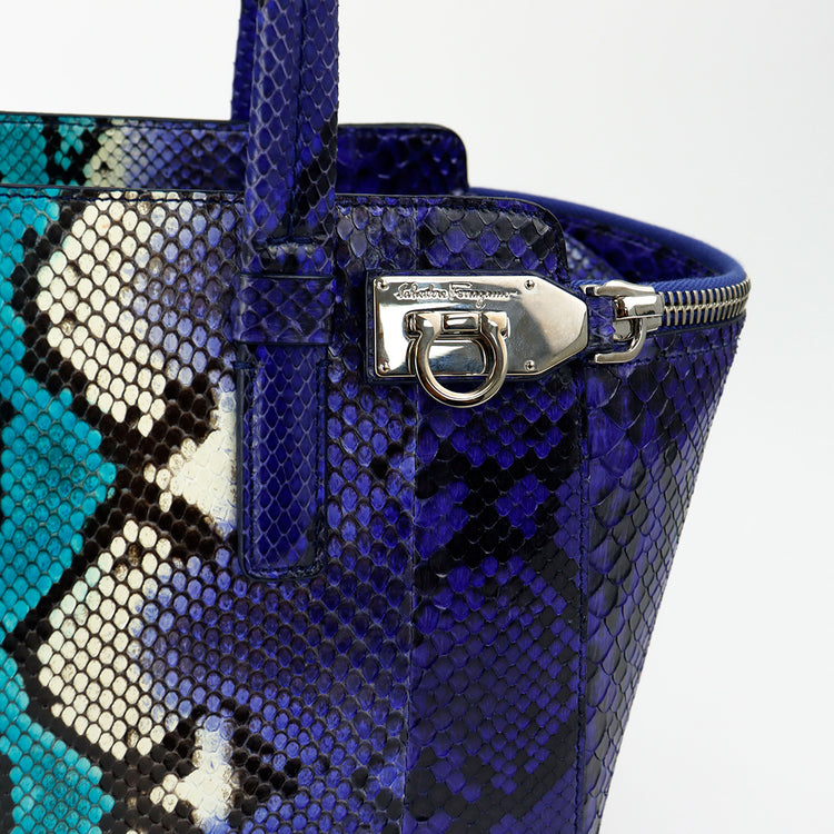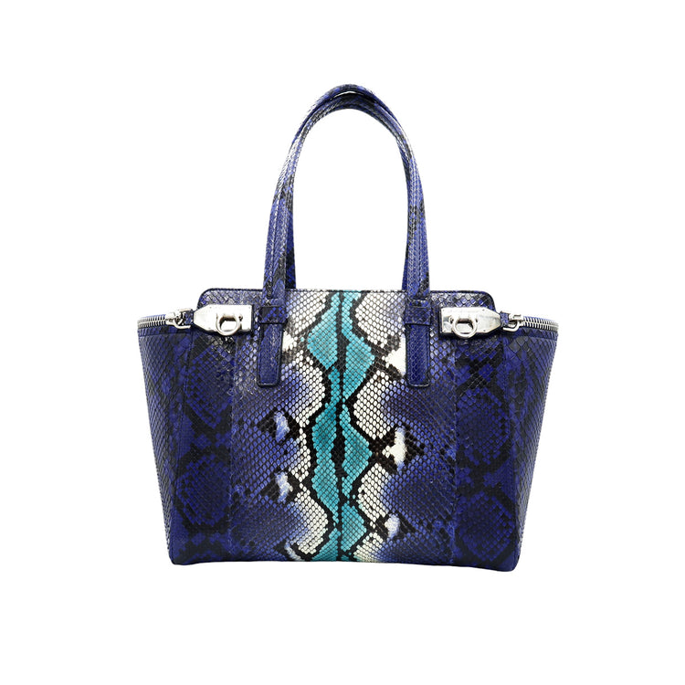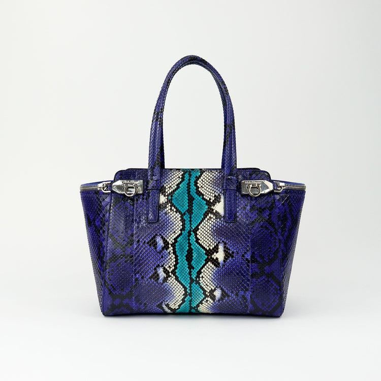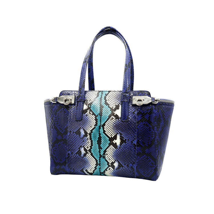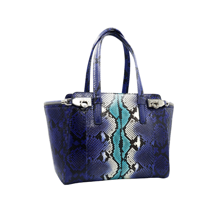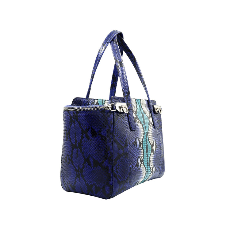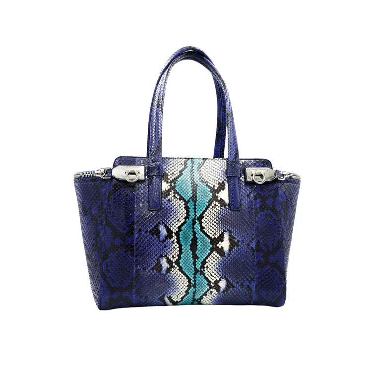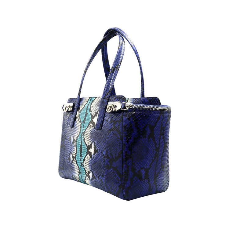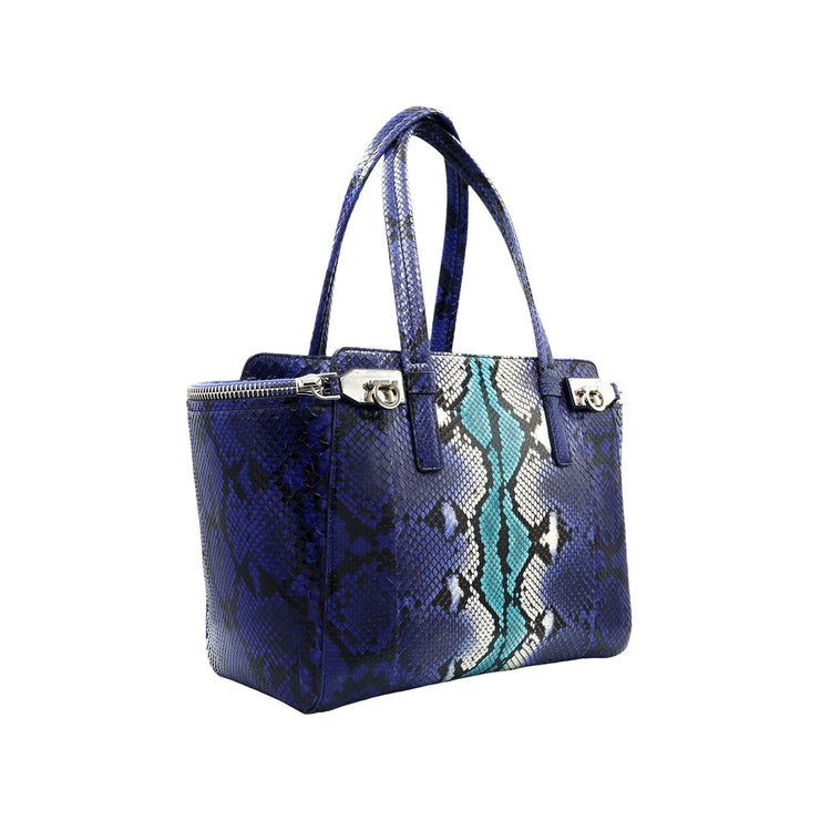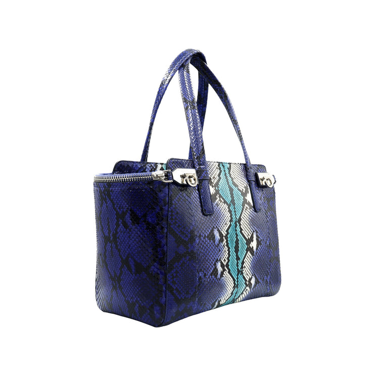 Bolso Salvatore Ferragamo de la línea Gancini confeccionado en piel tipo exótica, con forro interno en ante azul, con 2 asas superiores, herrajes, seguros y cremalleras en color plata.