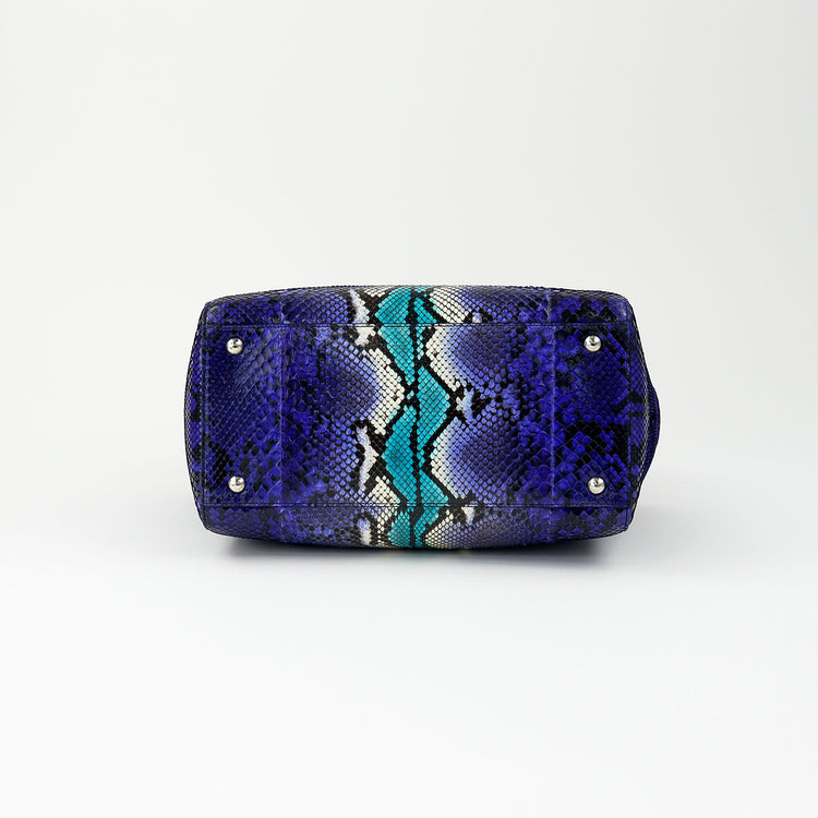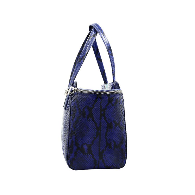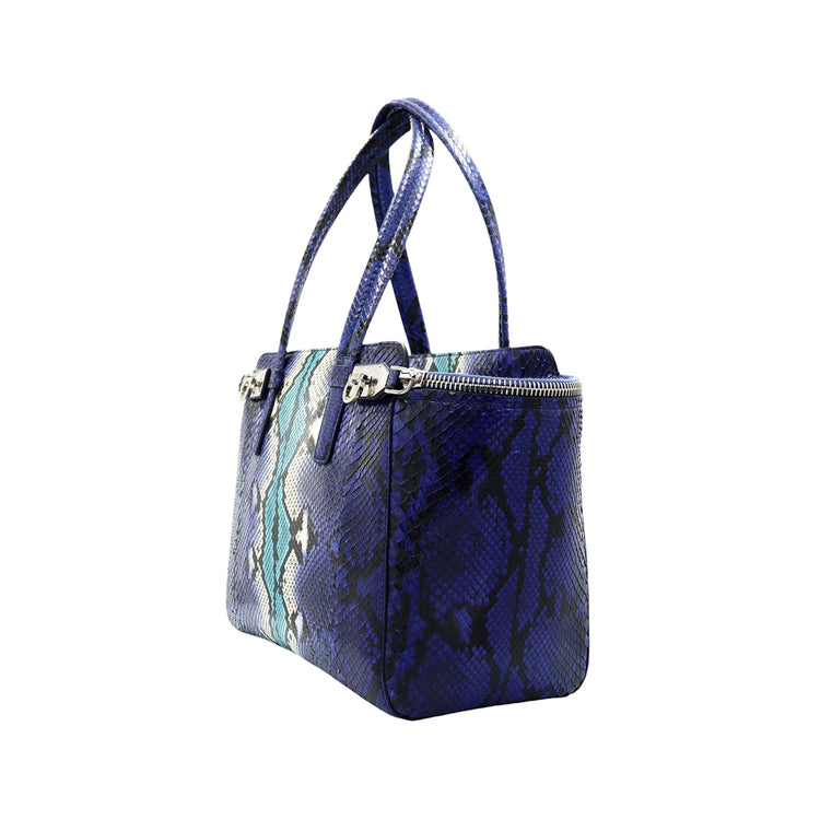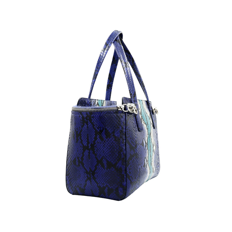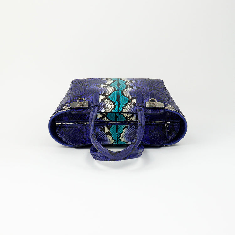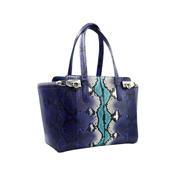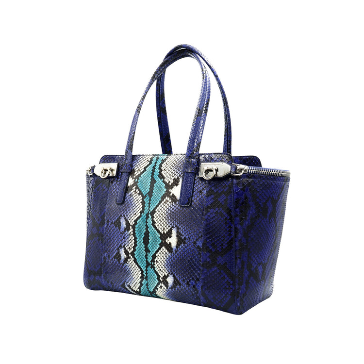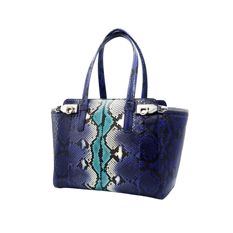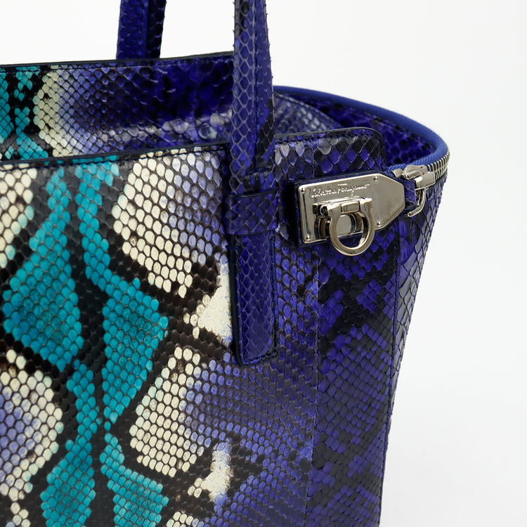 Bolso Salvatore Ferragamo de la línea Gancini confeccionado en piel tipo exótica, con forro interno en ante azul, con 2 asas superiores, herrajes, seguros y cremalleras en color plata.