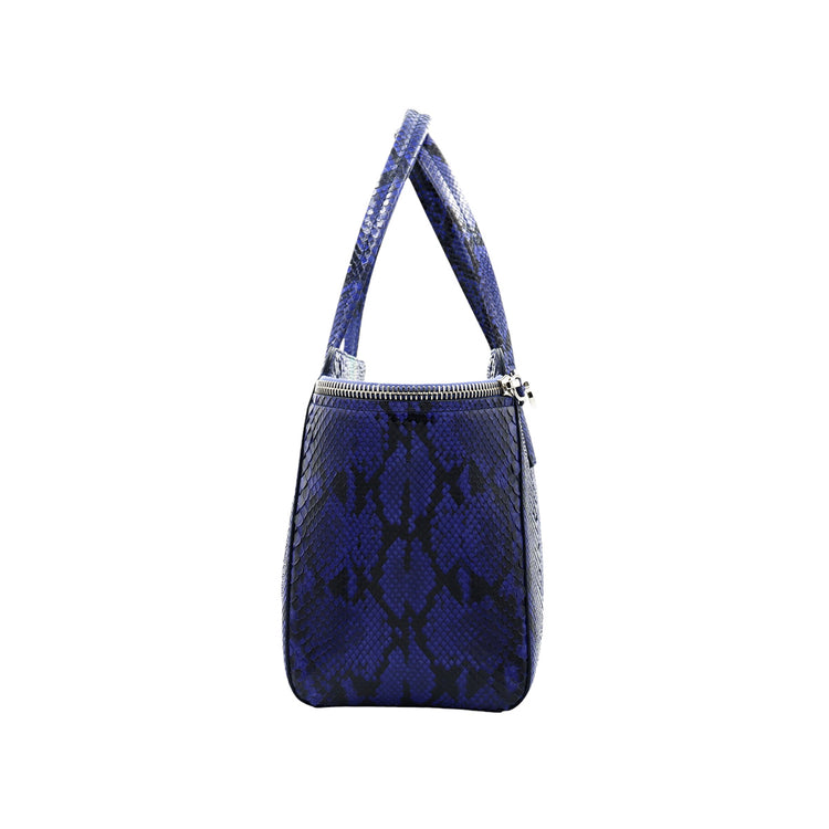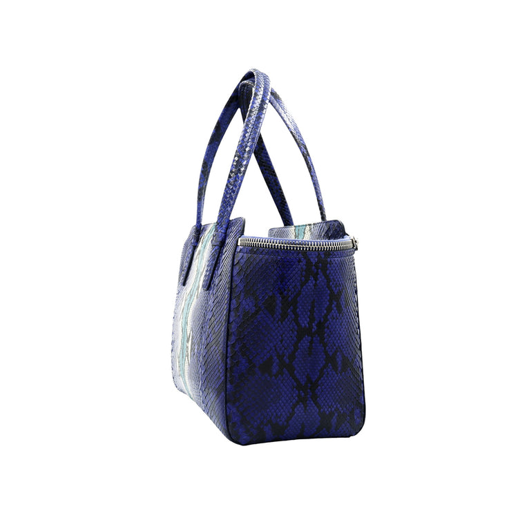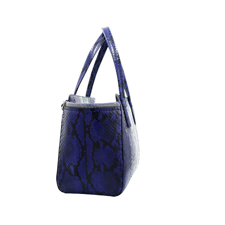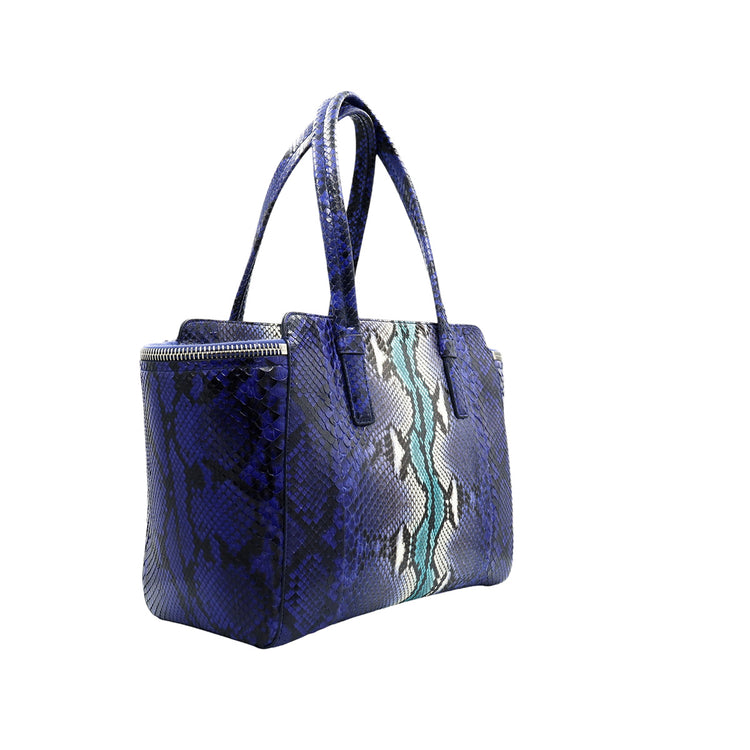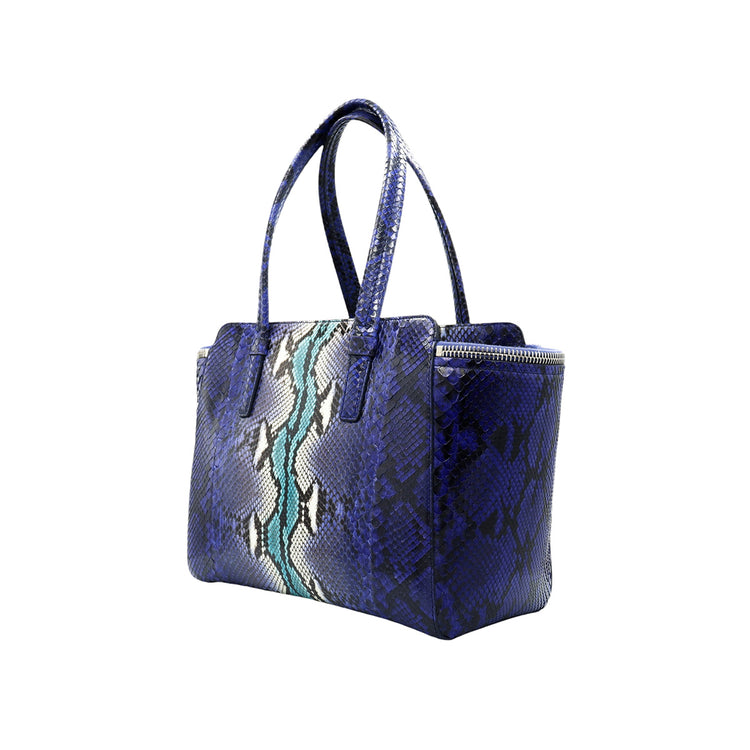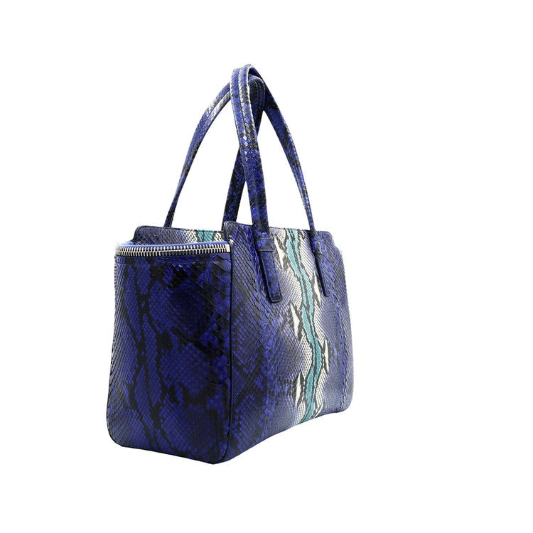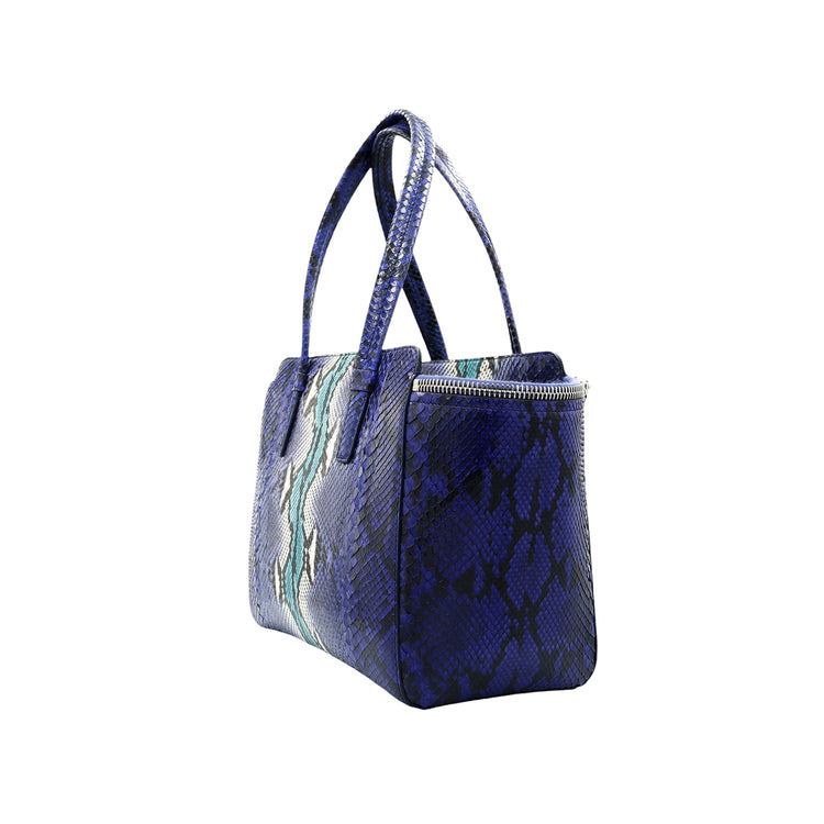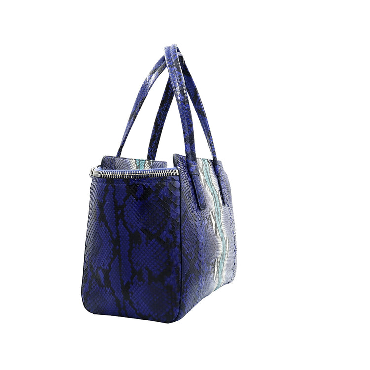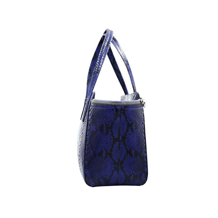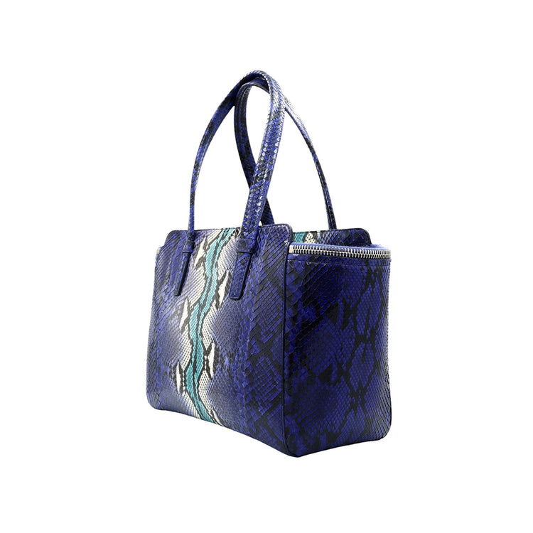 Bolso Salvatore Ferragamo de la línea Gancini confeccionado en piel tipo exótica, con forro interno en ante azul, con 2 asas superiores, herrajes, seguros y cremalleras en color plata.