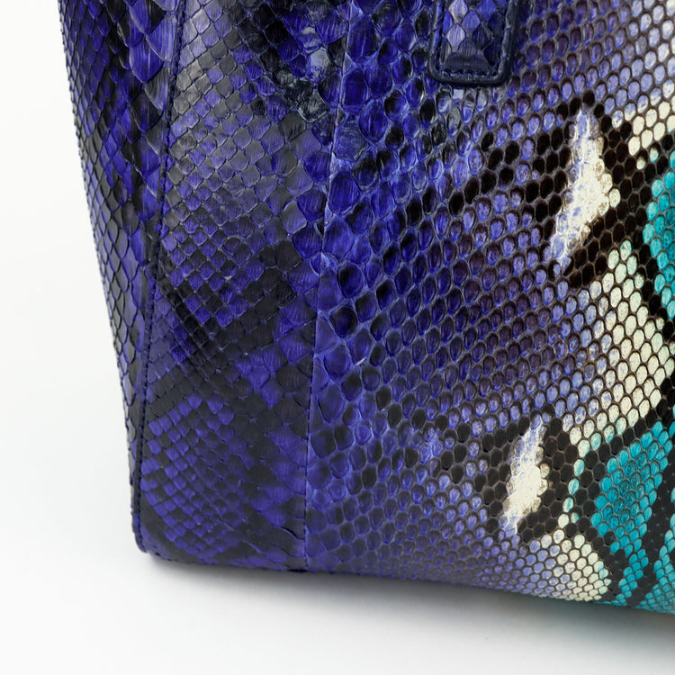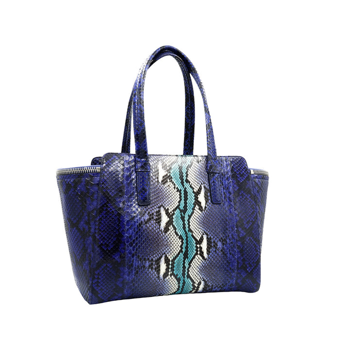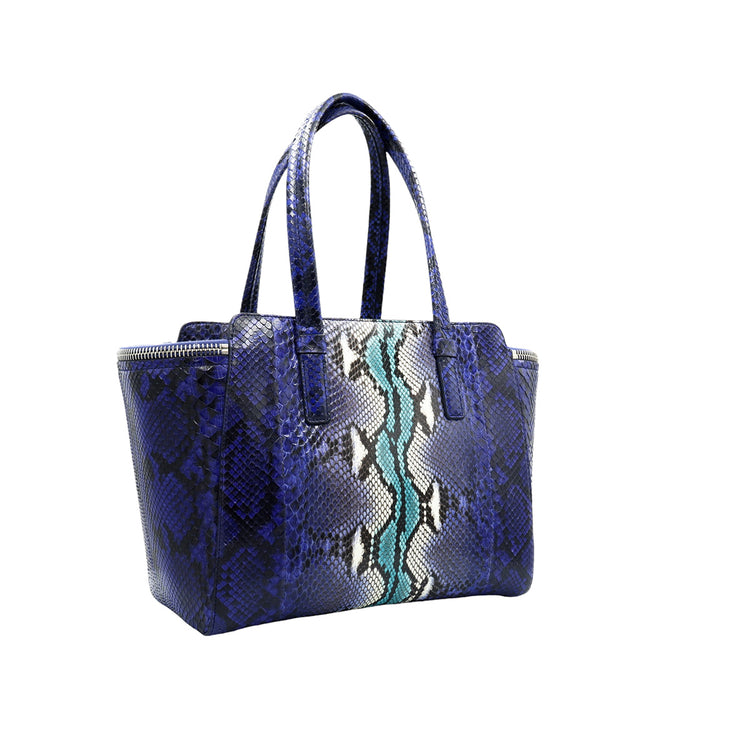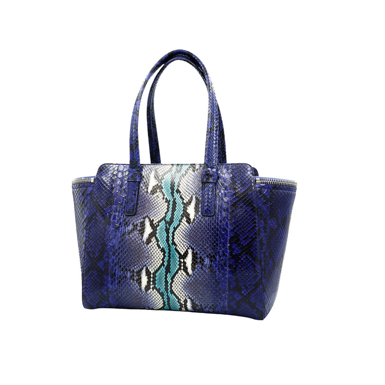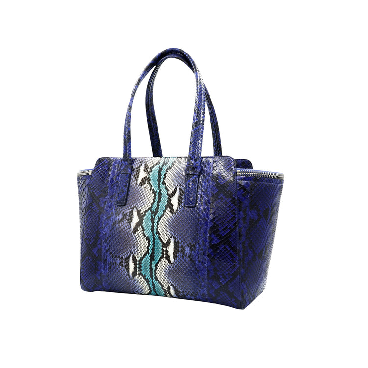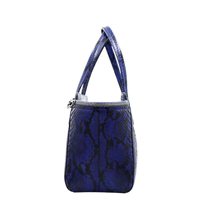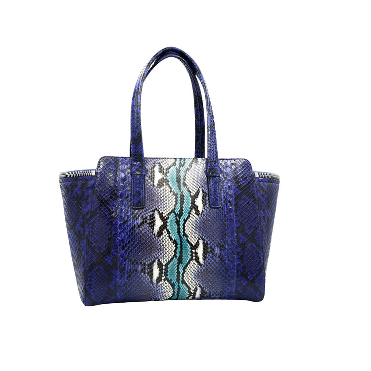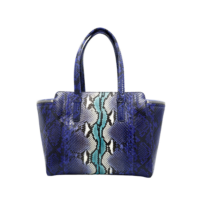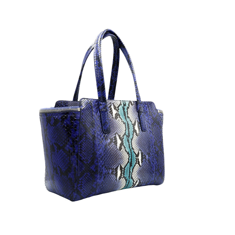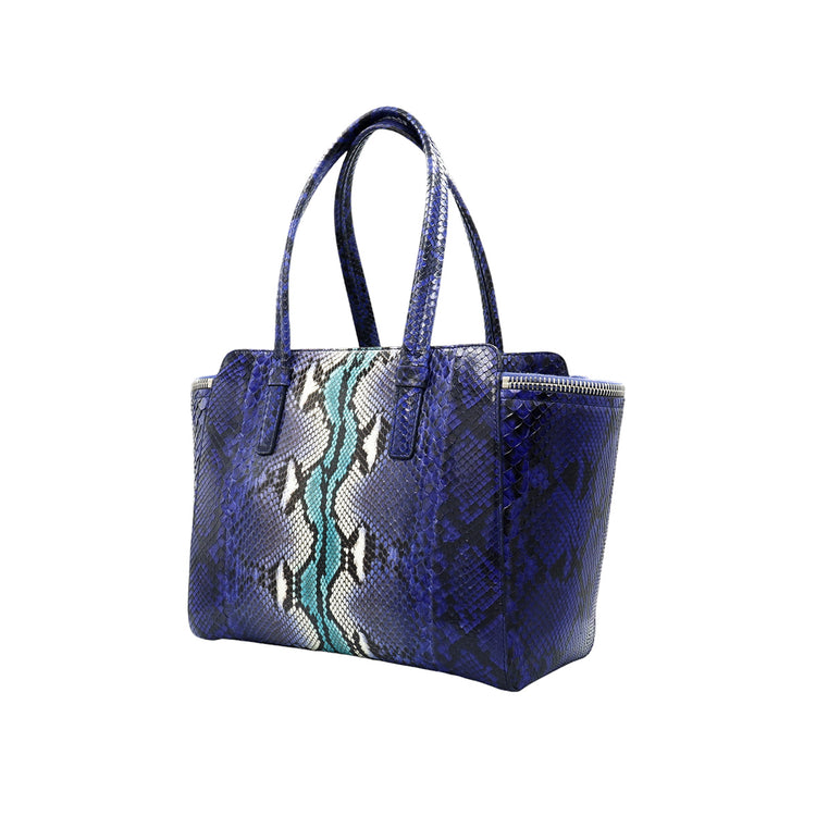 Bolso Salvatore Ferragamo de la línea Gancini confeccionado en piel tipo exótica, con forro interno en ante azul, con 2 asas superiores, herrajes, seguros y cremalleras en color plata.