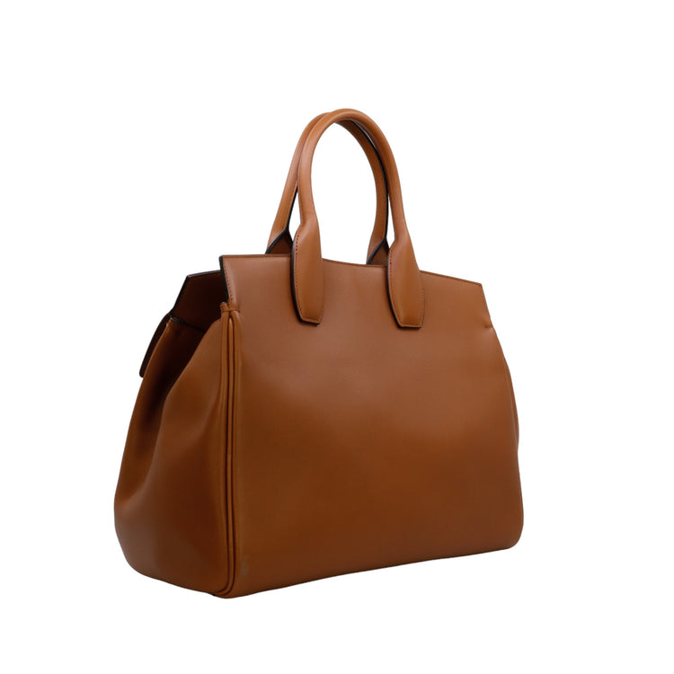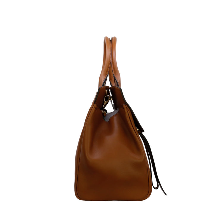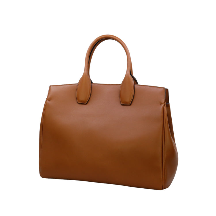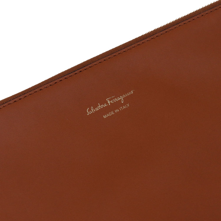Bolso Salvatore Ferragamo de la línea Studio Bag, confeccionado en piel de becerro a grano color café, con 2 asas rígidas en la parte superior, incluye bolsillo interno plano extraíble y correa en piel para llevar al hombro o cruzado, cierre frontal metálico con el logo Gancini.
