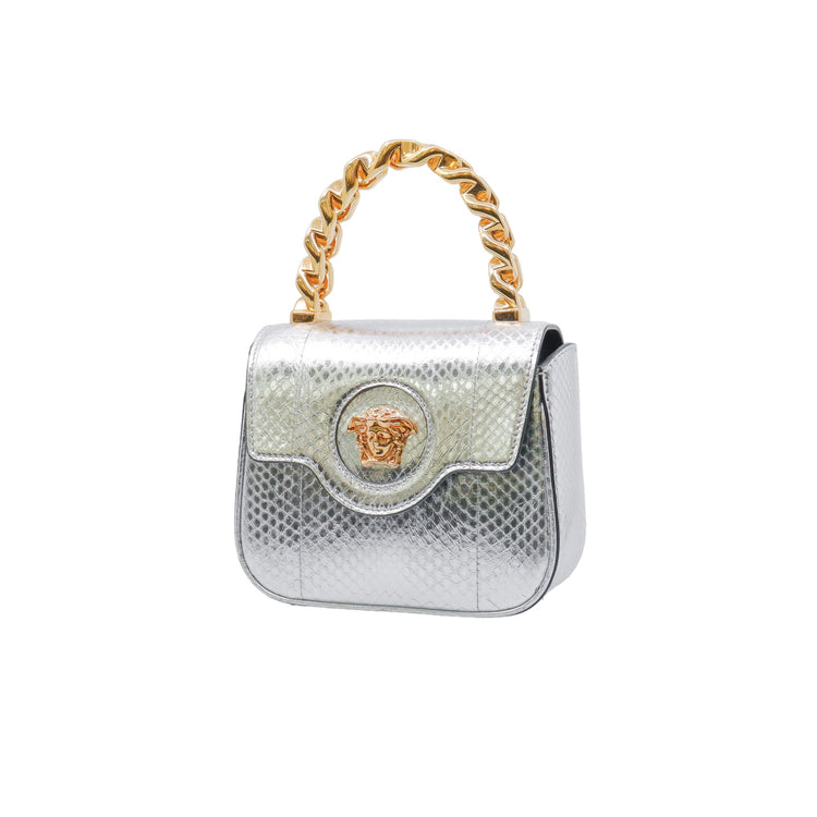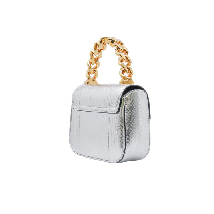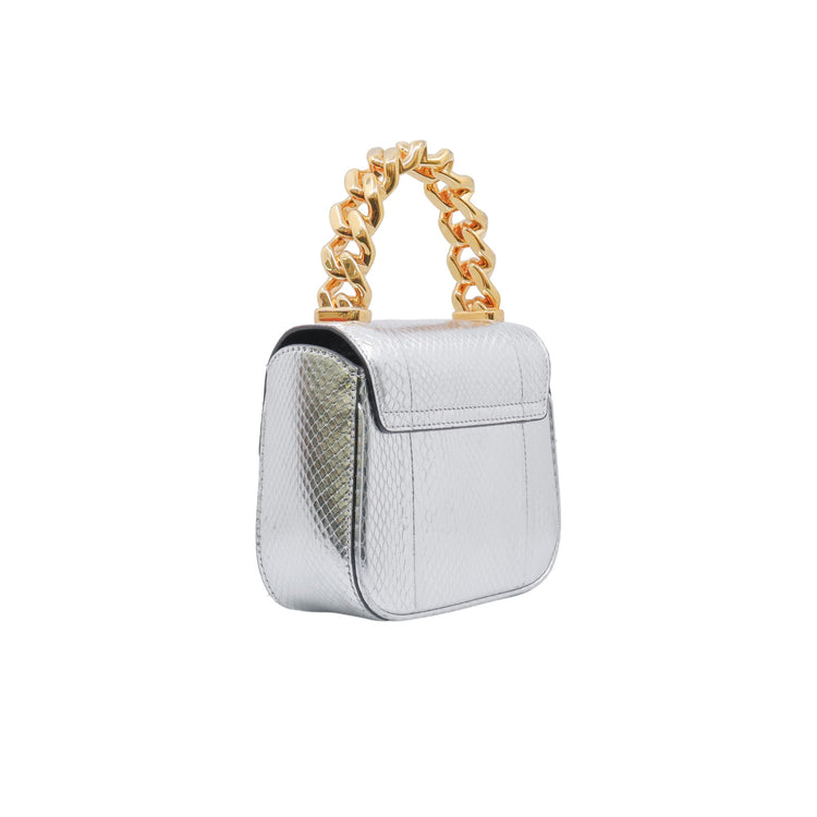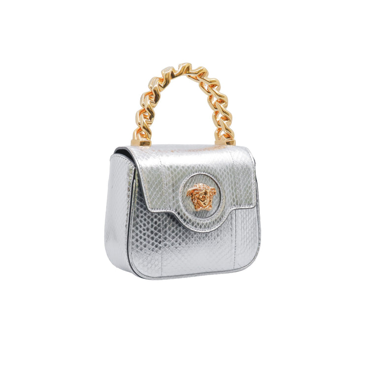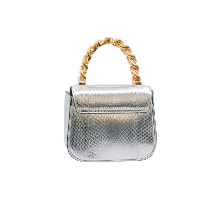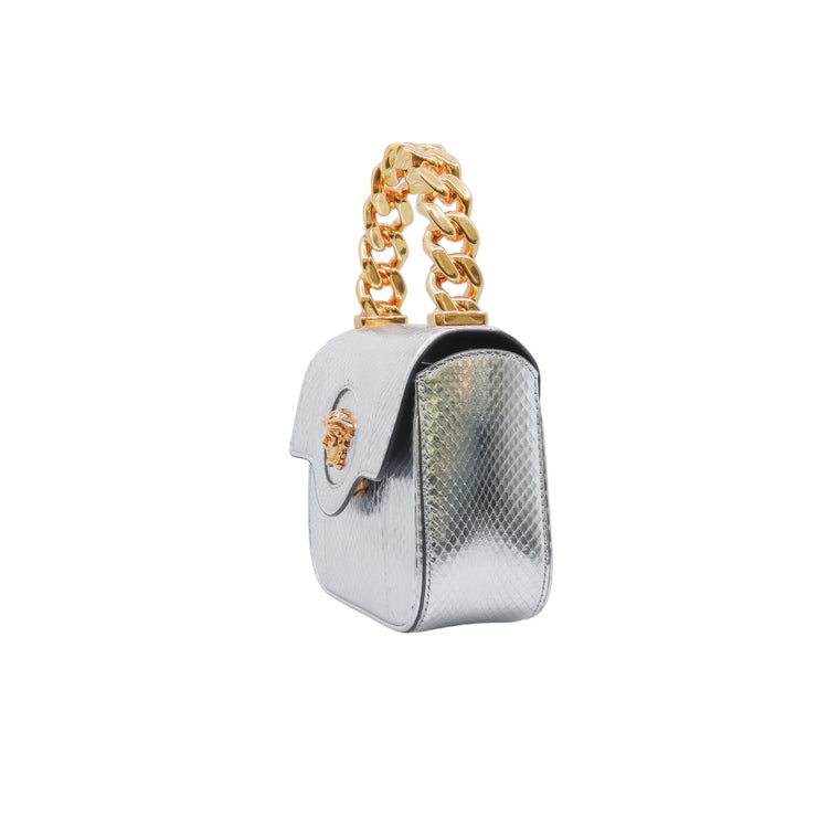 Mini Bolso Versace de la colección La Medusa, confeccionado en piel color plata, con asa rígida y herrajes en color dorado, no cuenta con strap.