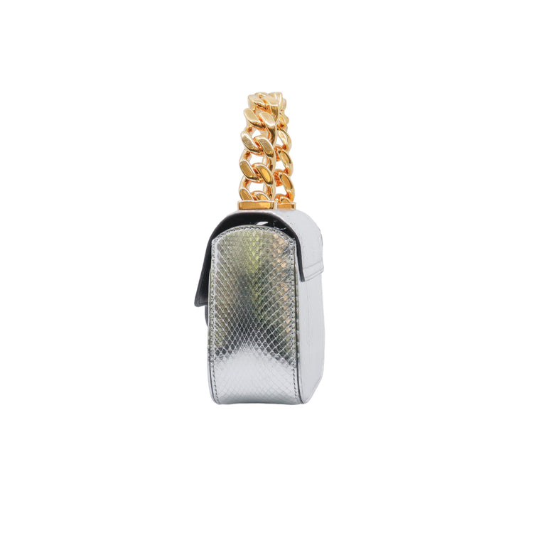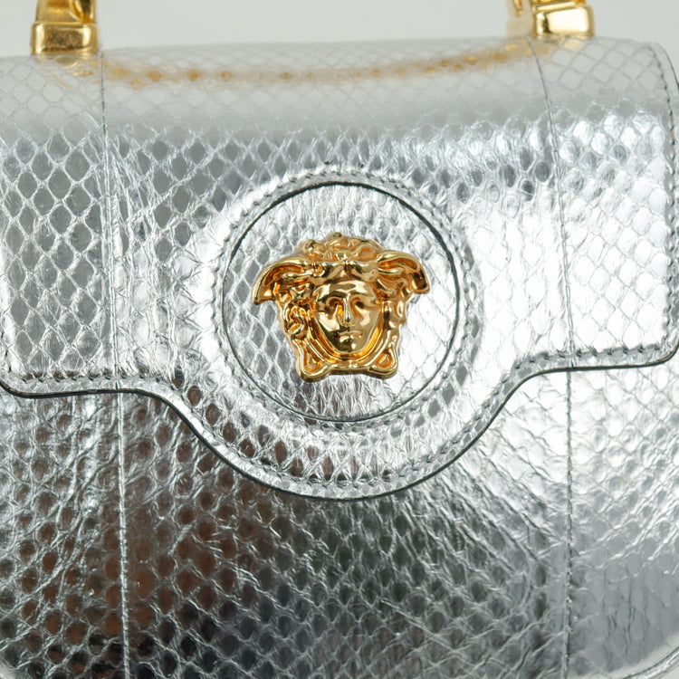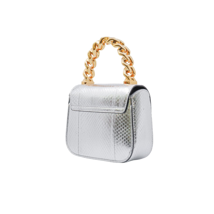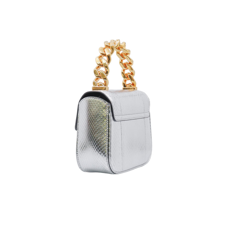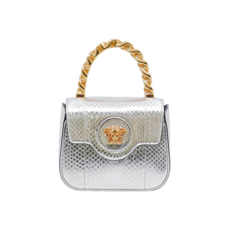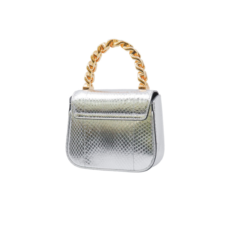 Mini Bolso Versace de la colección La Medusa, confeccionado en piel color plata, con asa rígida y herrajes en color dorado, no cuenta con strap.