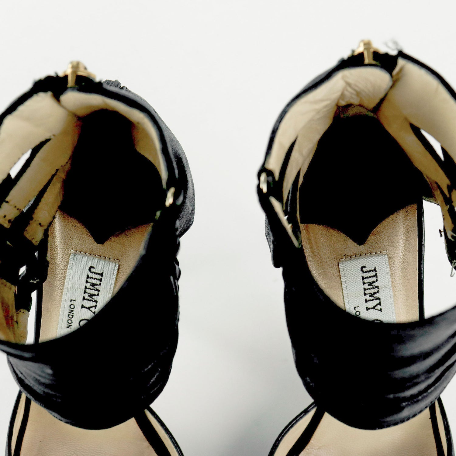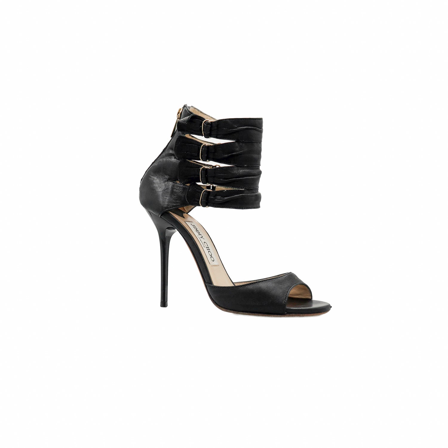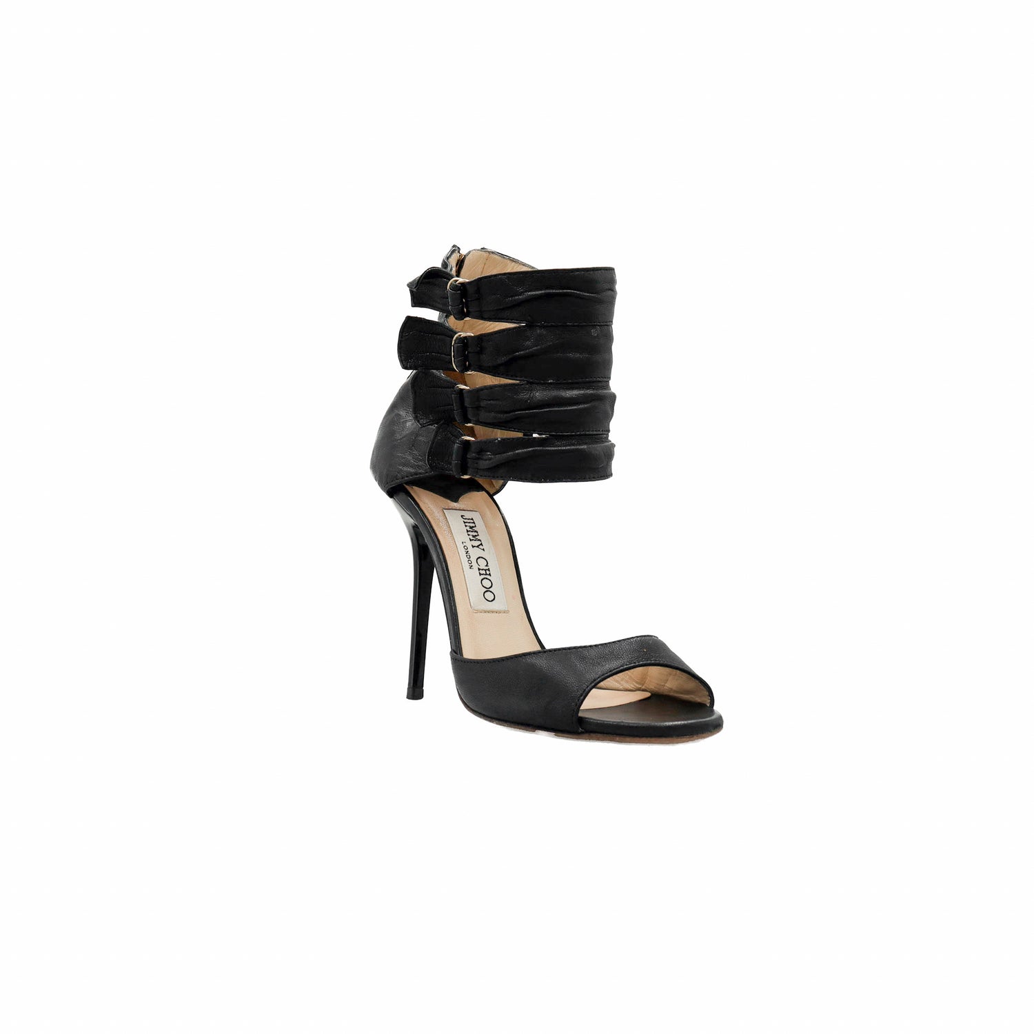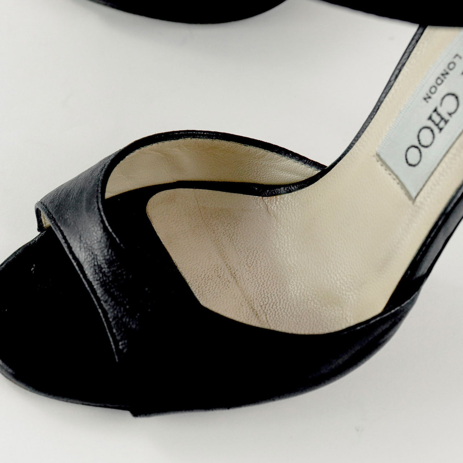 Zapatos de tacón Jimmy Choo, confeccionados en piel vacuna color negro, tipo pulsera al tobillo con cierre de cremallera en la parte posterior, desgaste en suela y en pulsera.