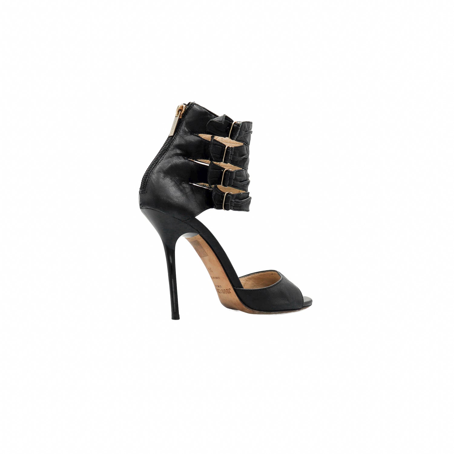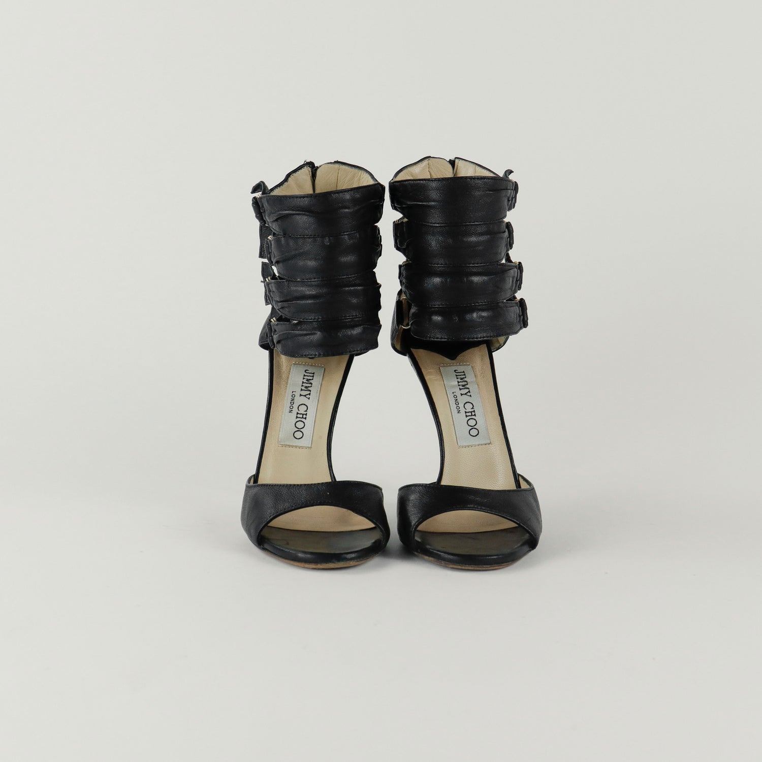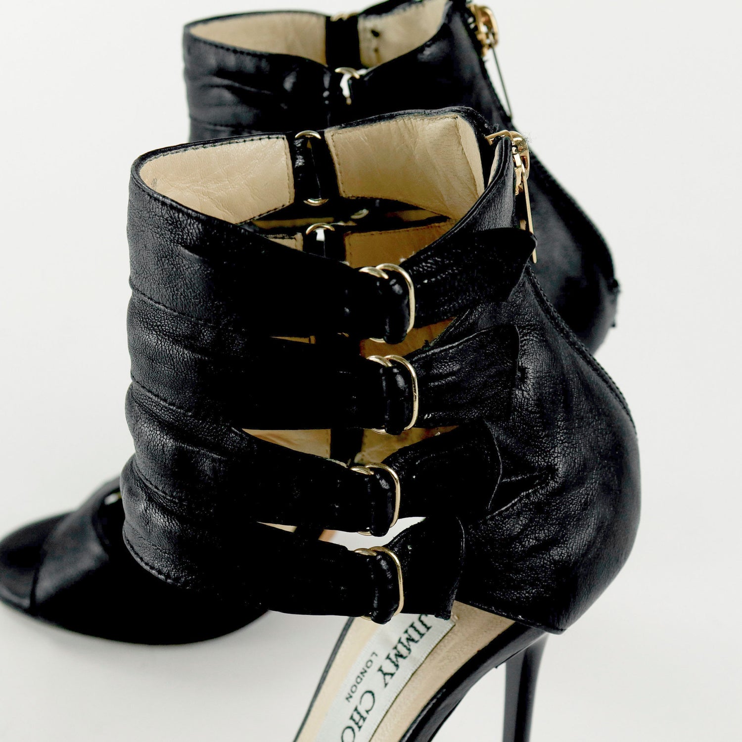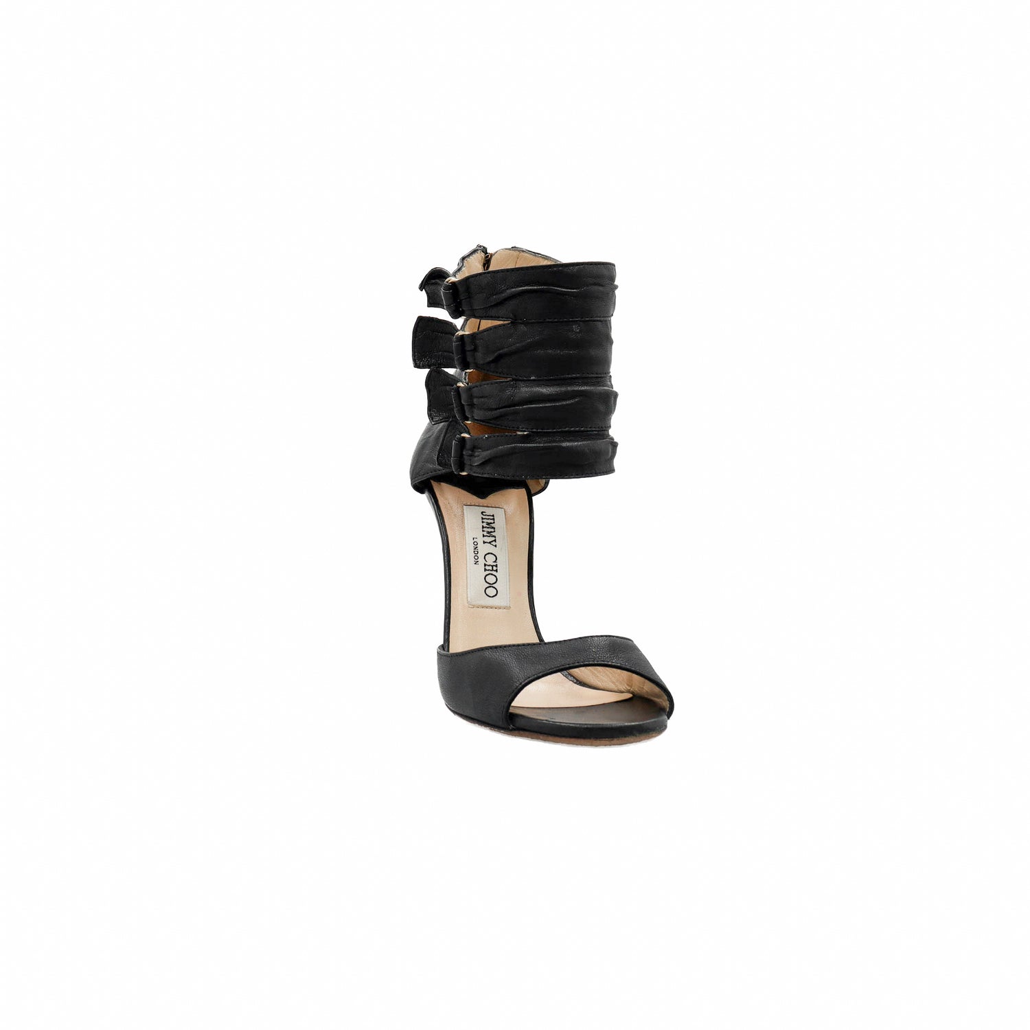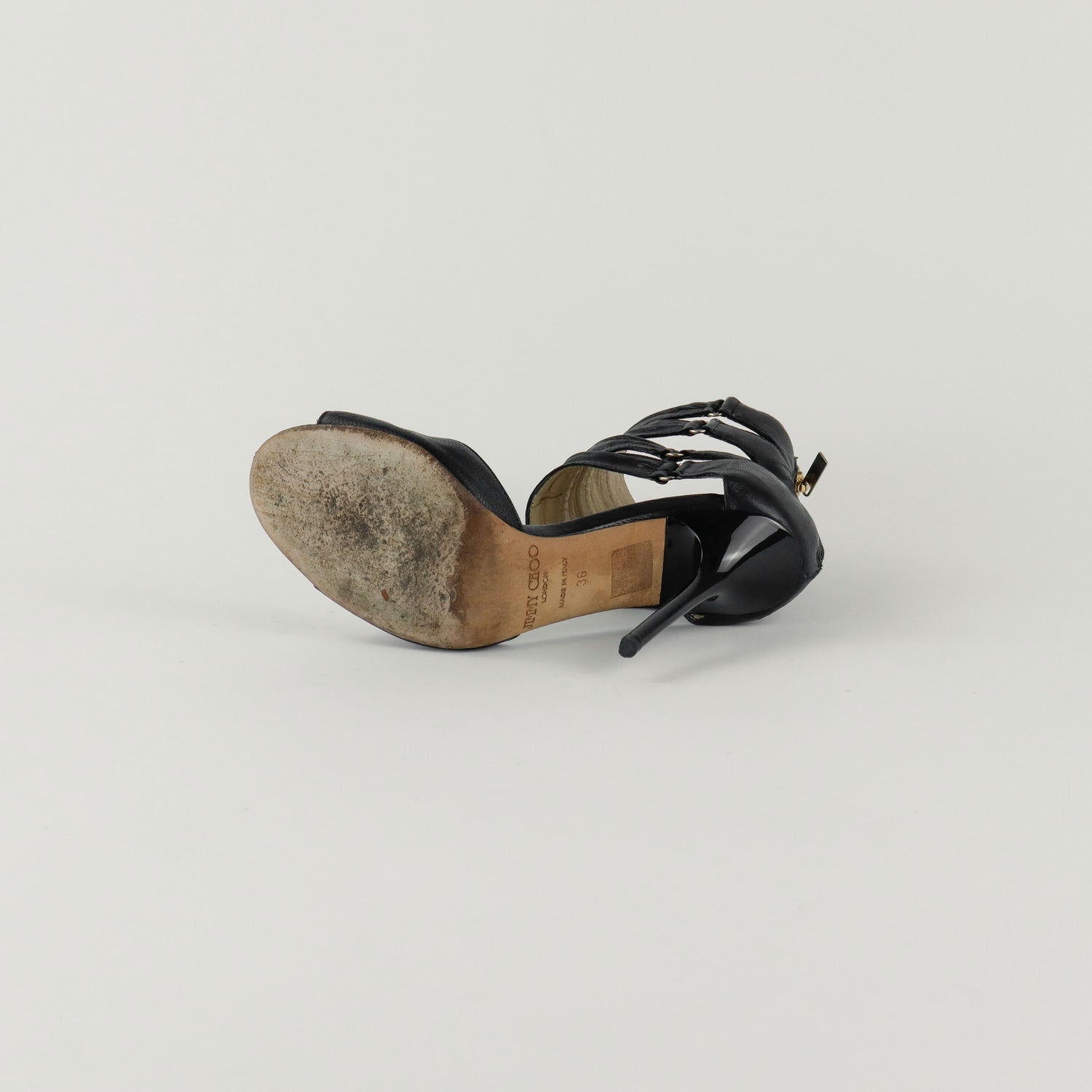 Zapatos de tacón Jimmy Choo, confeccionados en piel vacuna color negro, tipo pulsera al tobillo con cierre de cremallera en la parte posterior, desgaste en suela y en pulsera.