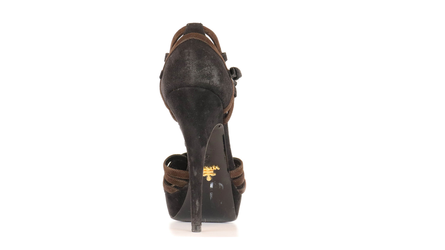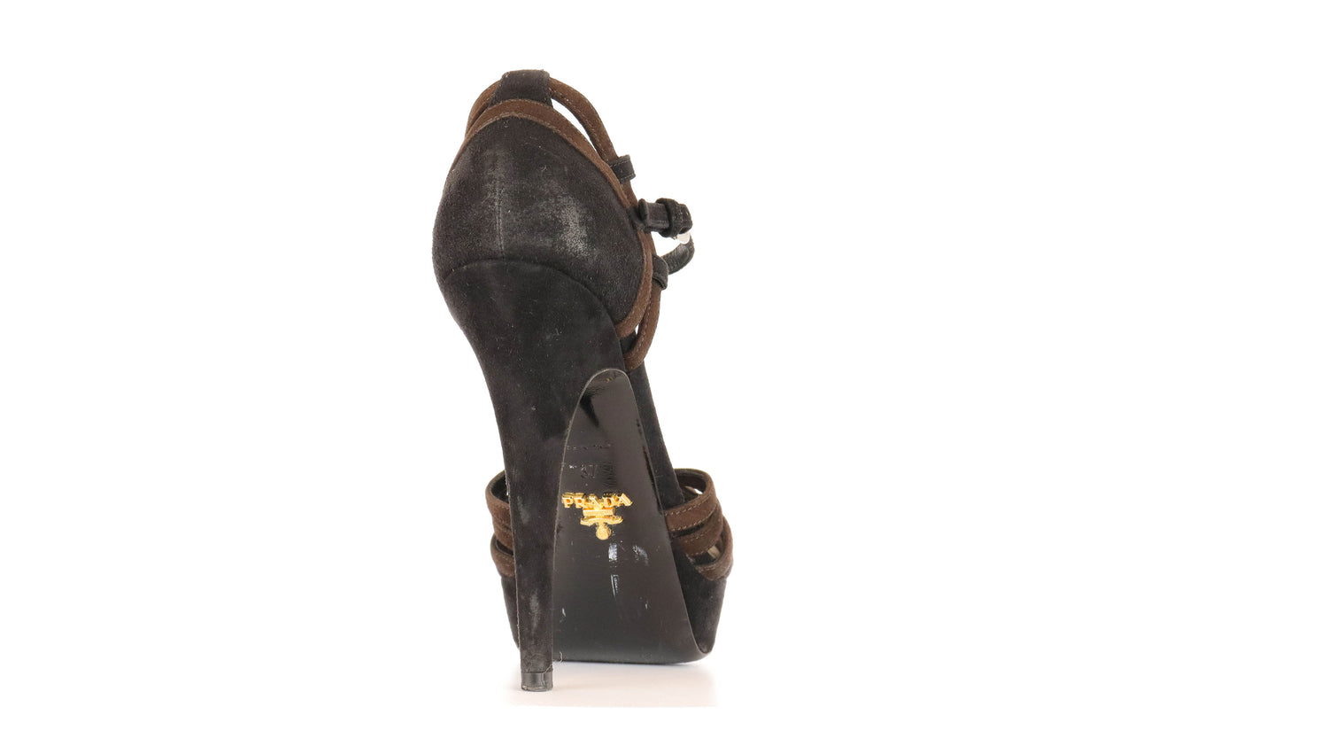 Zapatos de tacón Prada, confeccionados en piel de gamuza en color negro y café, puntera cerrada redonda con detalle entretejido, tres tiras al empeine en forma de T, con pulsera ajustable al tobillo a base de hebilla.