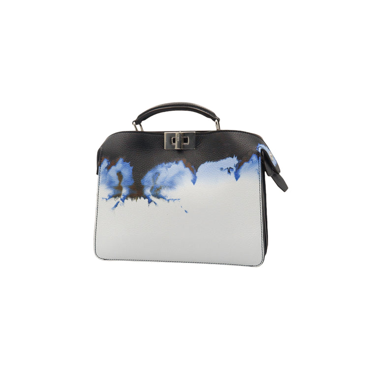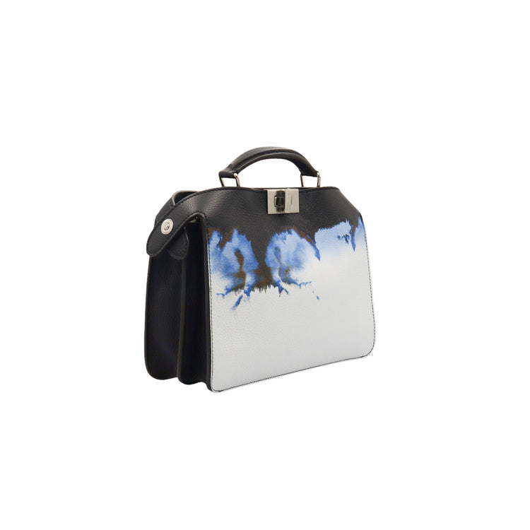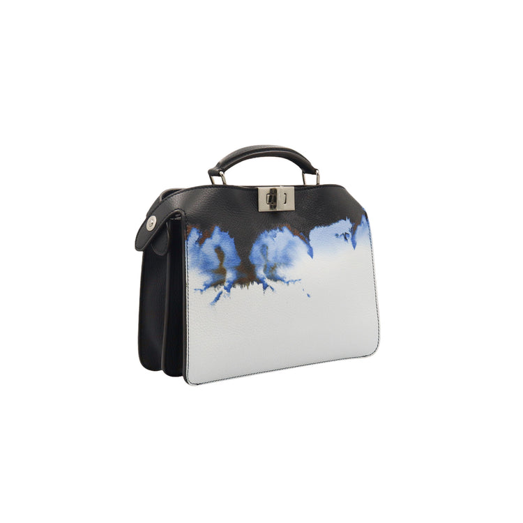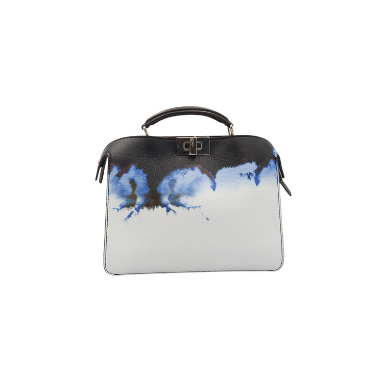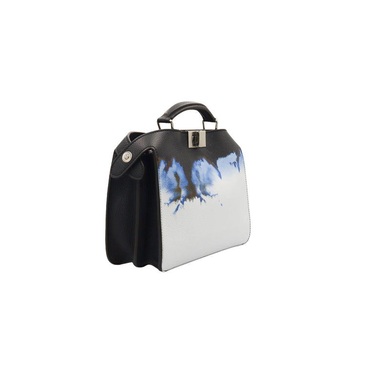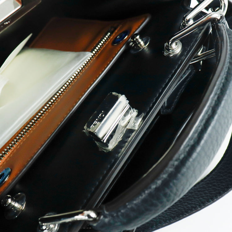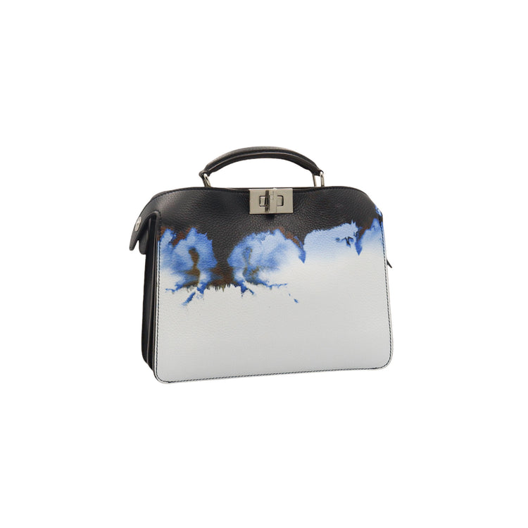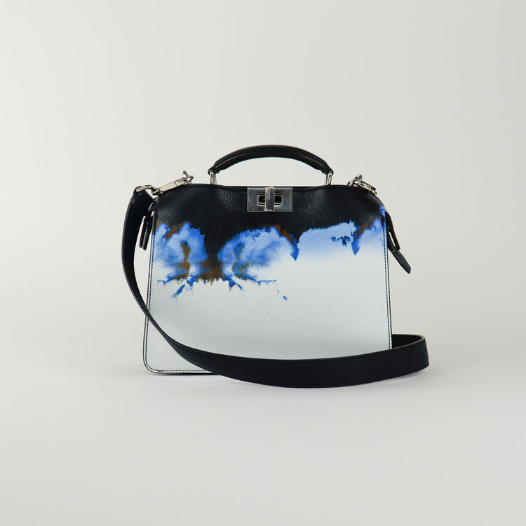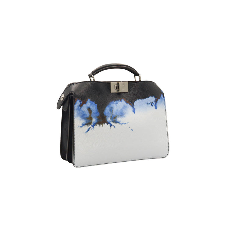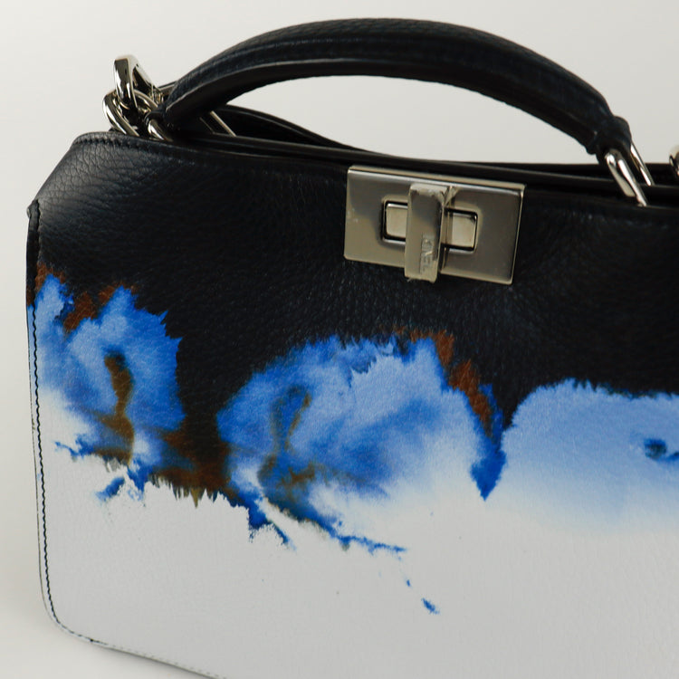 Bolso Fendi Peekaboo ISeeU Mini, confeccionado en cuero color negro entintado tipo nubes, con interior de piel en dos compartimentos divididos por una partición rígida con el emblemático cierre de giro en la parte frontal, bolsillo interno extraíble en color amarillo por un lado y monograma FF por el otro, bandolera ajustable y extraíble.
