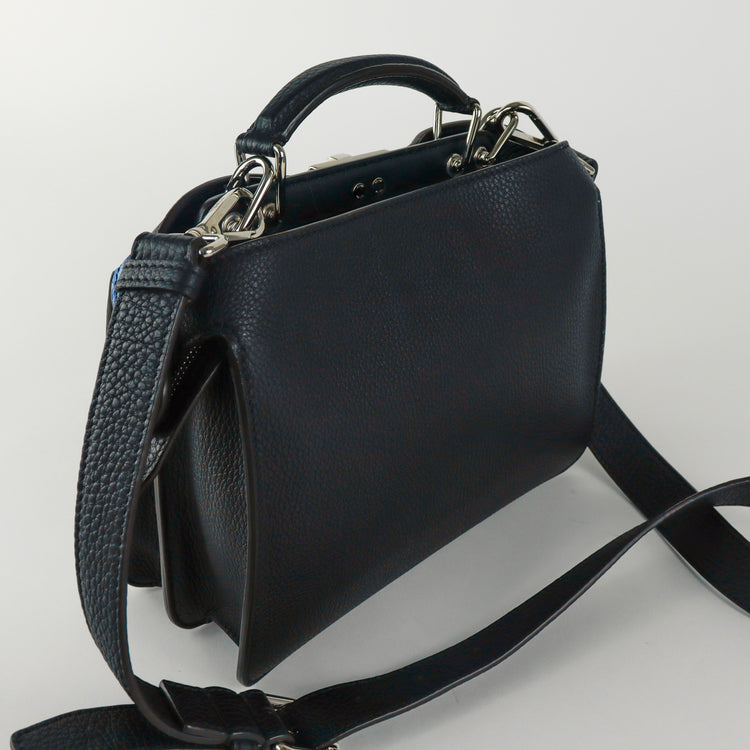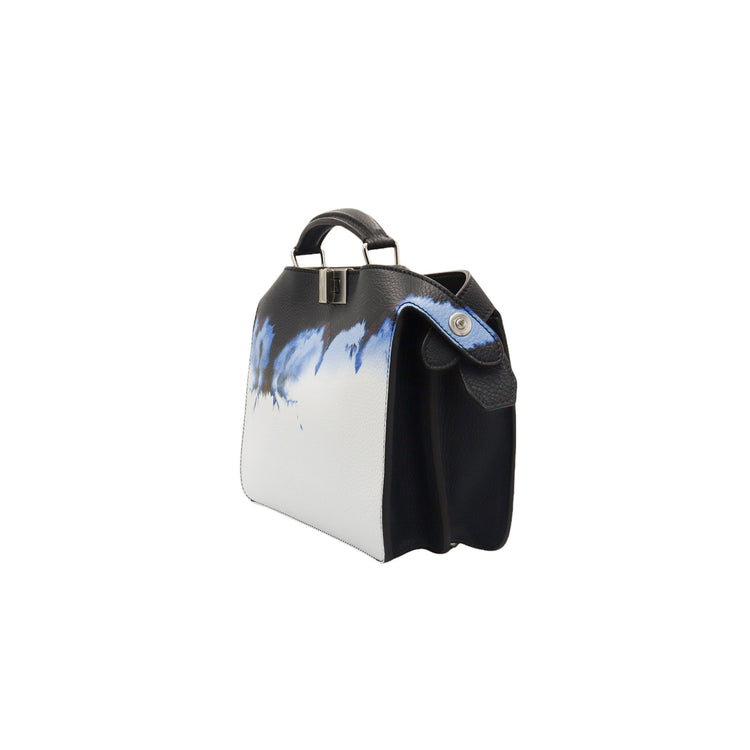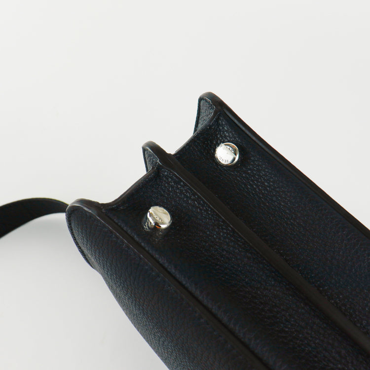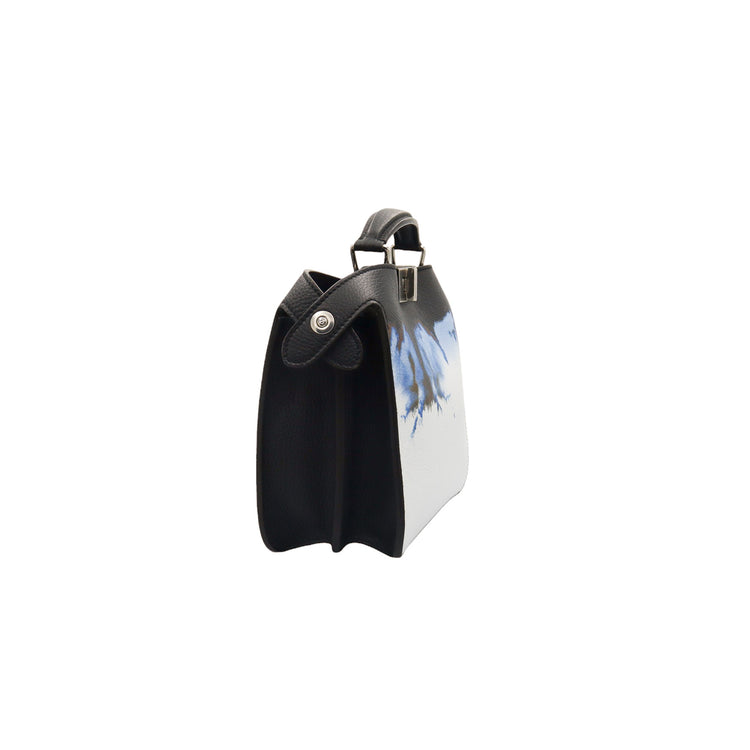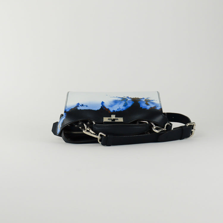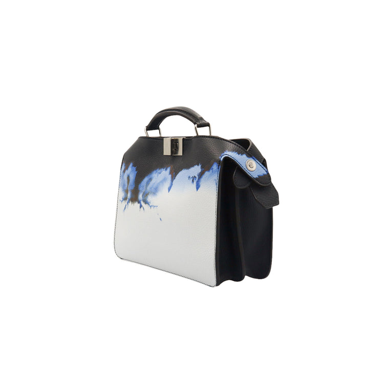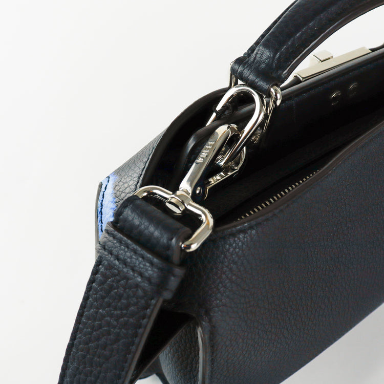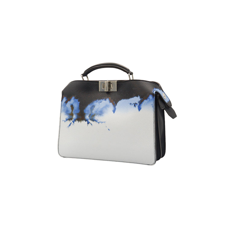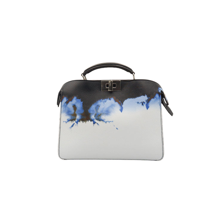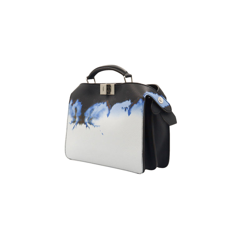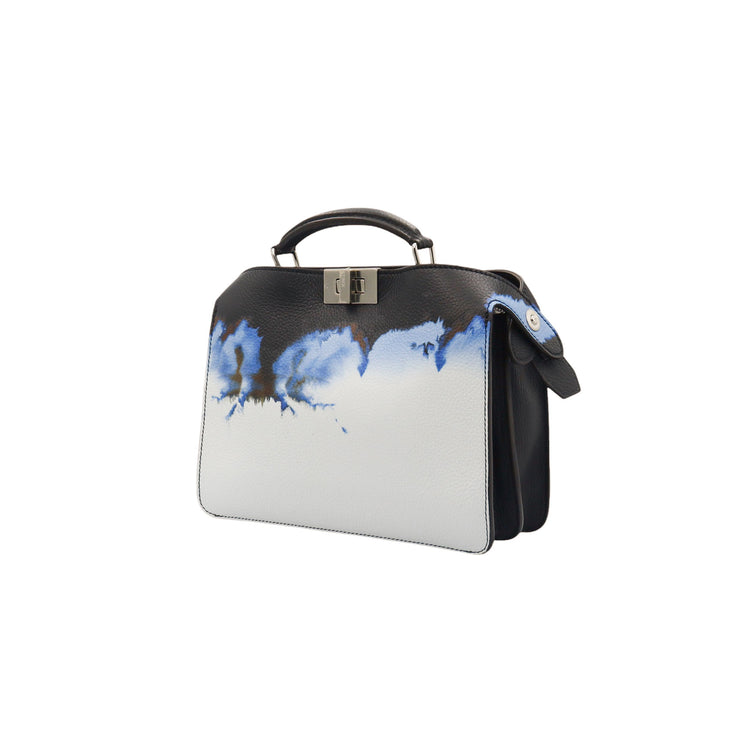 Bolso Fendi Peekaboo ISeeU Mini, confeccionado en cuero color negro entintado tipo nubes, con interior de piel en dos compartimentos divididos por una partición rígida con el emblemático cierre de giro en la parte frontal, bolsillo interno extraíble en color amarillo por un lado y monograma FF por el otro, bandolera ajustable y extraíble.