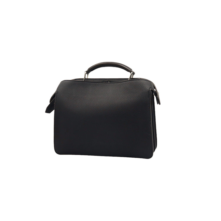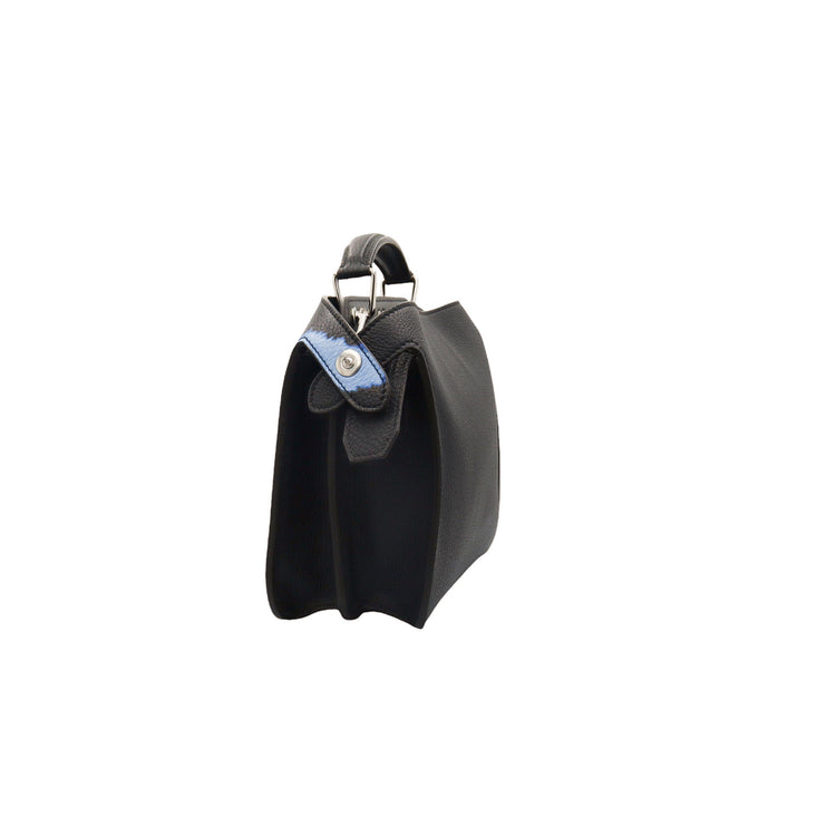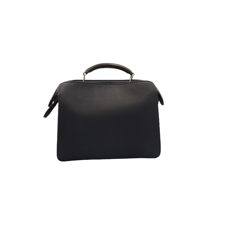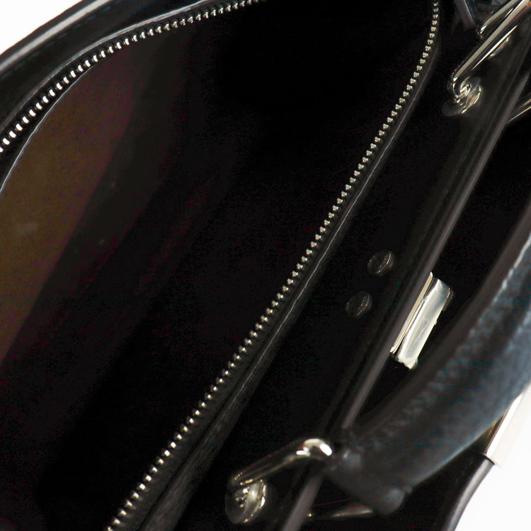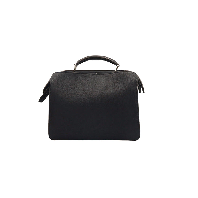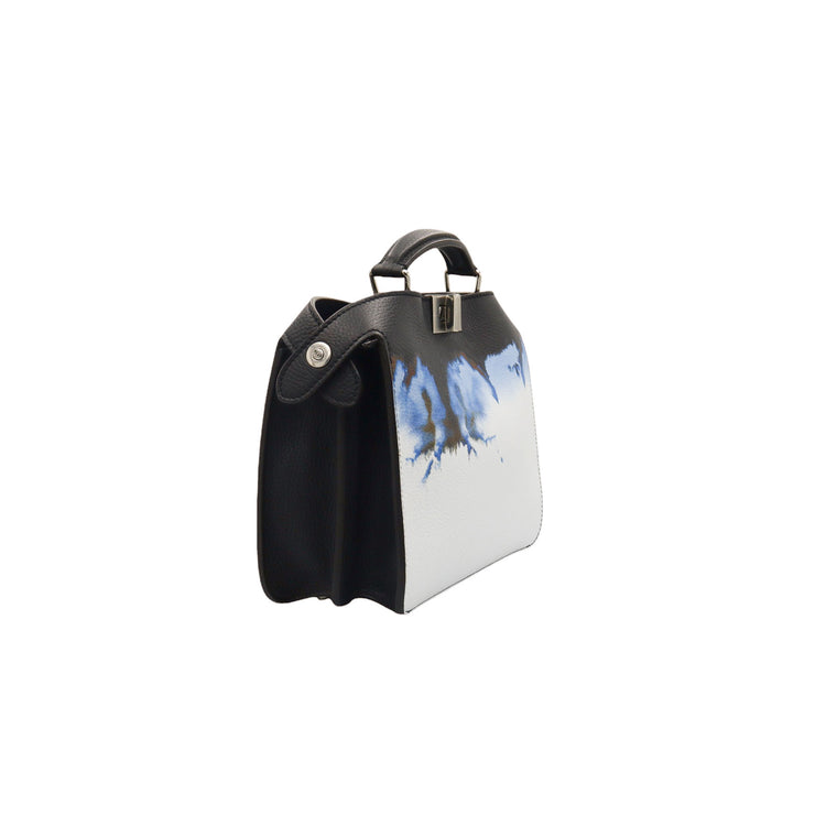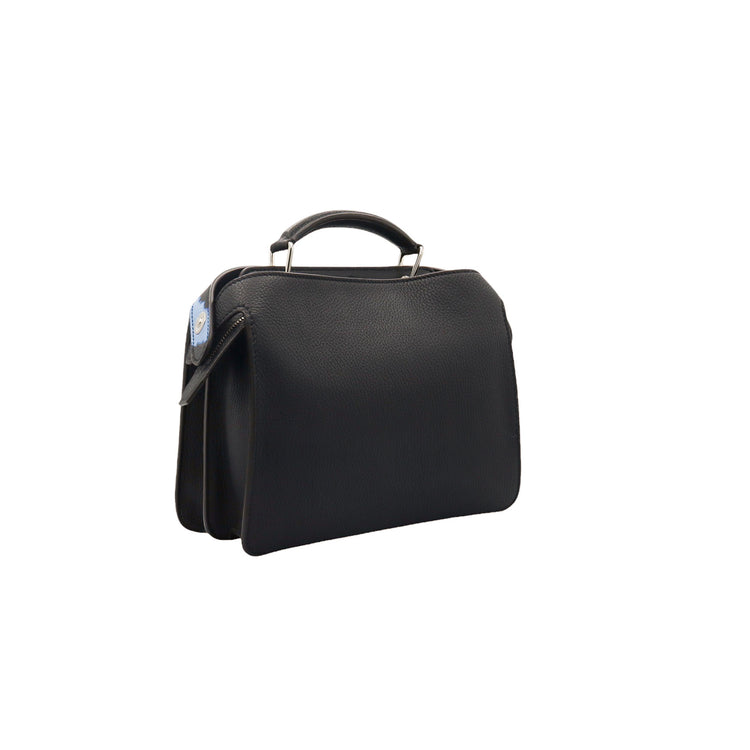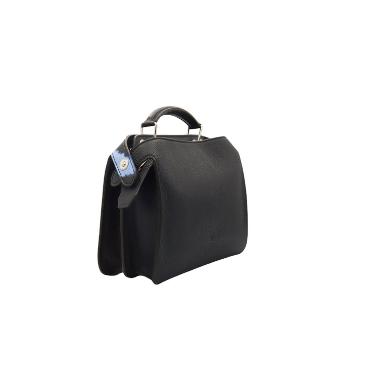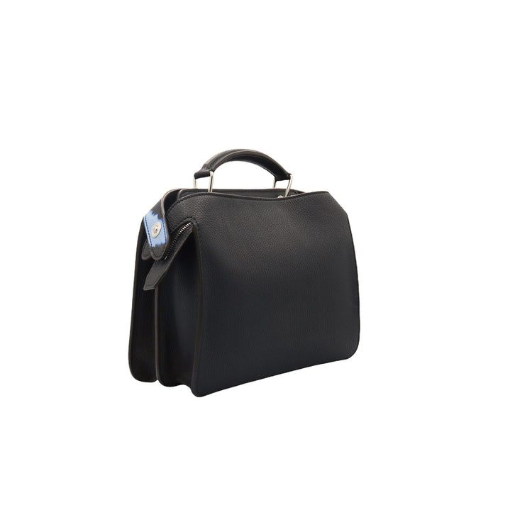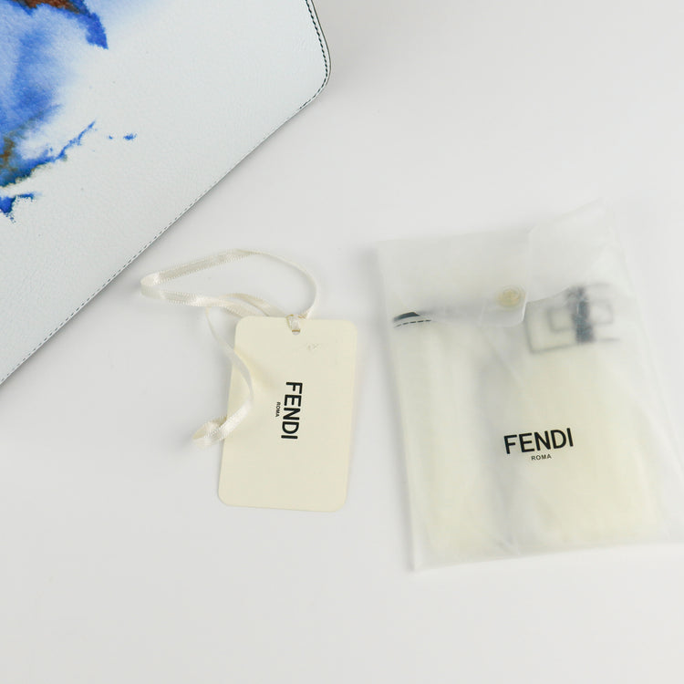 Bolso Fendi Peekaboo ISeeU Mini, confeccionado en cuero color negro entintado tipo nubes, con interior de piel en dos compartimentos divididos por una partición rígida con el emblemático cierre de giro en la parte frontal, bolsillo interno extraíble en color amarillo por un lado y monograma FF por el otro, bandolera ajustable y extraíble.
