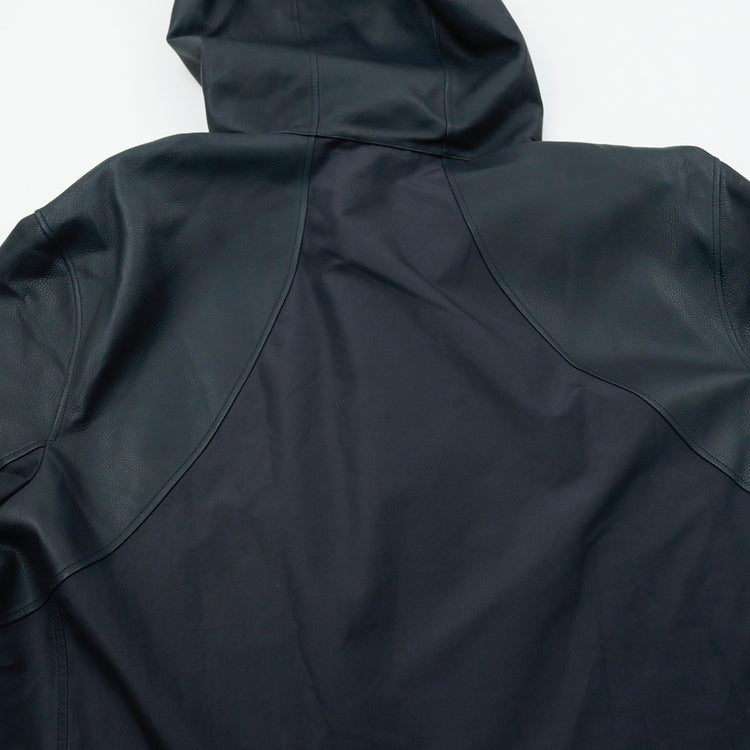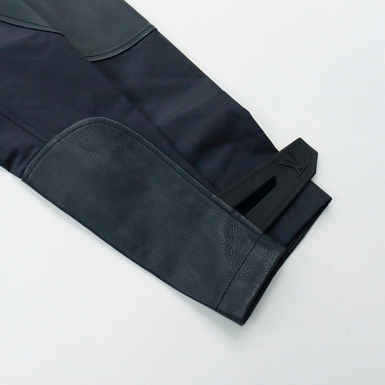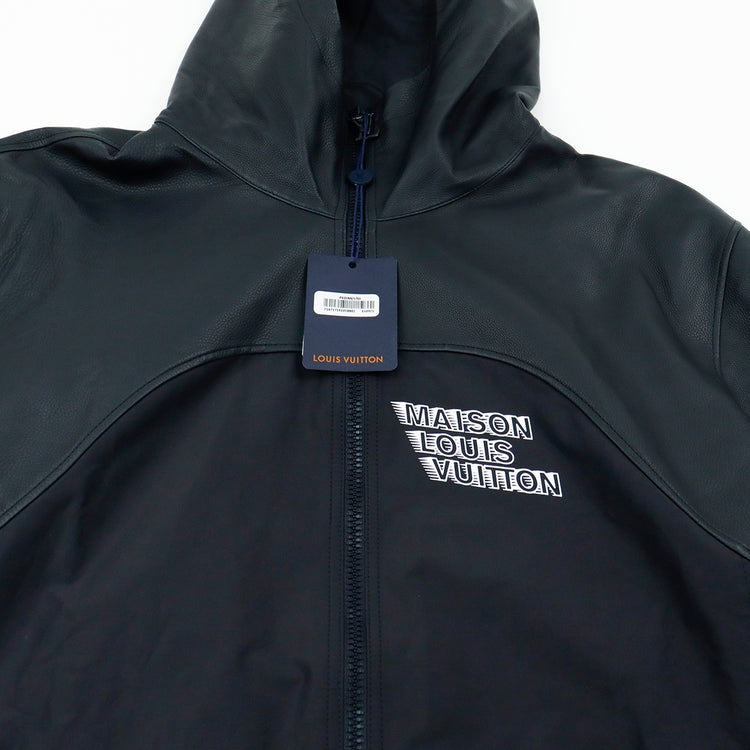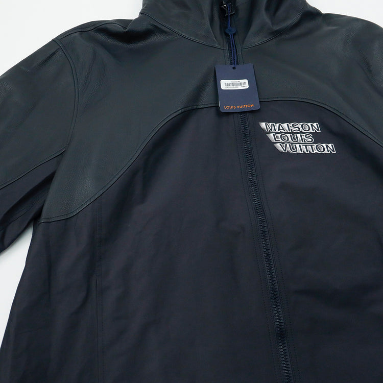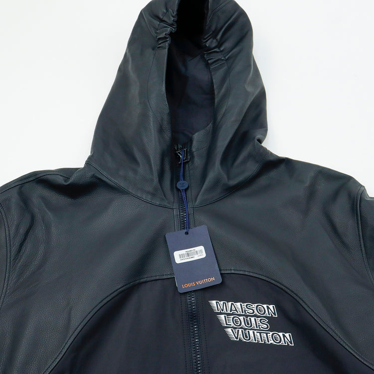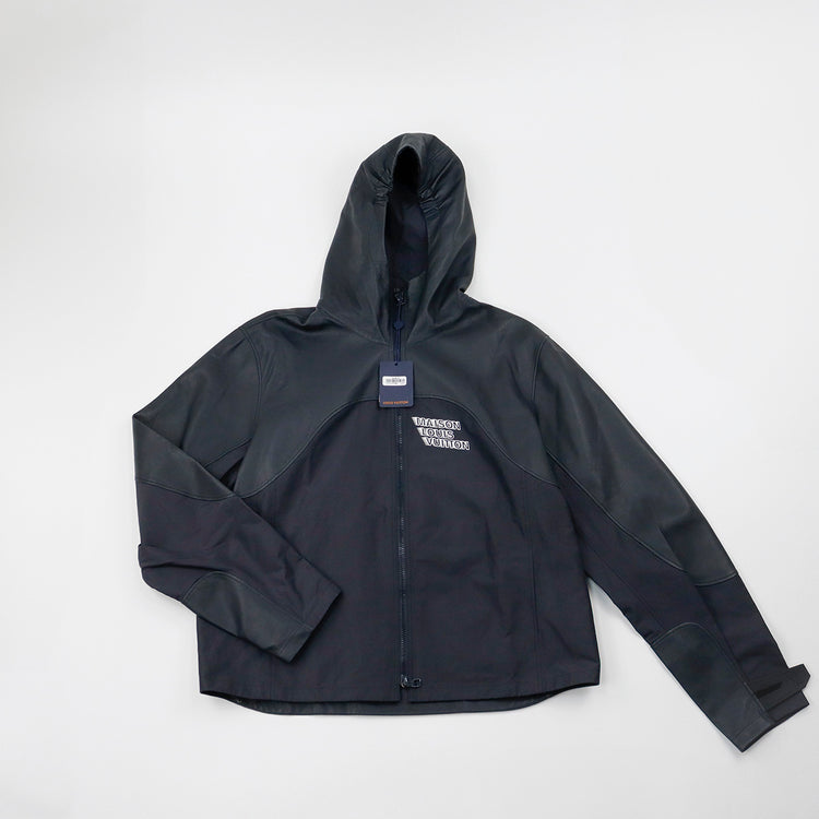 Chamarra tipo rompe vientos con capucha Louis Vuitton modelo 1A99V5, confeccionada en piel con nylon en color azul marino, ajuste de velcro en los puños, con estampado de la Maison LV en el pecho.
