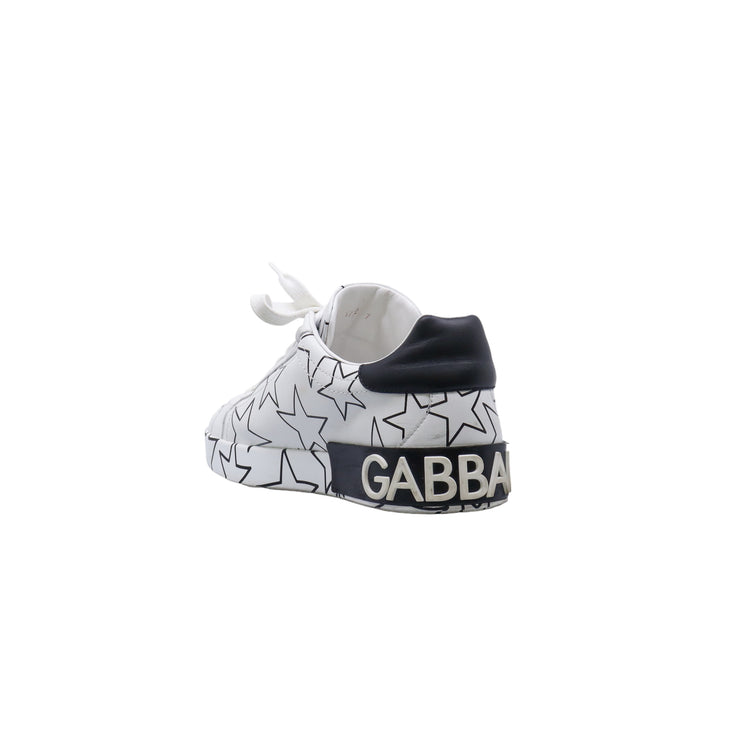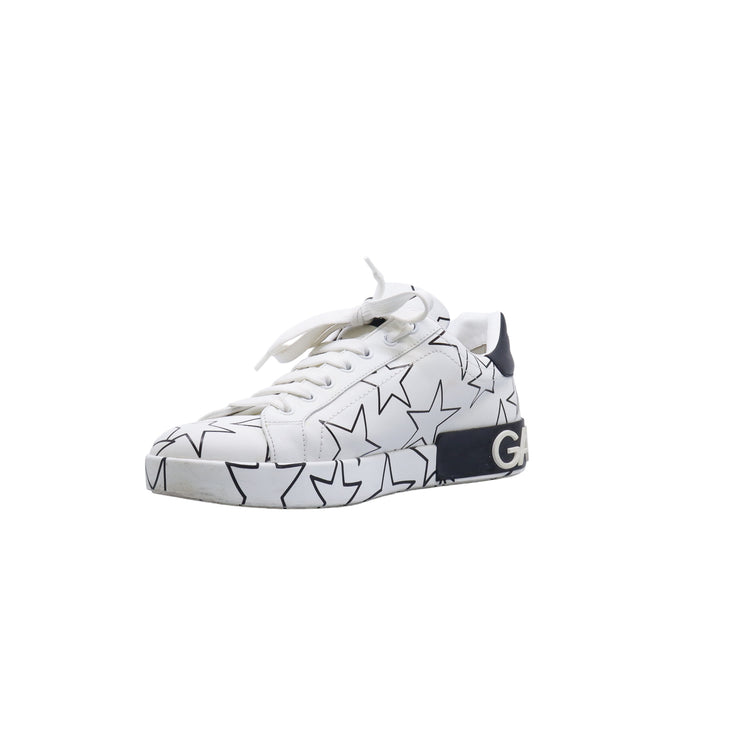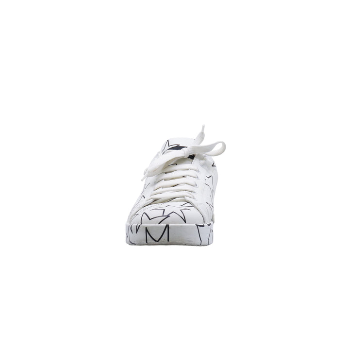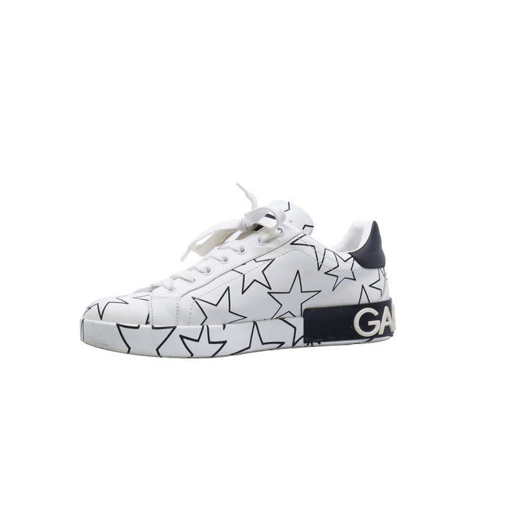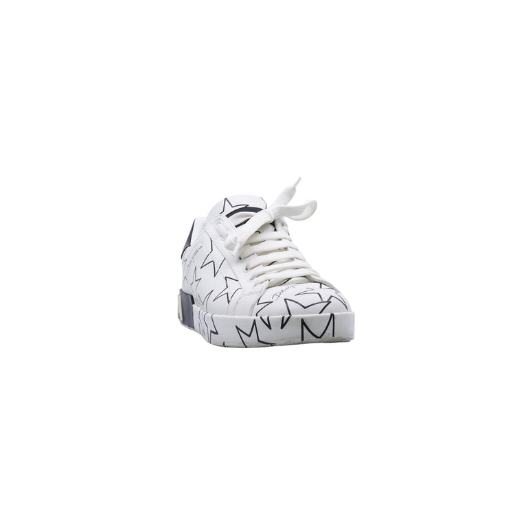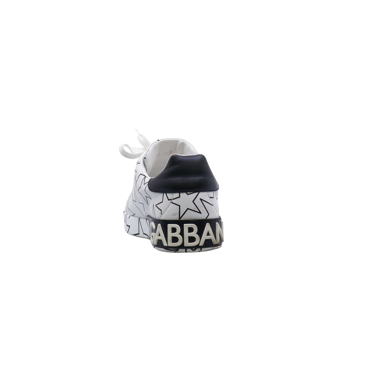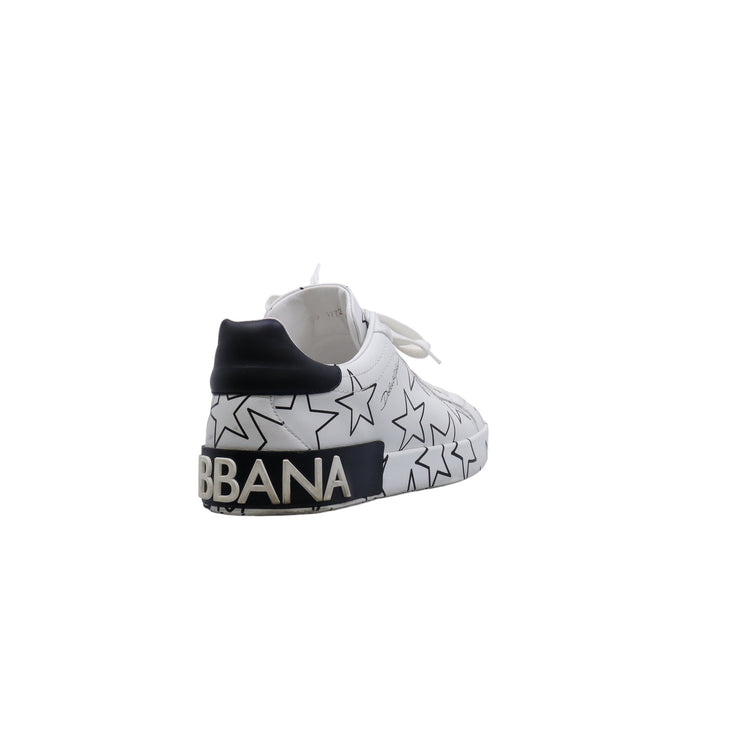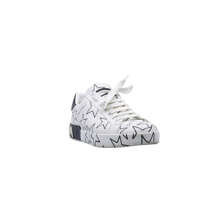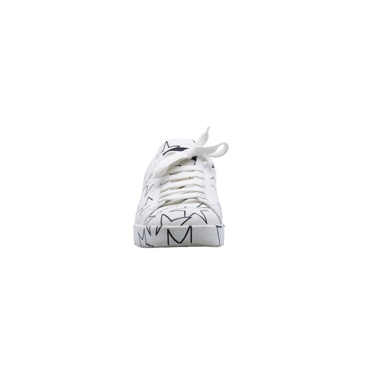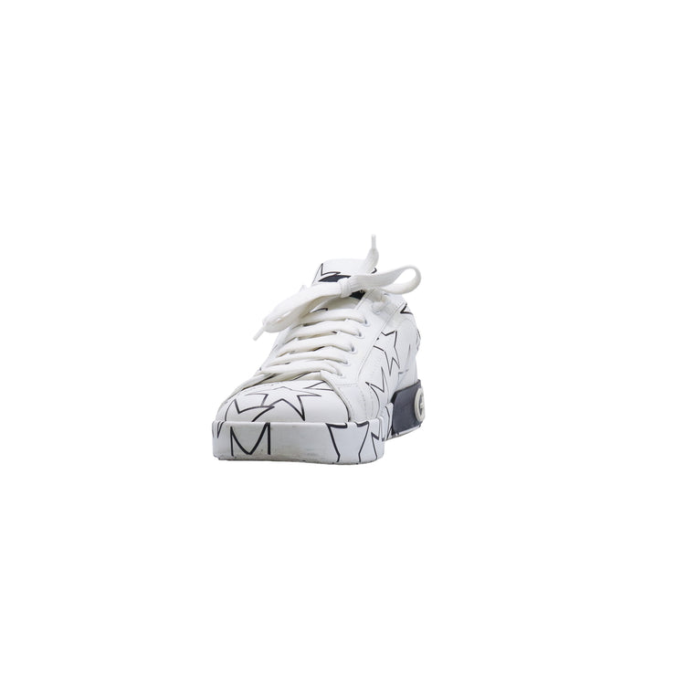 Sneakers Dolce & Gabbana de la línea Portofino, confeccionados en piel color blanco, con impresiones de estrellas en superficie, con ajuste elástico al empeine y base del talón en color negro con el grabado de la marca.