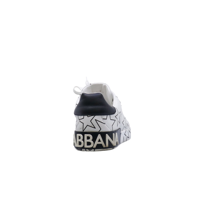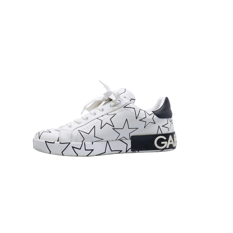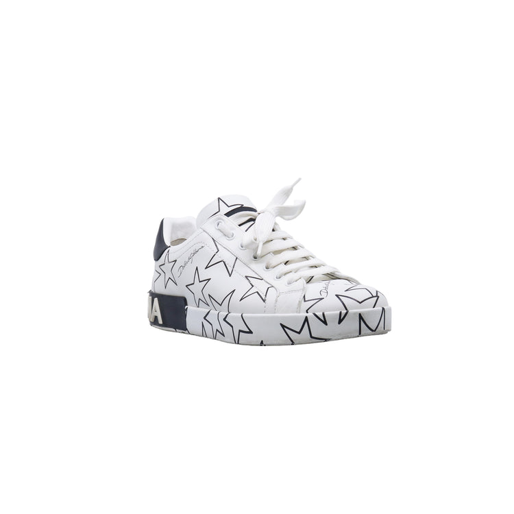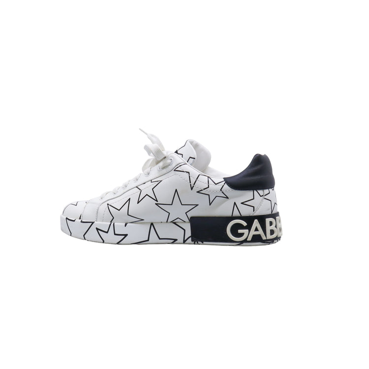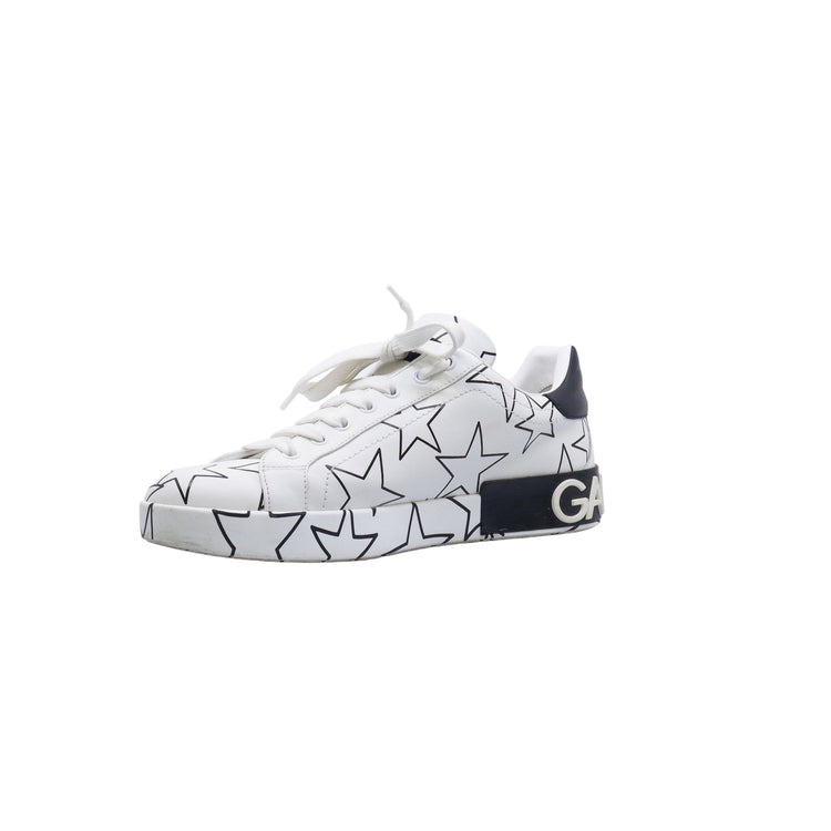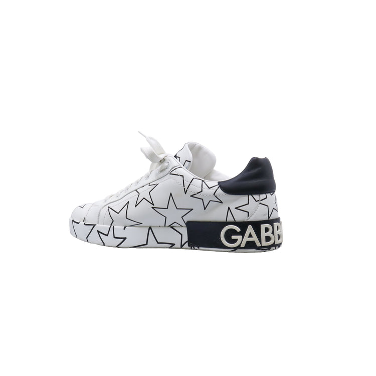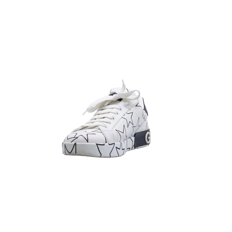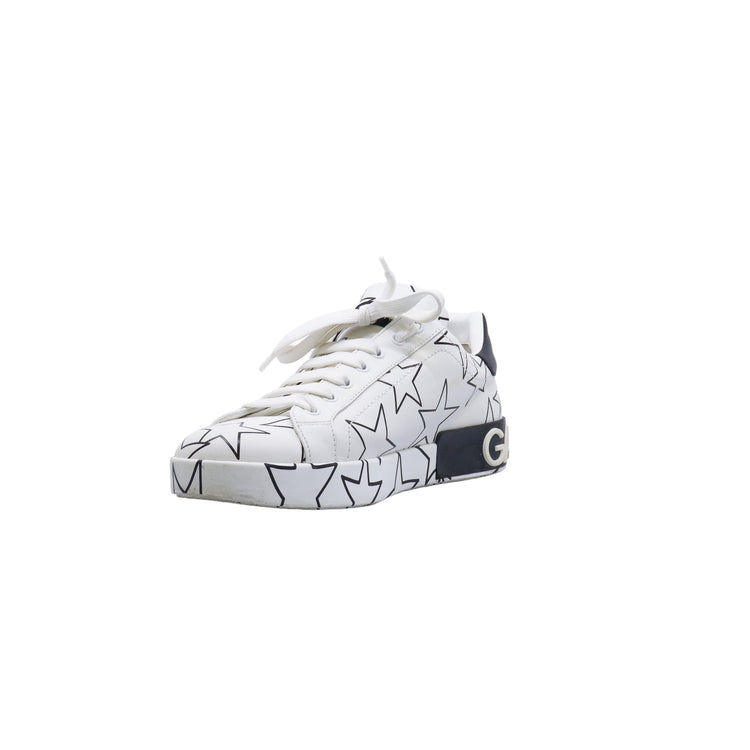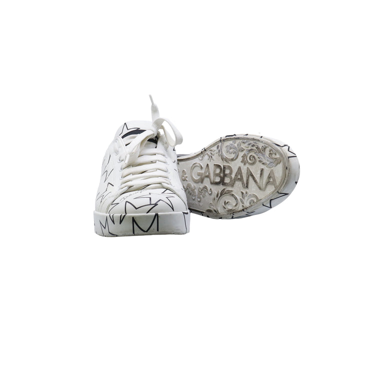 Sneakers Dolce & Gabbana de la línea Portofino, confeccionados en piel color blanco, con impresiones de estrellas en superficie, con ajuste elástico al empeine y base del talón en color negro con el grabado de la marca.