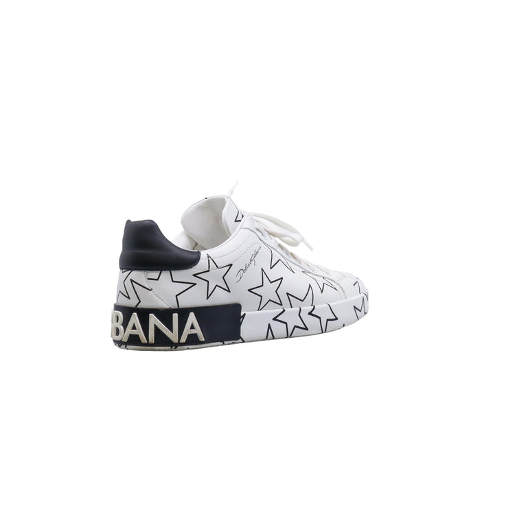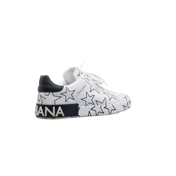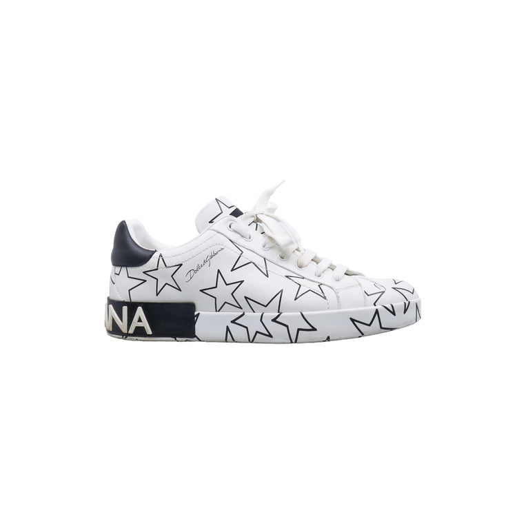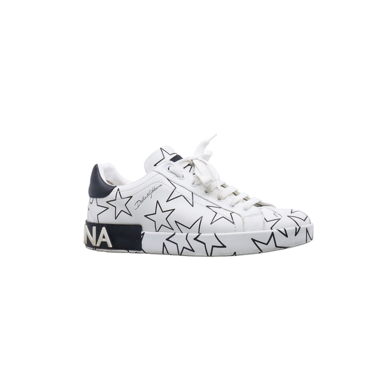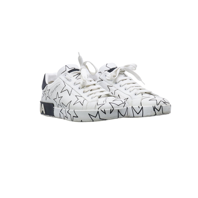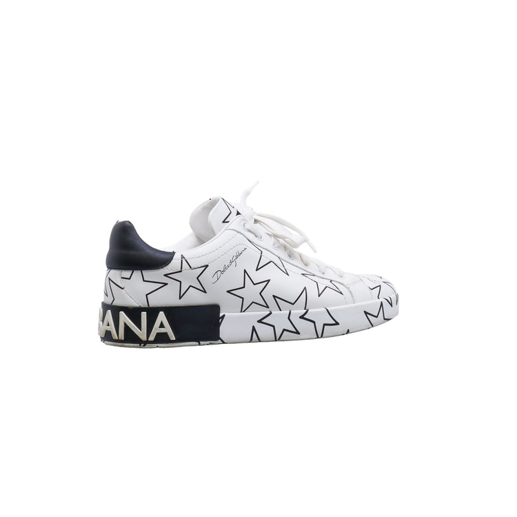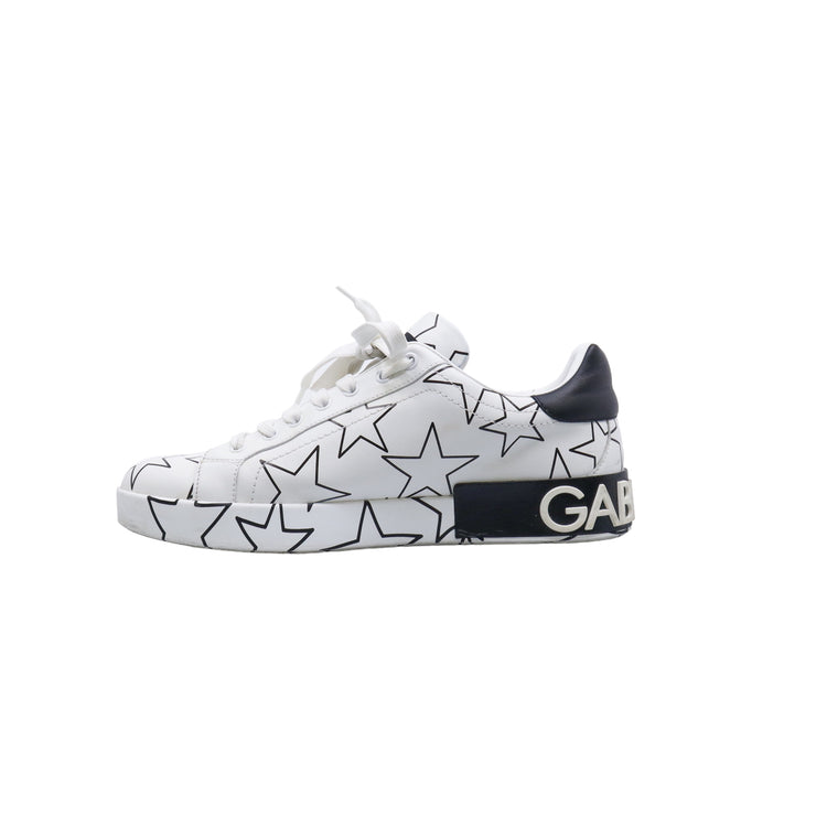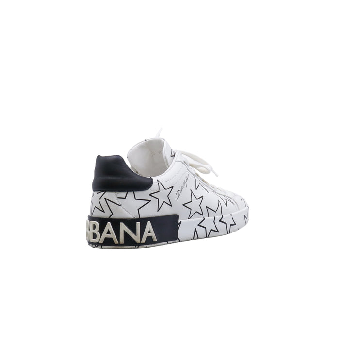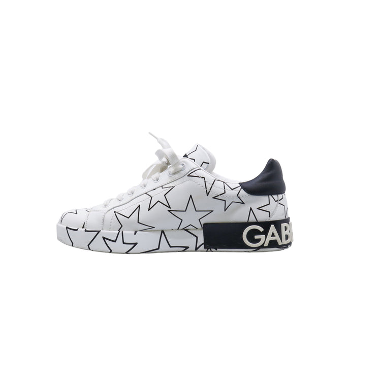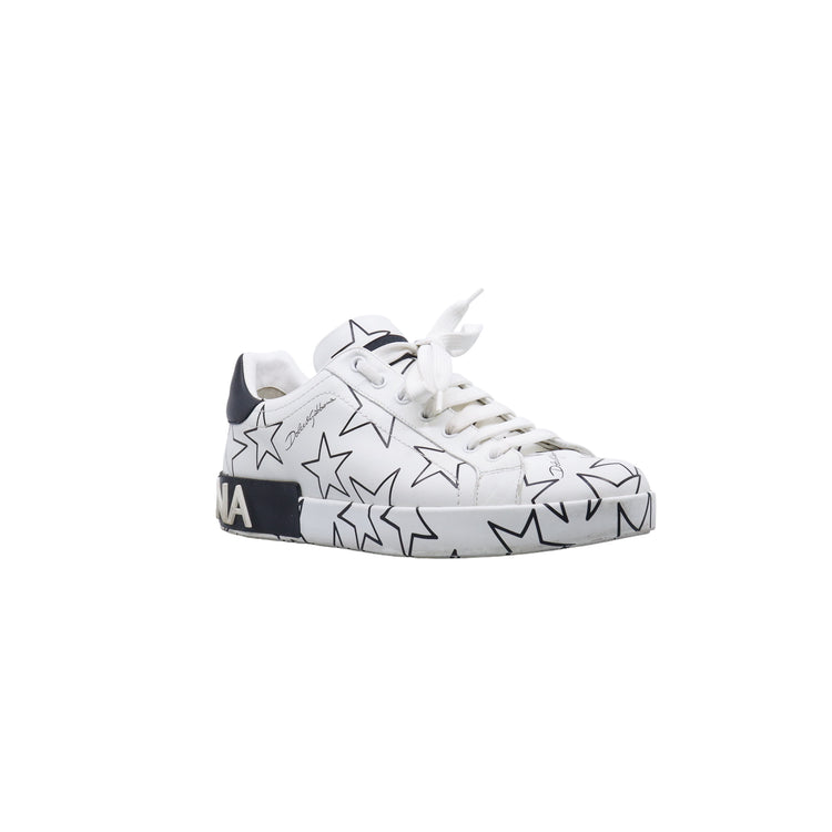 Sneakers Dolce & Gabbana de la línea Portofino, confeccionados en piel color blanco, con impresiones de estrellas en superficie, con ajuste elástico al empeine y base del talón en color negro con el grabado de la marca.